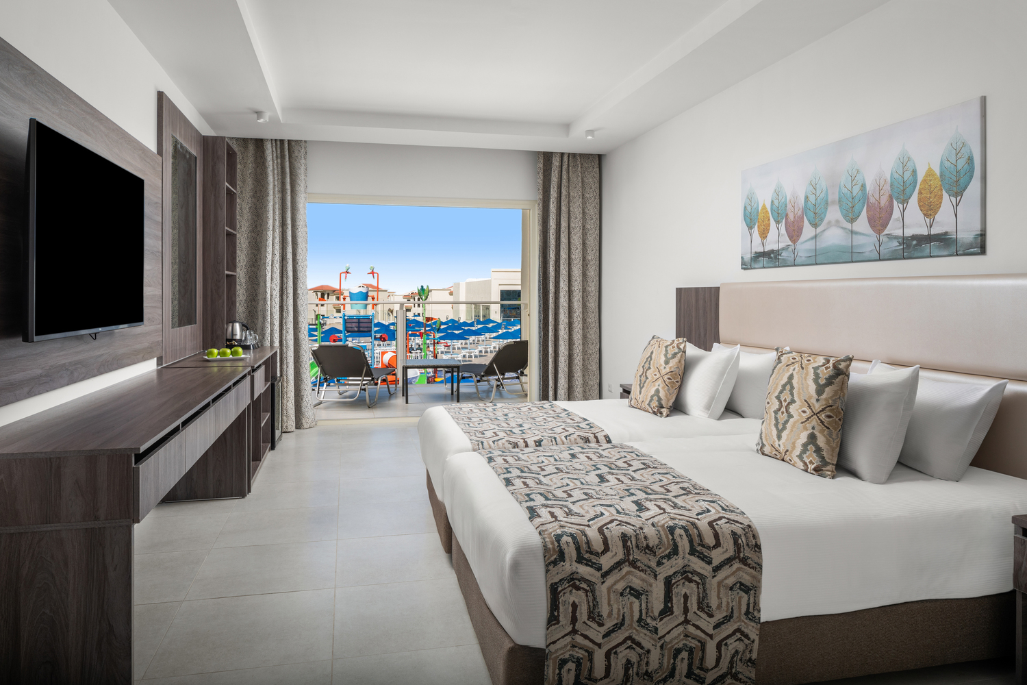 Расположение номера: Сторона аквапарка Вид из номера: Вид на аквапарк Покрытие пола: Плитка Наполнение мини-бара: Пополняется водой Уборка в номере: ежедневно Смена белья: по запросу 2 балкона, 2 ванные комнаты |