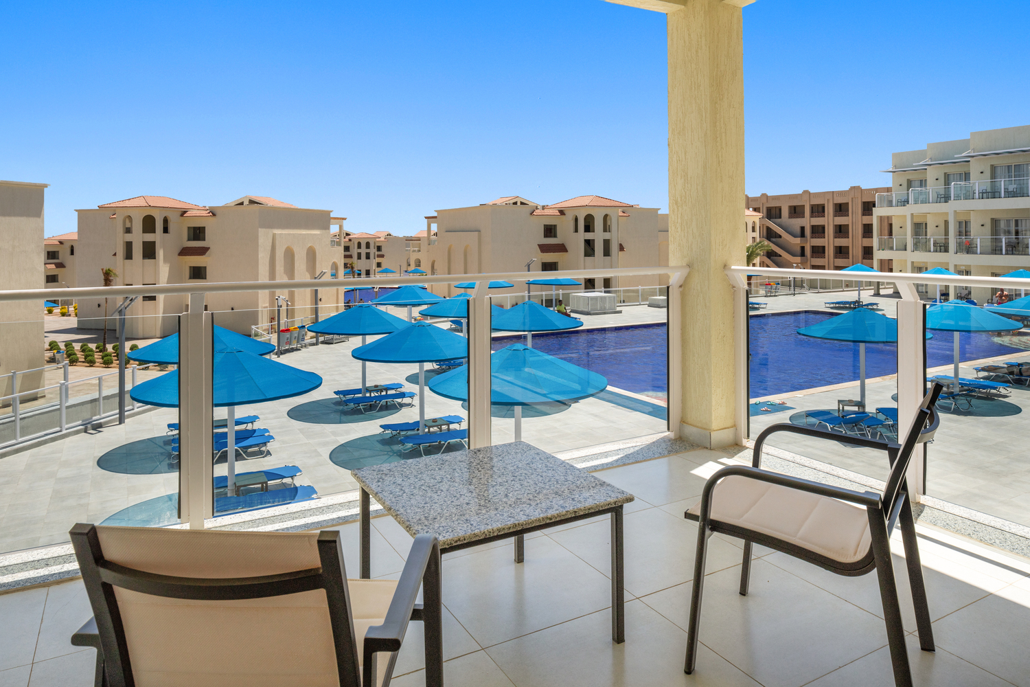 Вид из номера: на бассейн Покрытие пола: Плитка Наполнение мини-бара: Ежедневно пополняется водой Уборка в номере: Ежедневно Смена белья: По запросу балкон или терраса |