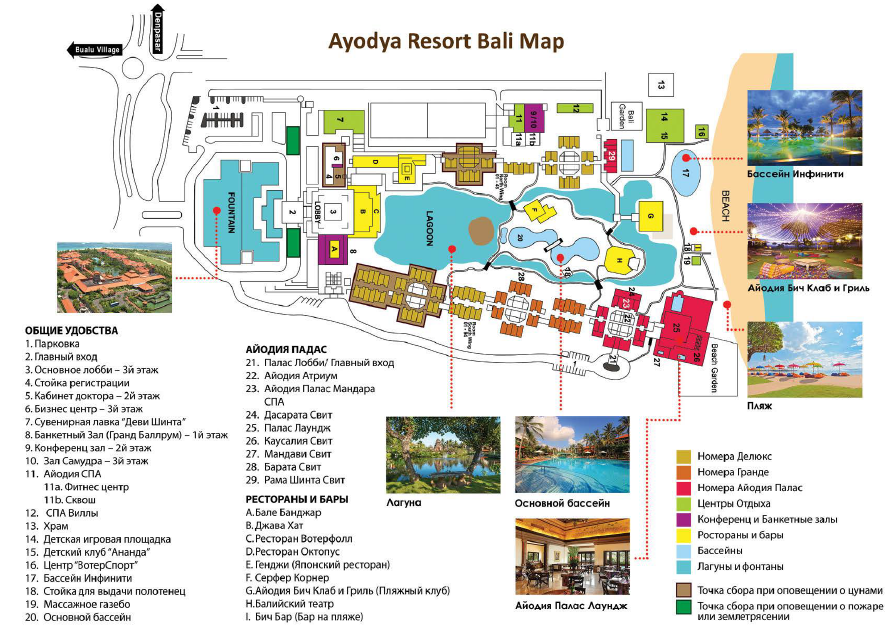 Отель Ayodya Resort Bali расположен на территории площадью 11,5 га с прекрасными бассейнами в форме лагуны, в охраняемом курортном комплексе закрытого типа Нуса Дуа. Отель находится всего в 12 километрах от аэропорта. Отель состоит из двух частей: Ayodya Resort и привилегированной Ayodya Palace. |