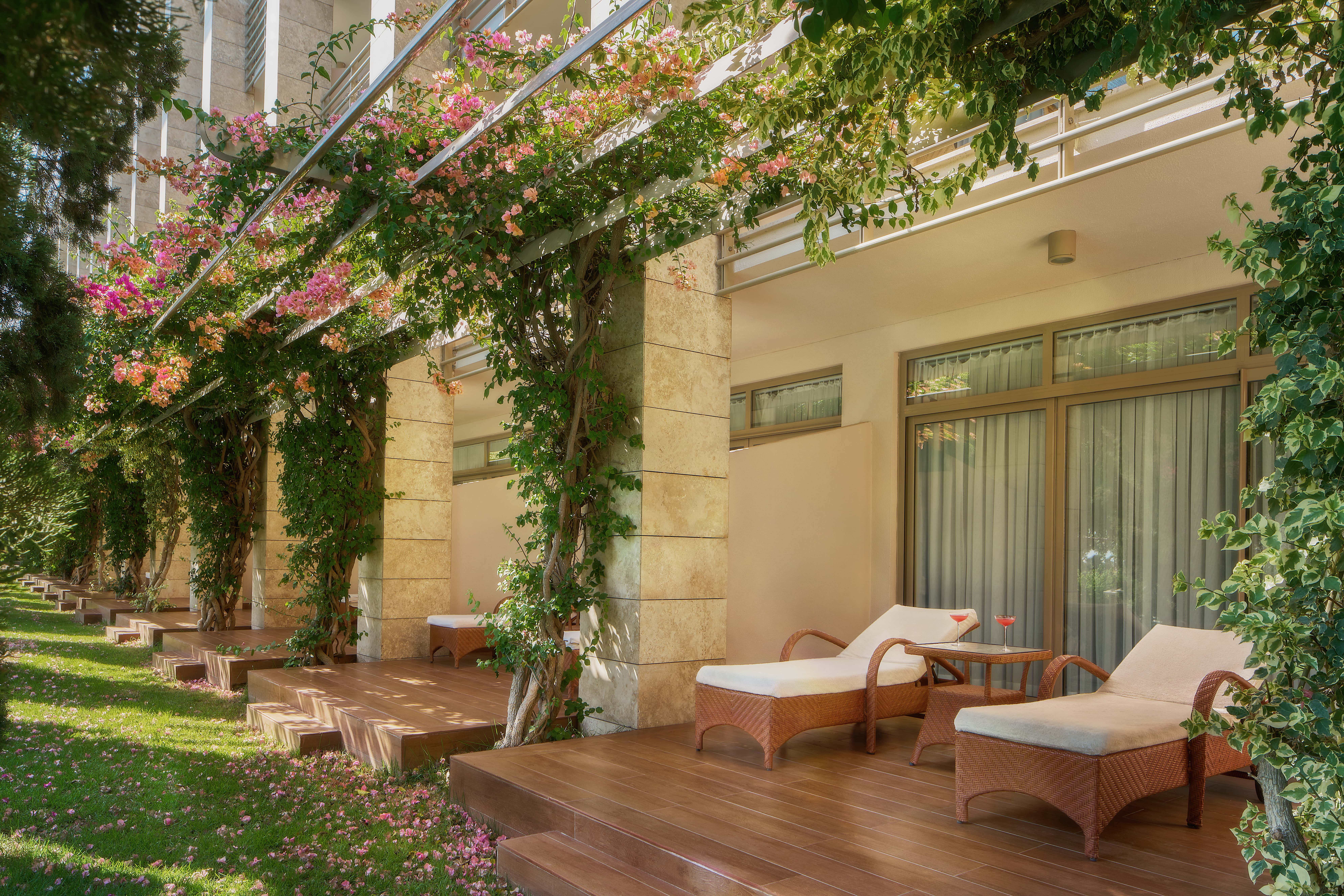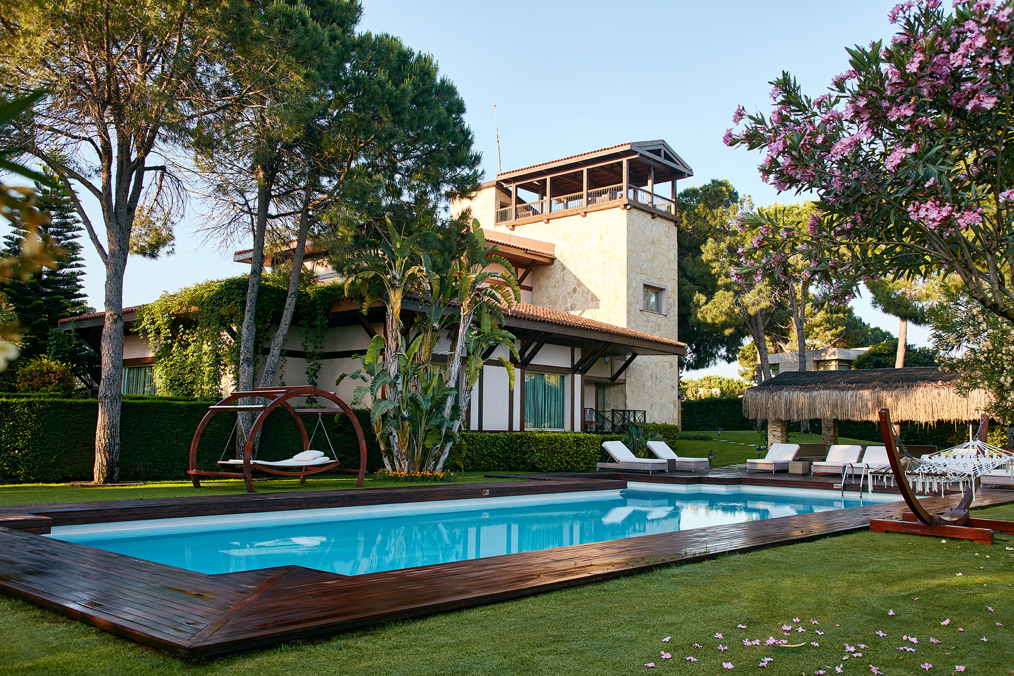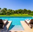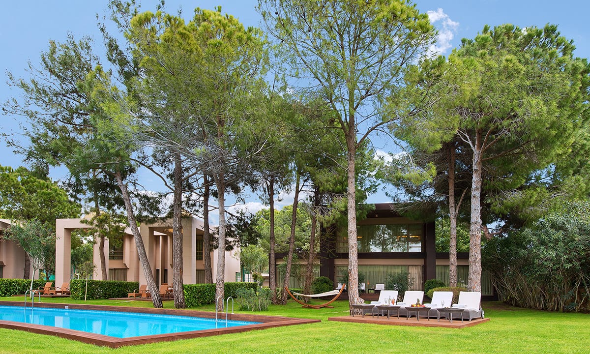 Вид из номера: на сад, поле для гольфа и частный бассейн