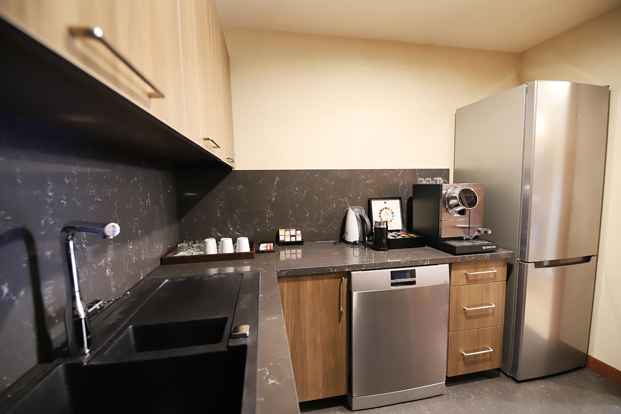 Оборудование кухни: кухонная зона с кофемашиной, электрическим чайником и раковиной