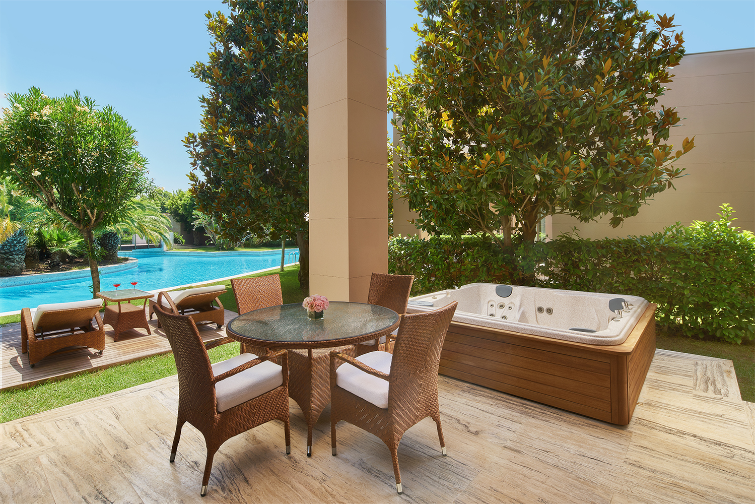 Расположение номера: вилла Вид из номера: на бассейн Джакузи: на террасе Покрытие пола: Плитка, Ламинат Наполнение мини-бара: Безалкогольные и алкогольные напитки. Пополняется ежедневно. Уборка в номере: ежедневно Смена белья: раз в два дня Дополнительные услуги: кофемашина Nespresso Двухэтажная вилла. <br /> Гостиная: барный уголок, обеденный стол и стулья. 2 ванные комнаты. <br /> Джакузи, шезлонги, стол и стулья на террасе. Прямой доступ к общему бассейну. <br /> Glorian Guest Service Agent.<br /> Возможность бесплатно пользоваться главными ресторанами, снэк-ресторанами и барами трех отелей Gloria Hotels & Resorts (кроме A la Carte ресторанов). |