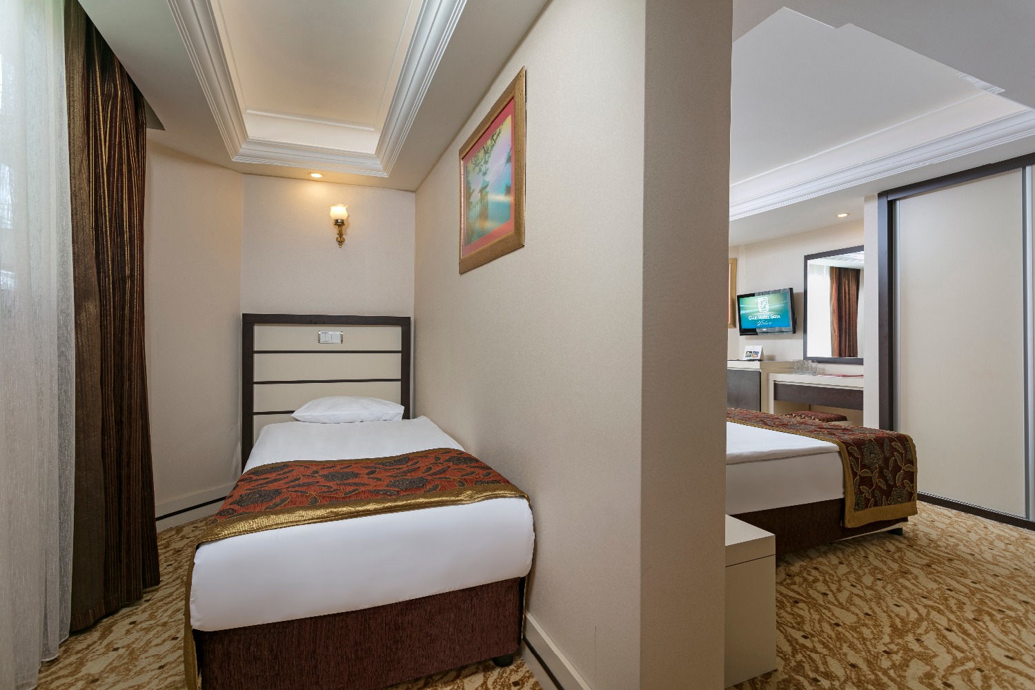 Расположение номера: в Park Sera (здание Аннекс, дальнее от моря) Вид из номера: на сад Покрытие пола: Ламинат Наполнение мини-бара: Прохладительные напитки. Пополняется ежедневно. Уборка в номере: ежедневно Балкон или терраса. Есть номера с 1 двуспальной или 2 односпальными кроватями. 1 ванная комната. Центральный кондиционер работает в зависимости от погодных условий. Последняя реновация в номерах была произведена в 2020 году (замена ванны на душ и замена напольного покрытия).<br /> На фото - один из вариантов номера. |