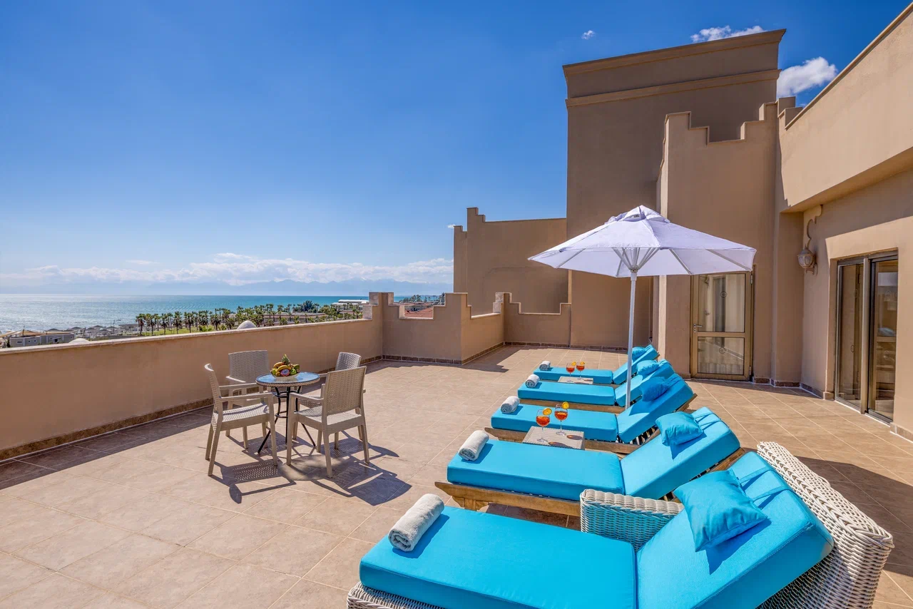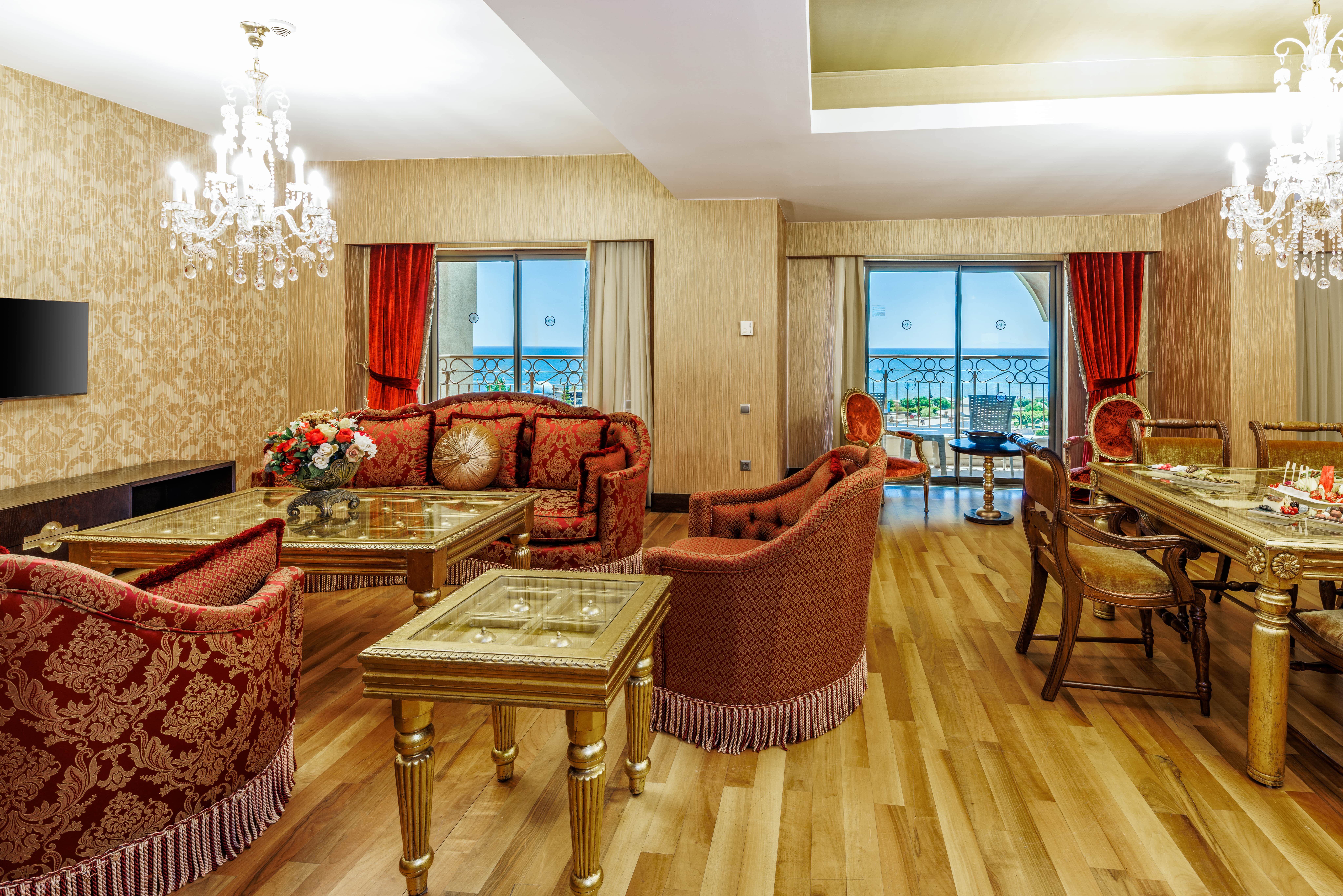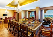Расположение номера: в основном здании Вид из номера: на море Джакузи: в ванной комнате Покрытие пола: Ковролин, Ламинат Наполнение мини-бара: вода, прохладительные напитки, пиво. Пополняется ежедневно. Уборка в номере: ежедневно Смена белья: раз в три дня Номер состоит из просторного коридора с зеркальной уборной, гостиной с мягкой мебелью и столовой с обеденным столом на 6 персон, двух спален, двух ванных комнат с джакузи.<br /> VIP концепция:<br /> - Индивидуальный VIP трансфер<br /> - Экспресс Check-in в номере<br /> - VIP ресторан Defne (завтрак, обед и ужин)<br /> - 4 ресторана a’la carte и обслуживание в номерах (стандартное меню)<br /> - Отдельная VIP зона на пляже <br /> - павильон на пляже (бесплатное пользование - 1 день)<br /> - расширенный ассортимент мини-бара<br /> - бутылка вина и корзина с фруктами при заезде<br /> - Поздний выезд до 15:00 (по возможности) |