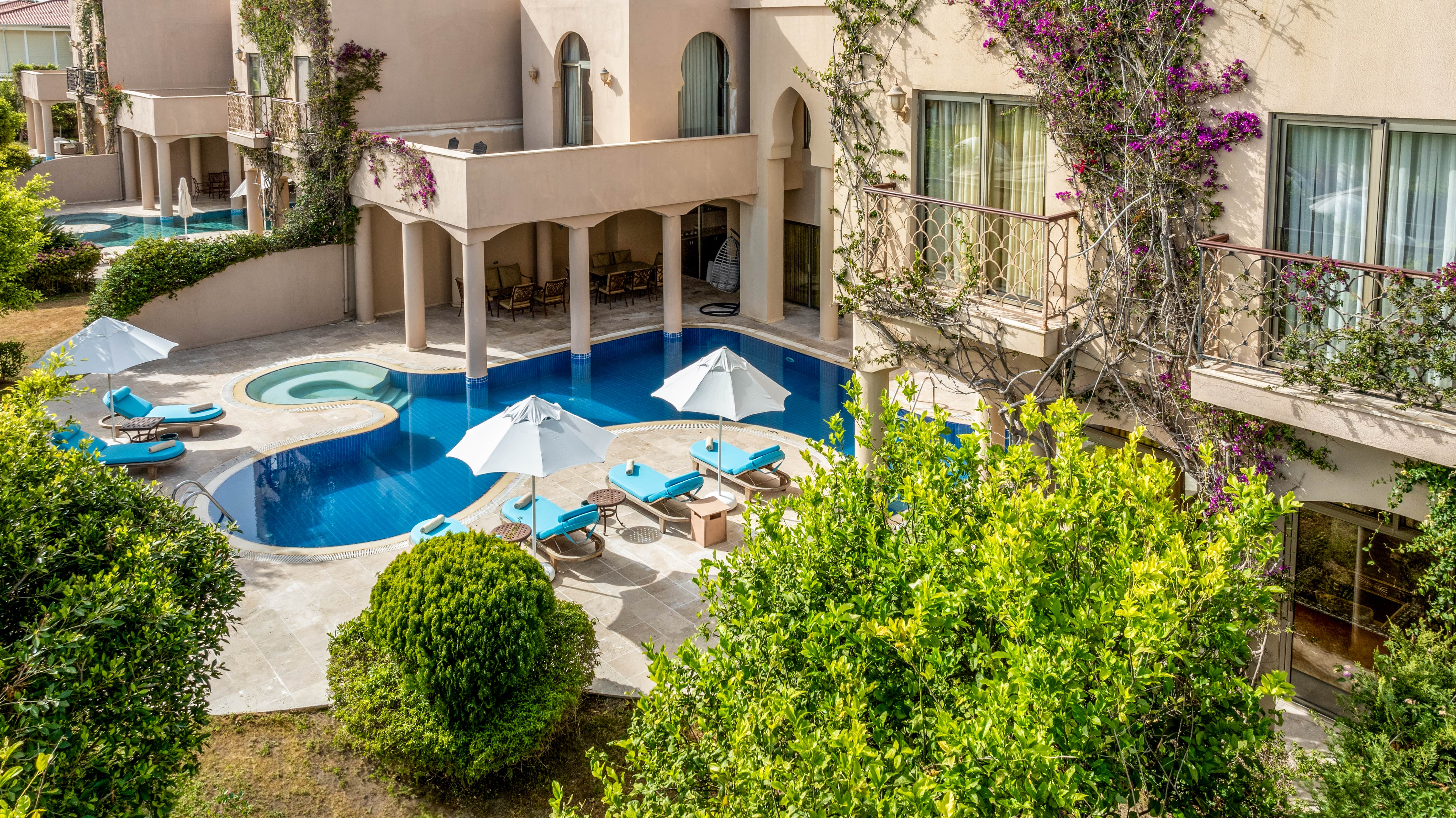 Комментарии: Каждая из 6 двухэтажных вилл, с собственным бассейном и летним индивидуальным двориком, декорированном в традиционном восточном стиле, расположена в отдельном здании в саду. <br /> На нижнем этаже: гостиная с мягкой мебелью, мини-кухня, ванная комната; на верхнем этаже: две спальни, две ванные комнаты (одна с джакузи). На пляже свой собственный павильон.<br /> <br /> VIP концепция:<br /> - Индивидуальный VIP трансфер<br /> - Экспресс Check-in в номере<br /> - VIP ресторан Defne (завтрак, обед и ужин) <br /> - рестораны a’la carte и обслуживание в номерах<br /> - Отдельная VIP зона на пляже с павильонами<br /> - При заезде - экзотические фрукты, вино <br /> - VIP мини-бар<br /> - По возможности - поздний выезд (до 15:00)
