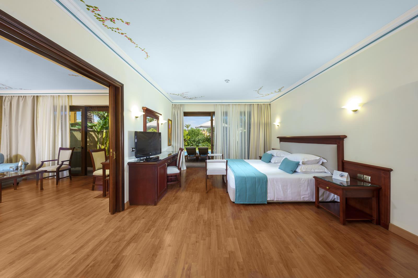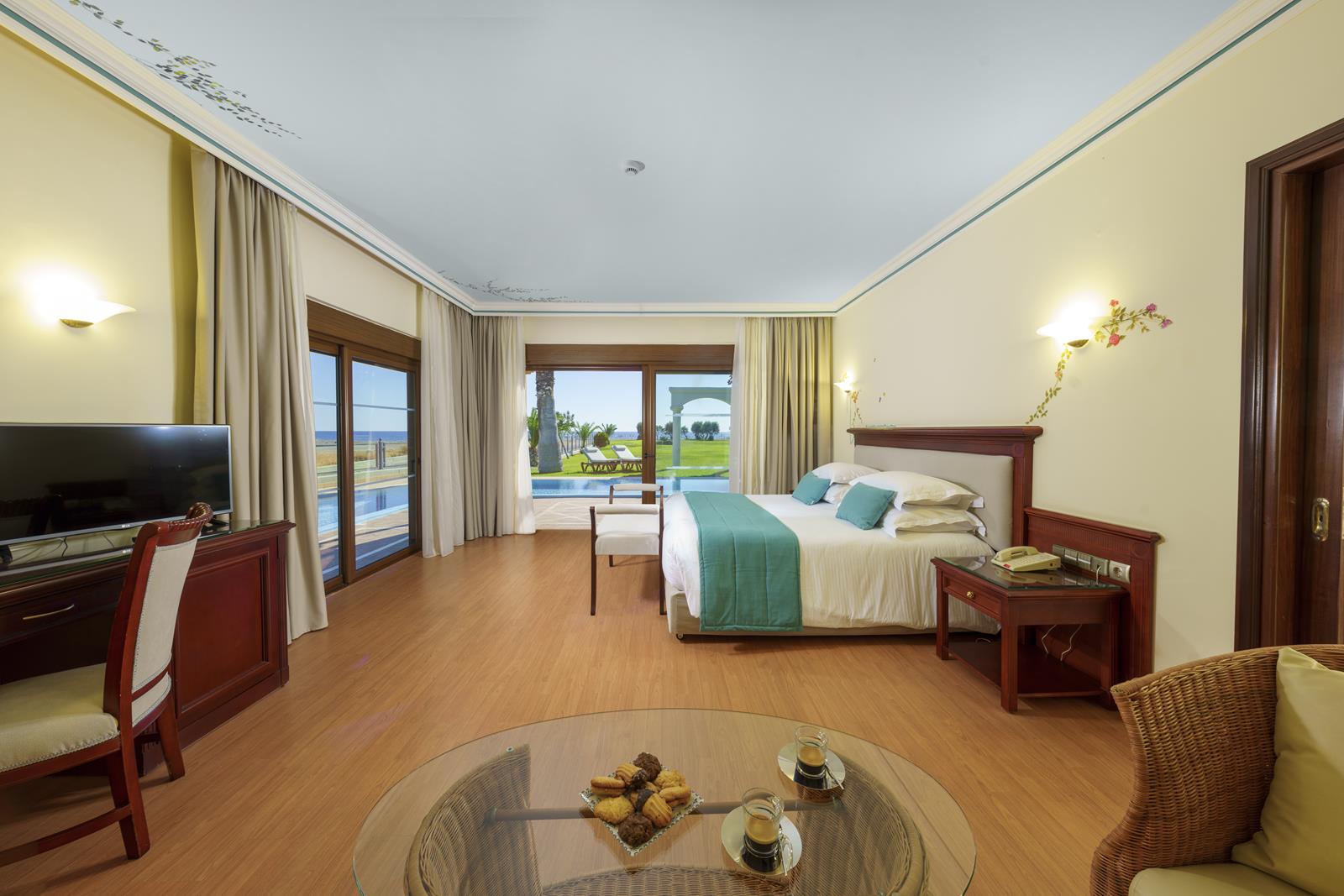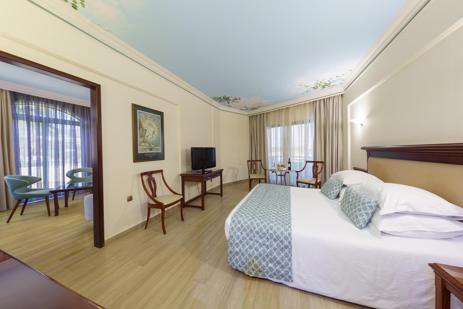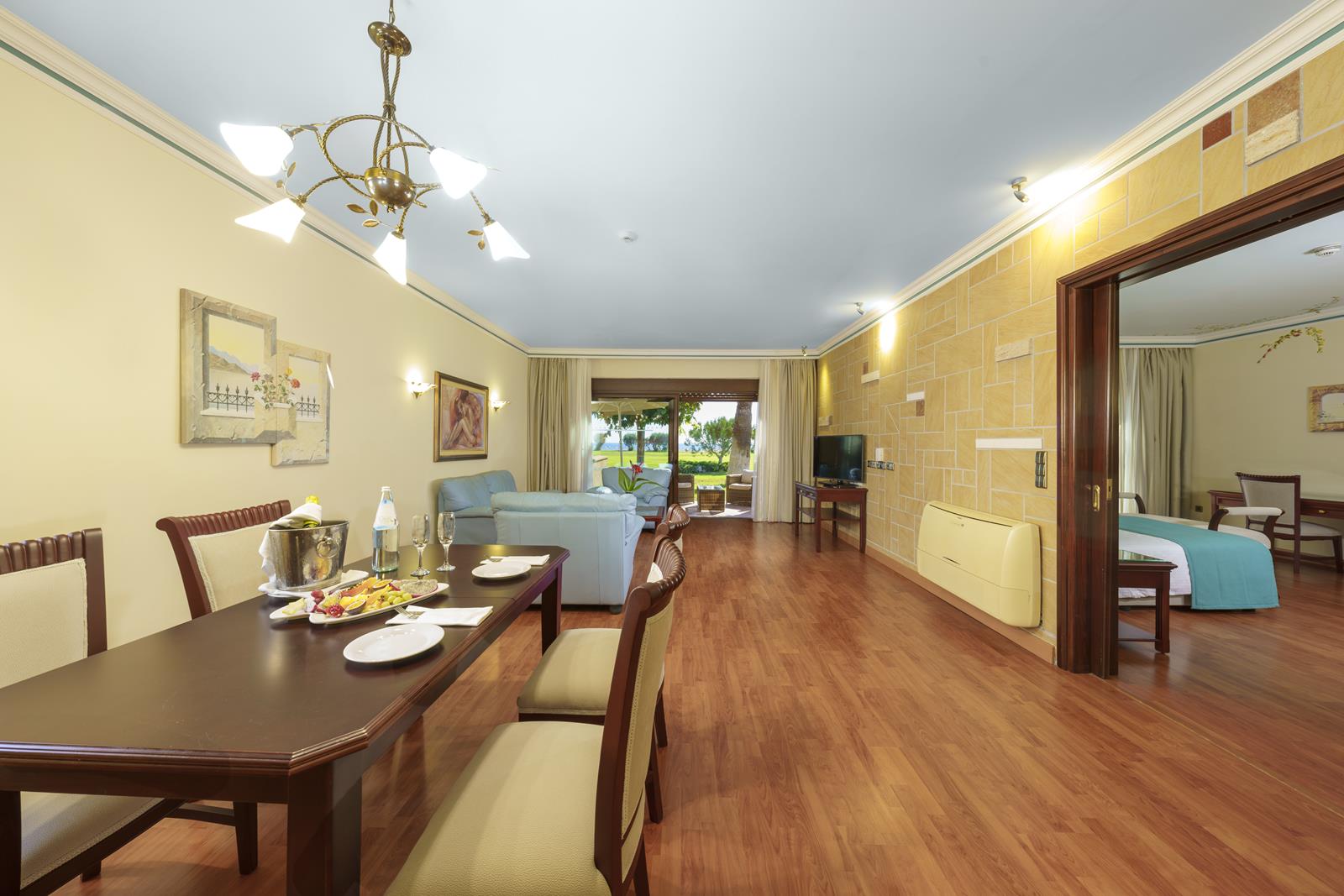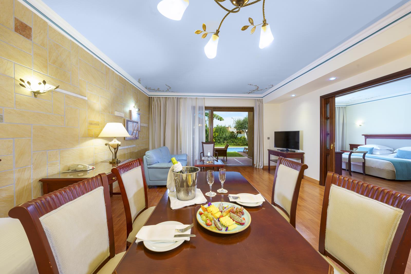 Комментарии: Отдельные спальная комната и салон/спальная комната без межкомнатных дверей, команты разделены небольшим коридором. Ванна с гидромассажем. В номере: фен, индивидуальный кондиционер (май-октябрь), спутниковое телевидение, мини-бар (платно), сейф, прямой телефон (платно), WiFi (бесплатно), банные халаты и тапочки, прибор для приготовления кофе/чая, балкон или терраса. Для гостей номеров: вода, греческое вино, фрукты, по заезду. Смена белья и уборка номера - ежедневно.