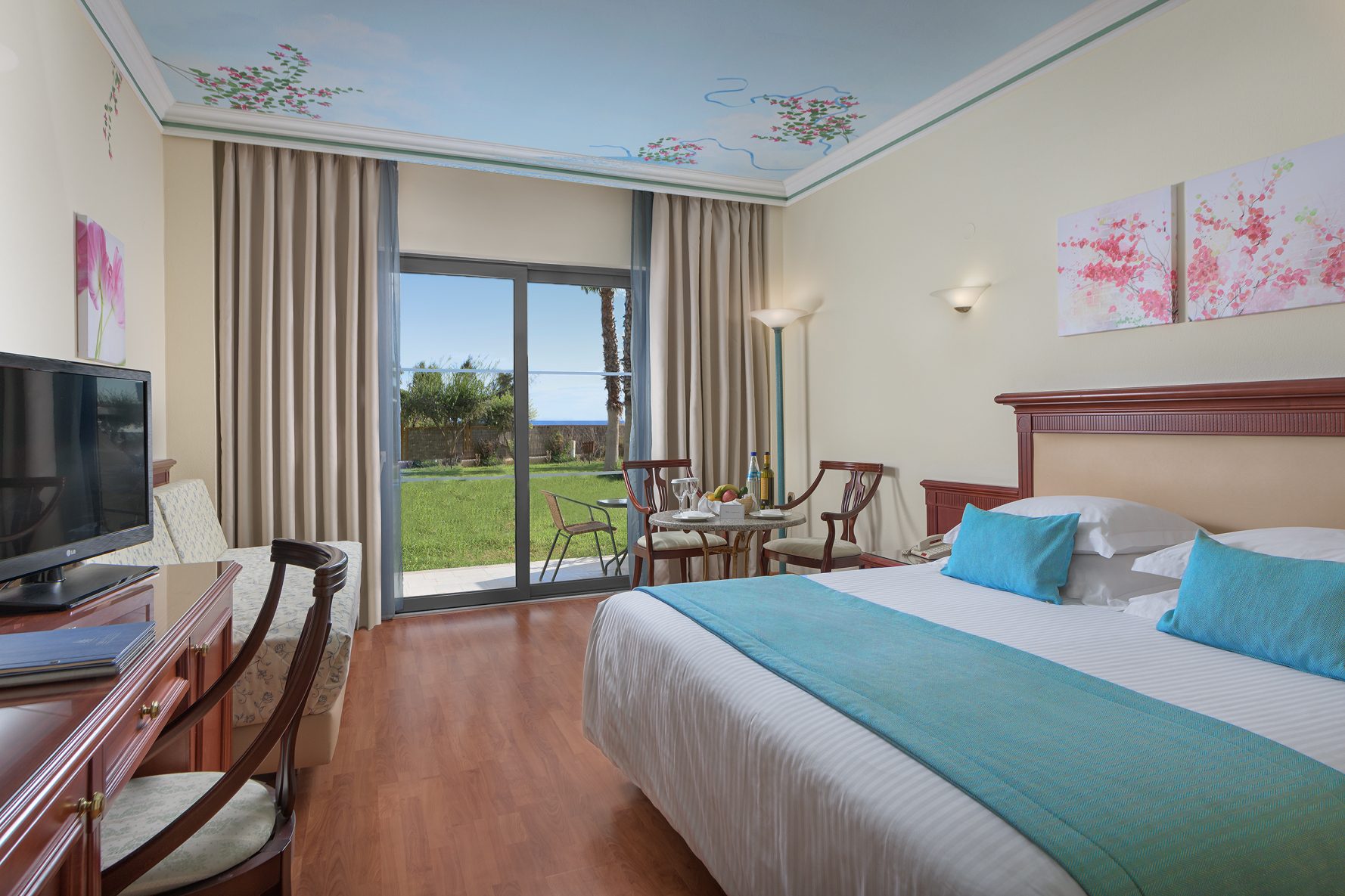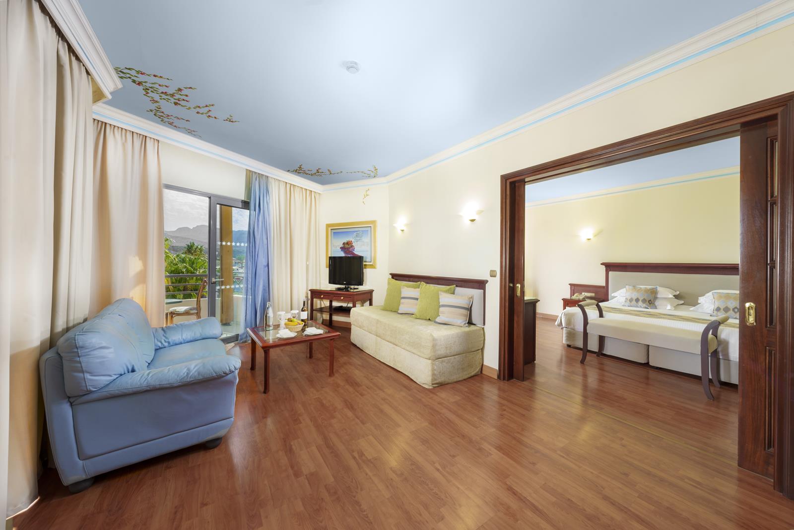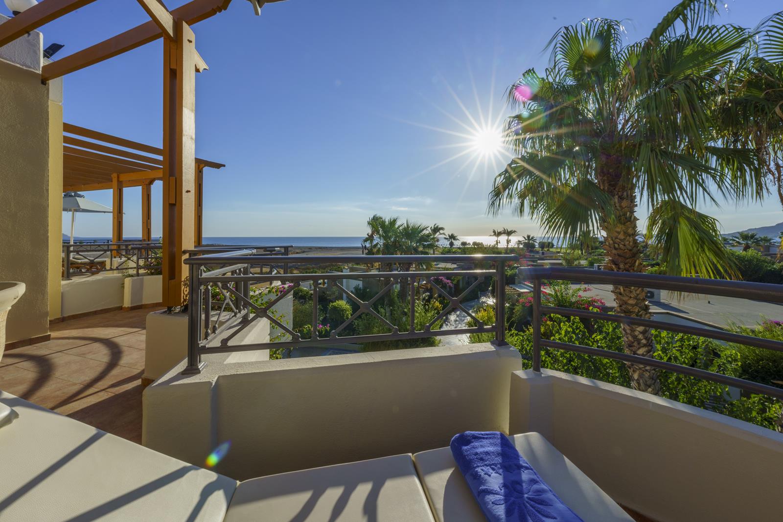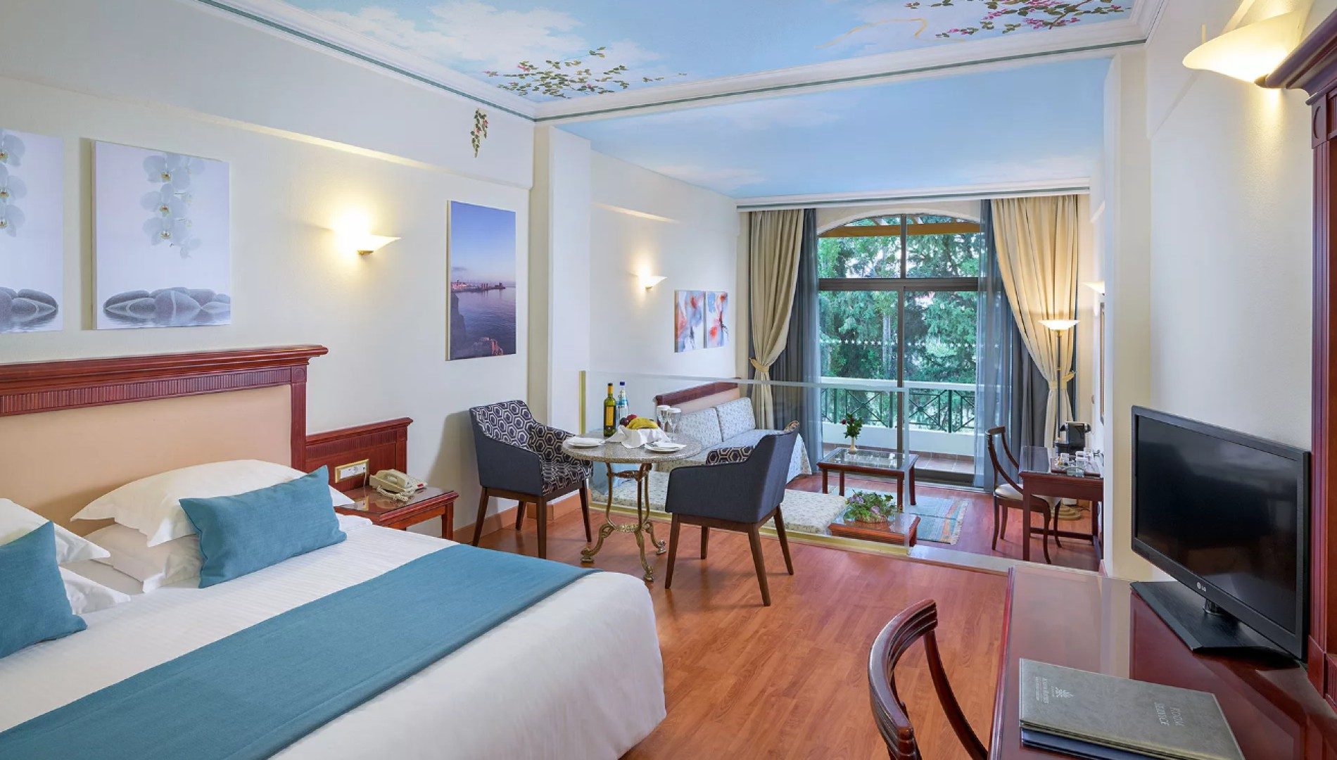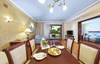 Комментарии: Отдельные спальная комната и салон/спальная комната без межкомнатных дверей, команты разделены небольшим коридором. Ванна с гидромассажем. В номере: фен, индивидуальный кондиционер (май-октябрь), спутниковое телевидение, мини-бар (платно), сейф, прямой телефон (платно), WiFi (бесплатно), банные халаты и тапочки, прибор для приготовления кофе/чая, балкон или терраса. Для гостей номеров: вода, греческое вино, фрукты, по заезду. Смена белья и уборка номера - ежедневно.
