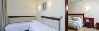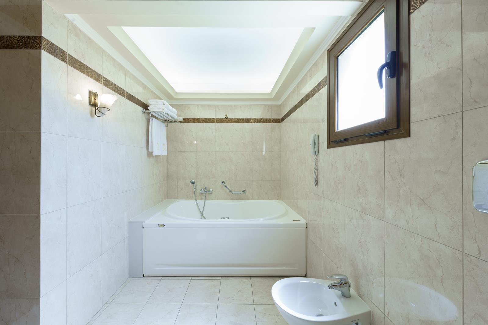 Покрытие пола: Плитка, Ламинат Отдельные спальная комната и салон/спальная комната без межкомнатных дверей, команты разделены небольшим коридором. Ванна с гидромассажем. В номере: фен, индивидуальный кондиционер (май-октябрь), спутниковое телевидение, мини-бар (платно), сейф, прямой телефон (платно), WiFi (бесплатно), банные халаты и тапочки, прибор для приготовления кофе/чая, балкон или терраса. Для гостей номеров: вода, греческое вино, фрукты, по заезду. Смена белья и уборка номера - ежедневно. |