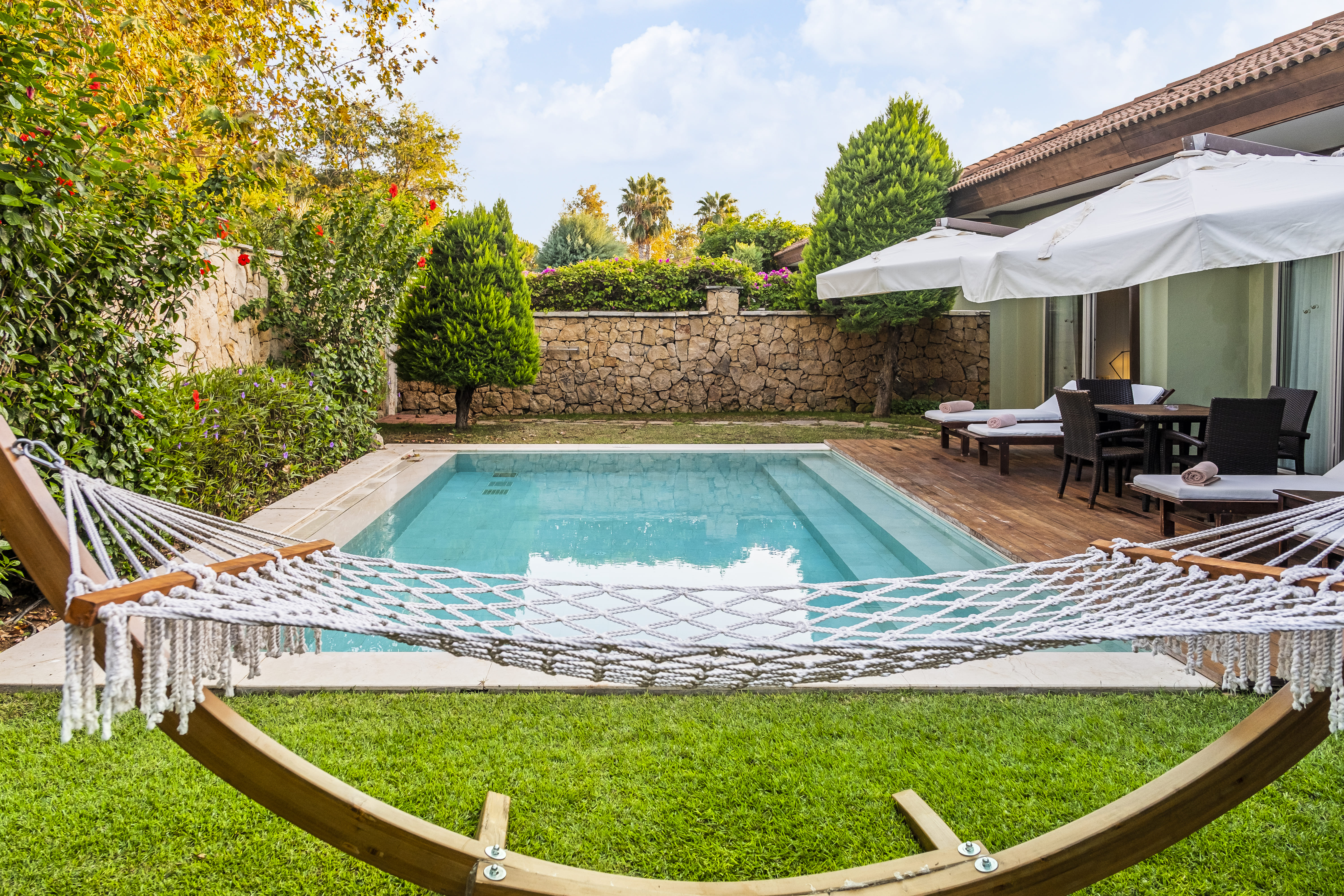 Расположение номера: вилла находится в 200 м от пляжа Вид из номера: на бассейн/на сад Покрытие пола: Плитка Наполнение мини-бара: Безалкогольные и алкогольные напитки. Пополняется ежедневно. Уборка в номере: ежедневно Смена белья: три раза в неделю Терраса под навесом. Огражденный приватный сад, бассейн (24 кв.м.). Шезлонги, зонт. <br /> ВИП-концепт:<br /> - встреча с шампанским и угощениями и сопровождение в номер.<br /> - расширенный мини-бар (импортные алкогольные напитки 0,7 л).<br /> - в номере вино, фрукты, орешки, чипсы.<br /> - в номере свежие цветы.<br /> - приготовление номера ко сну.<br /> - пляжные полотенца.<br /> - услуги прачечной включены в стоимость (услуги химчистки не включены).<br /> - 1 павильон на пляже. <br /> - бесплатная резервация а ла карт ресторанов (oдин paз в тeчeниe oтдыxa) |