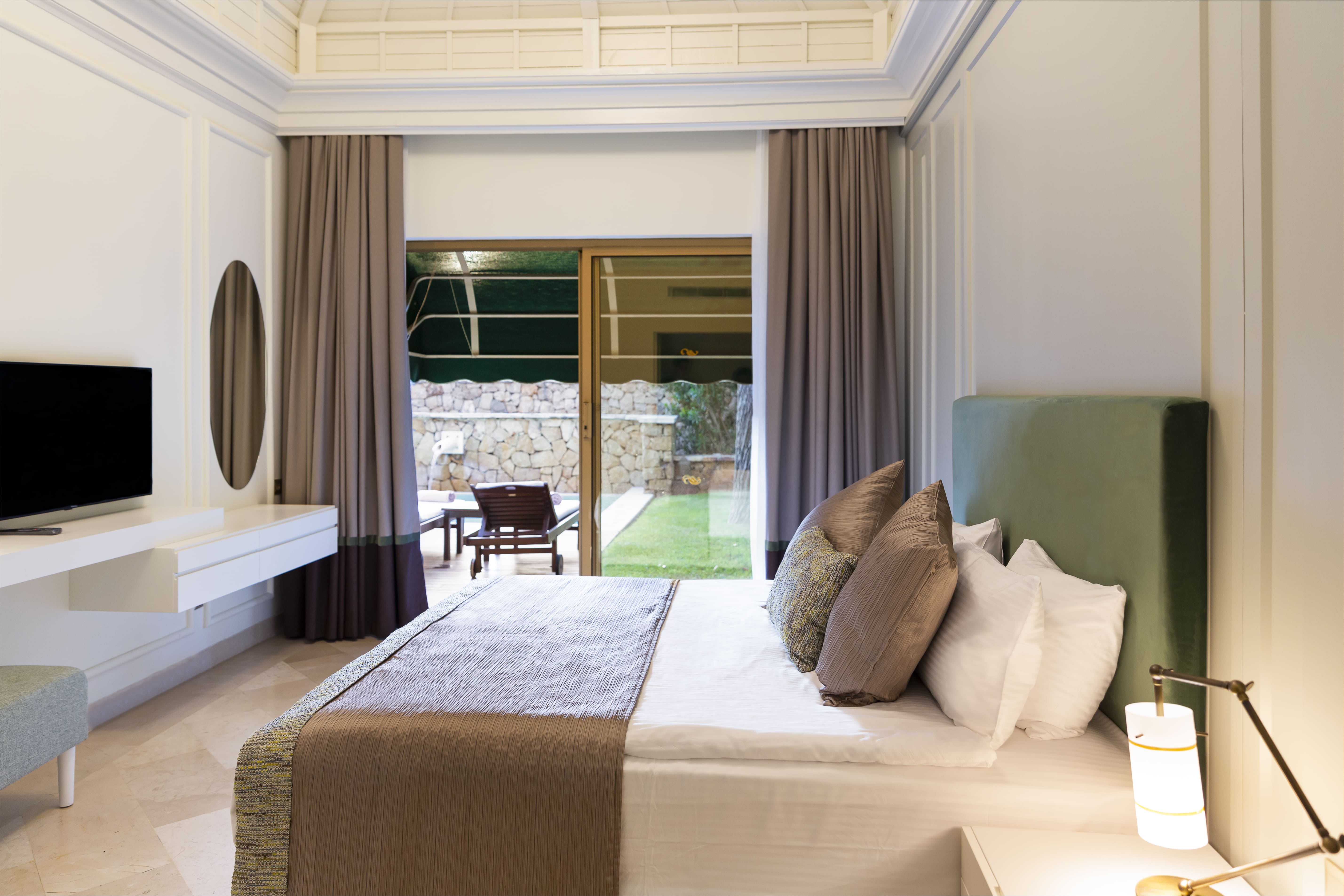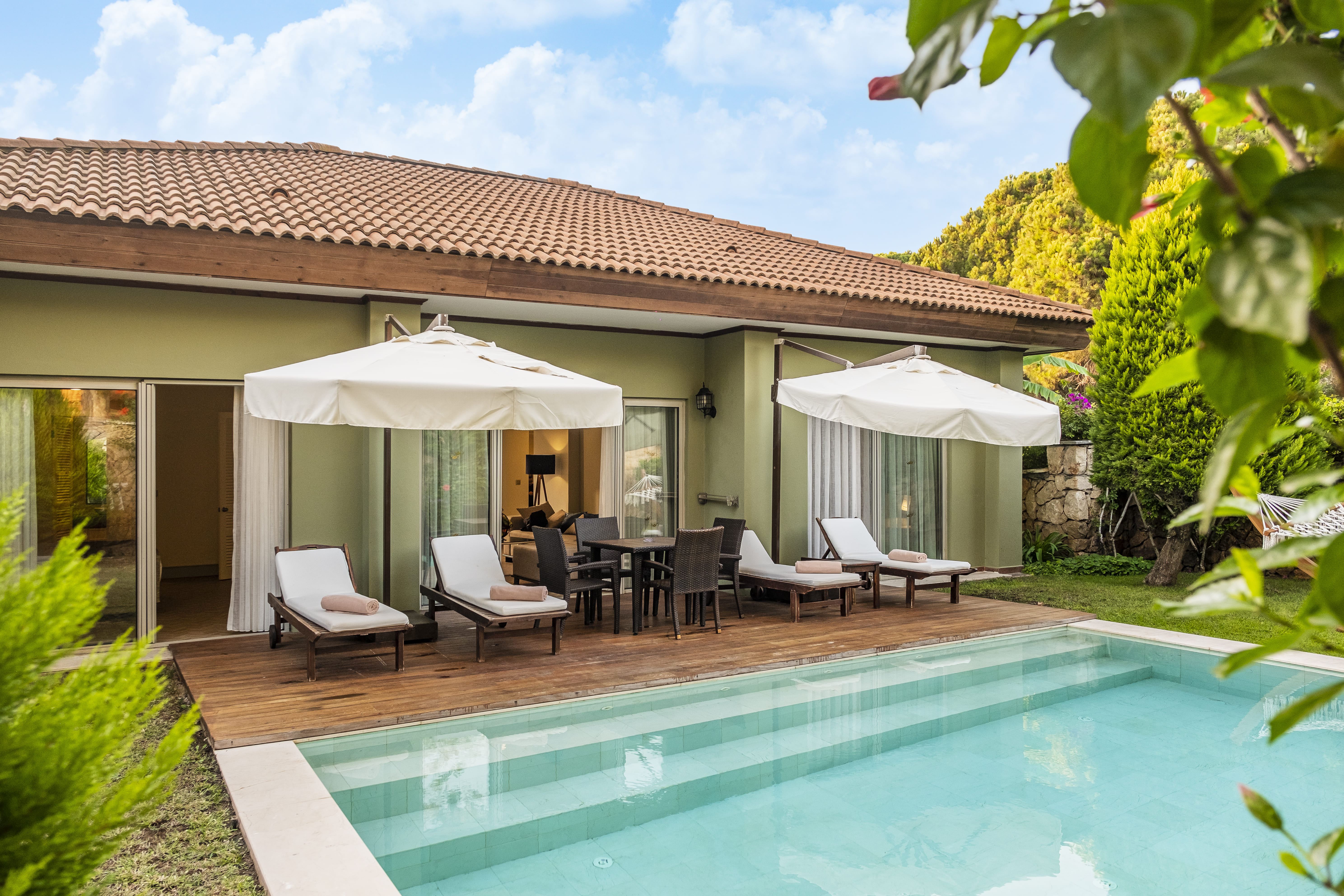 Расположение номера: на 1-м или на 2-м этаже Вид из номера: на бассейн/на сад Наполнение мини-бара: Безалкогольные и алкогольные напитки. Пополняется ежедневно. Уборка в номере: ежедневно Смена белья: три раза в неделю Отдельный выход к бассейну (общий бассейн на несколько номеров). <br /> Шезлонг, зонт. 2 ванные комнаты.<br /> Номера реновированы в 2020 г.<br /> ВИП-концепт:<br /> - встреча с шампанским и угощениями и сопровождение в номер.<br /> - расширенный мини-бар (импортные алкогольные напитки 0,05 л).<br /> - в номере свежие цветы.<br /> - пляжные полотенца.<br /> - скидка на услуги прачечной 50 % (услуги химчистки – не включены)<br /> - бесплатная резервация а ла карт ресторанов - один раз (кроме Blue Fish, Red Steak&Wine и Wabi Teppanyaki). |