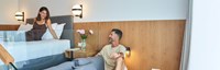 Уборка в номере: Ежедневно Смена белья: 3 раза в неделю две односпальные кровати и элегантную мраморную ванную комнату с тропическим душем, а также кафельный/частично паркетный пол, 40-дюймовый телевизор Smart TV, USB-разъемы и универсальные розетки, а также бесплатный доступ к Wi-Fi. |