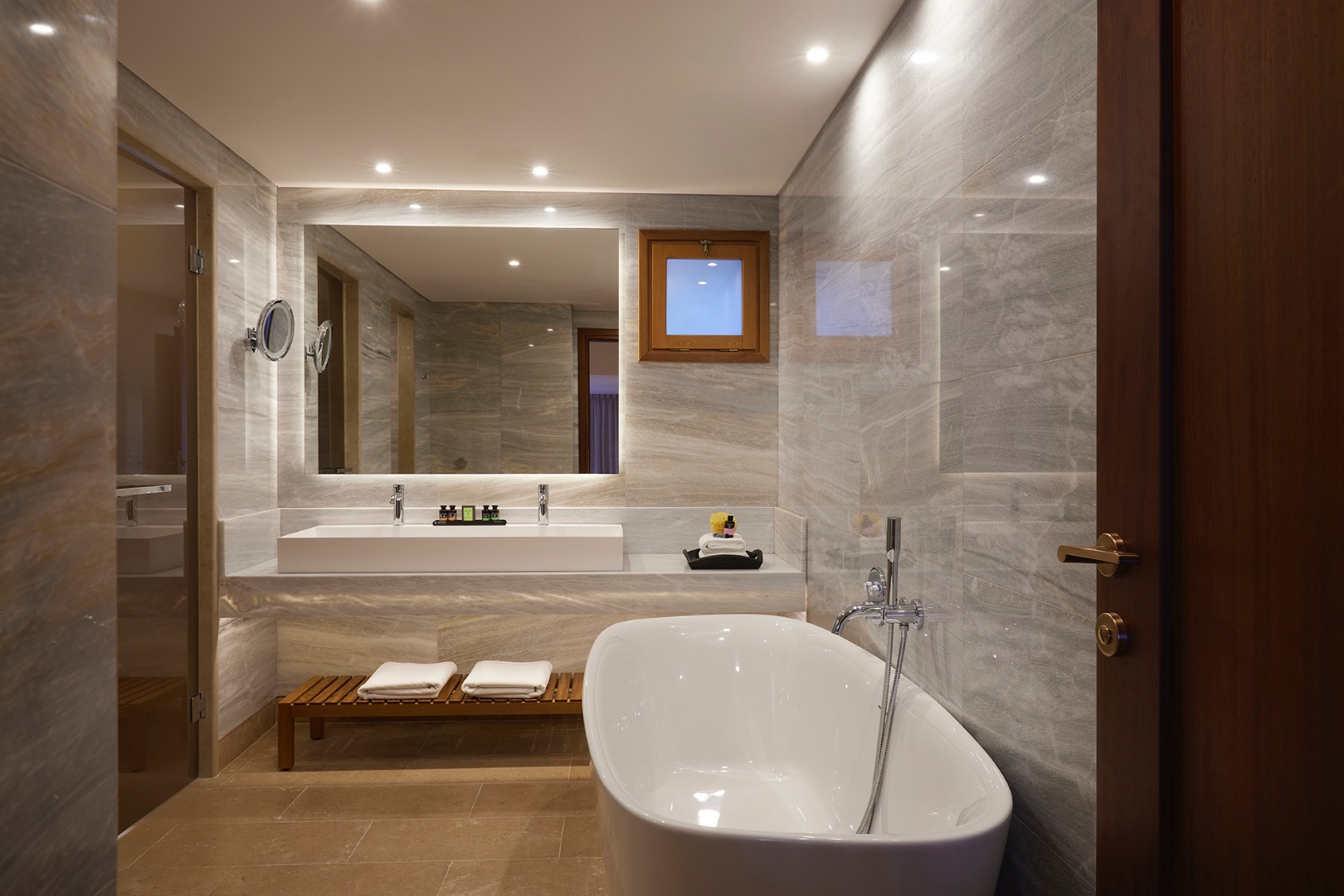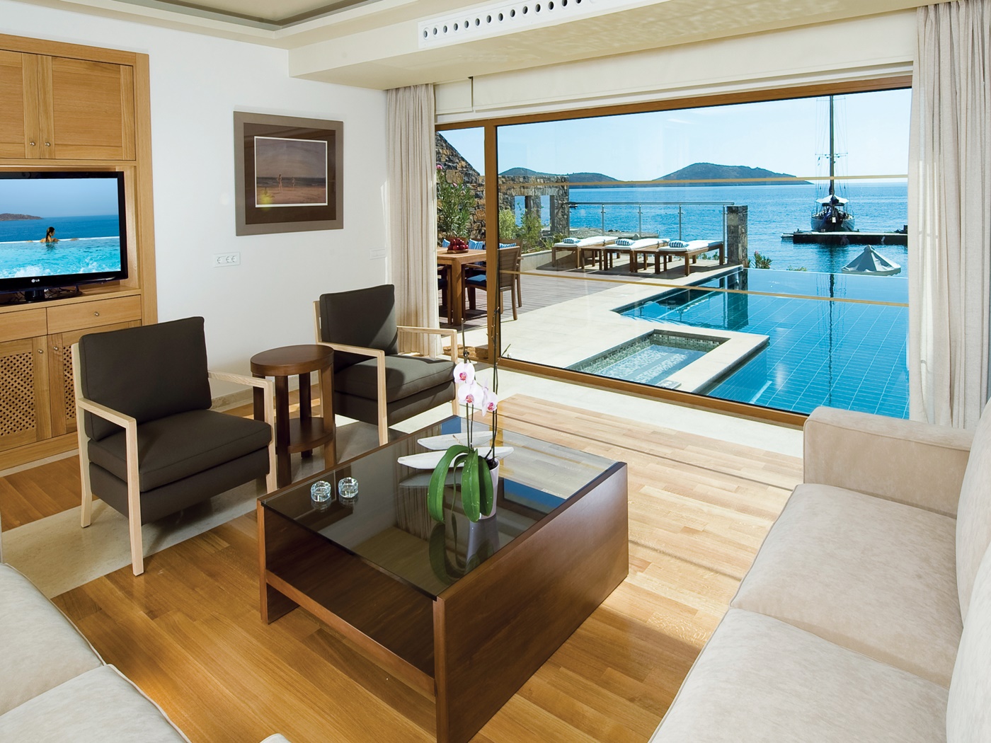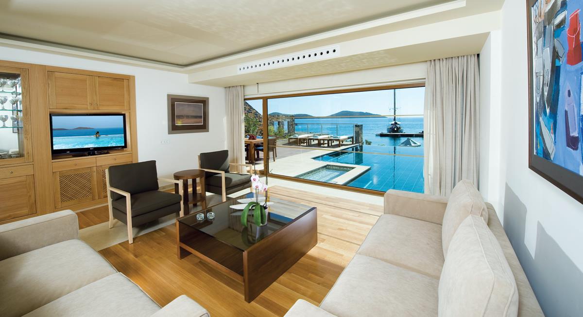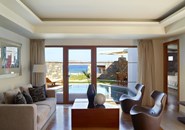 Комментарии: территория: 120 м² внутреннего пространства. Функции: просторный и роскошный сюит, расположенный в непосредственной близости к морю: с индивидуальной площадкой в скалах с лежаками и спуском к морю или с индивидуальным выходом на песчаный пляж отеля<br /> гостиная зона: комфортная гостиная комната<br /> столовая: обеденная зона внутри помещения и на открытом воздухе<br /> ванная комната: две роскошных ванных комнаты, оснащенных системой Airbath®, в одной из которых - паровой душ, в другой - сауна, в некоторых сюитах дополнительная ванная комната с душем/туалетом в гостиной<br /> бассейн: личная обустроенная терраса/сад с бассейном с подогреваемой морской водой<br /> <br /> Особенности сюитов, комфорт и сервис: Индивидуальный кондиционер с система отопления в каждой комнате; Панель управления услугами с кнопками для максимальной детализации пожеланий клиента; Плоский LCD экран ТВ со спутниковым телевидением DVD/CD проигрывателем; Телефон с выделенной линией (платно), бесплатный WiFi, DATA порт; Туалетный столик с зеркалами и феном; Электронный сейф; Роскошные мраморные ванные с системой Airbath®, душевая кабина с паром, аудиоустановка, телефон, полотенцесушитель, зеркала, банные халаты, тапочки и другие банные принадлежности.