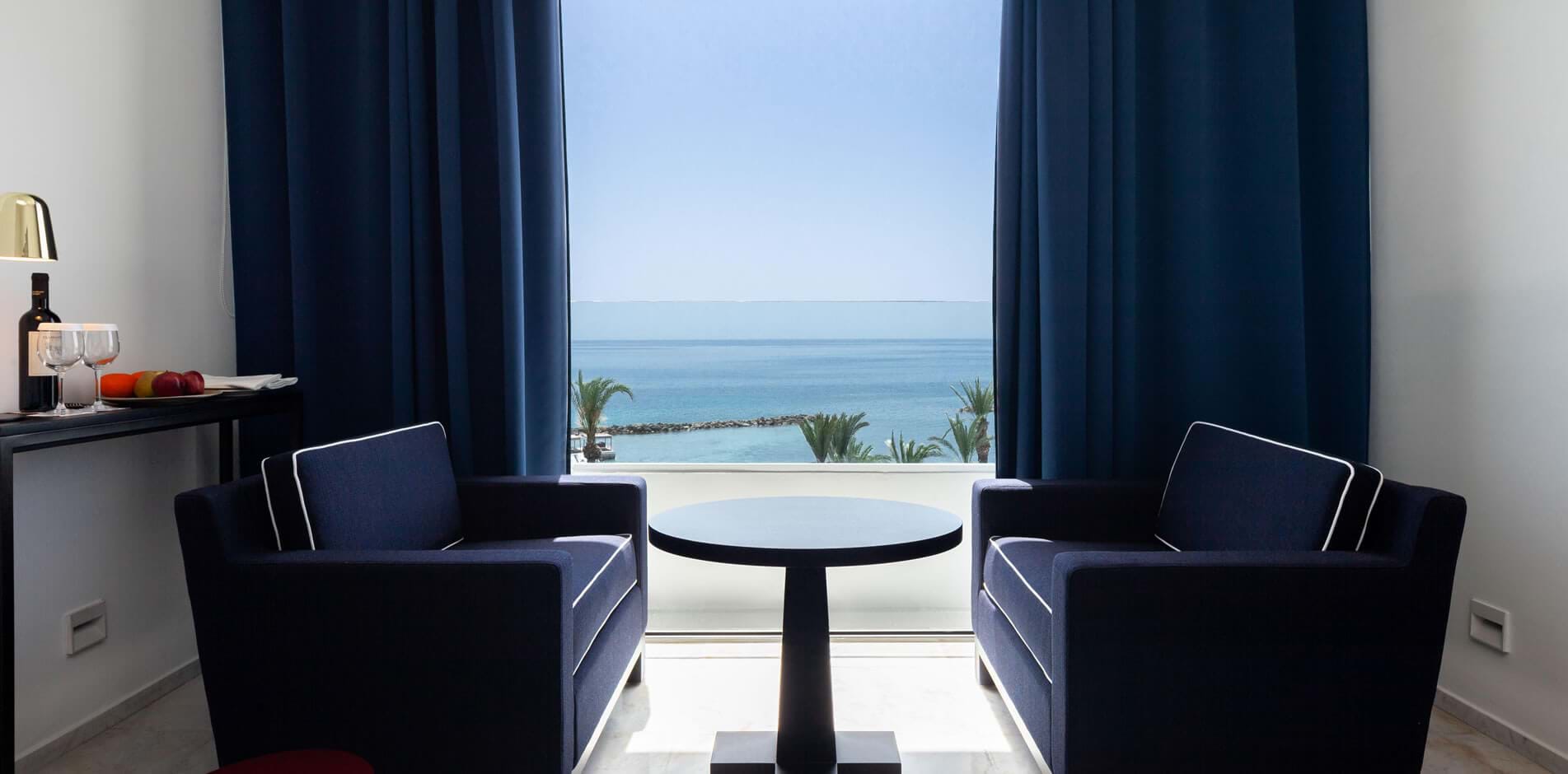 Вид из номера: на море Покрытие пола: Плитка Уборка в номере: ежедневно 19 Kyma Sea Front Suite: 47 кв.м + терраса 13 кв.м, терраса на крыше 44 кв.м, расположены так близко к морскому побережью, что можно слышать волны Средиземного моря. <br /> <br /> Имеют большие террасы с диваном и обеденным столом, выходящие на лужайку, великолепные террасы на крыше с дополнительными креслами. Дополнительный штрих экстравагантности – шезлонг королевских размеров на газоне. Панорамный вид на пафосскую крепость. <br /> <br /> Удобства в номерах:<br /> Кондиционер/отопление.<br /> Ванная комната.<br /> Спутниковое ТВ.<br /> Халаты и тапочки.<br /> Принадлежности для приготовления чая/кофе (по запросу).<br /> Бутылка минеральной воды по приезду.<br /> Имеется CD и DVD-плеер, телевизор с диагональю 43’, эспрессо-машина. |