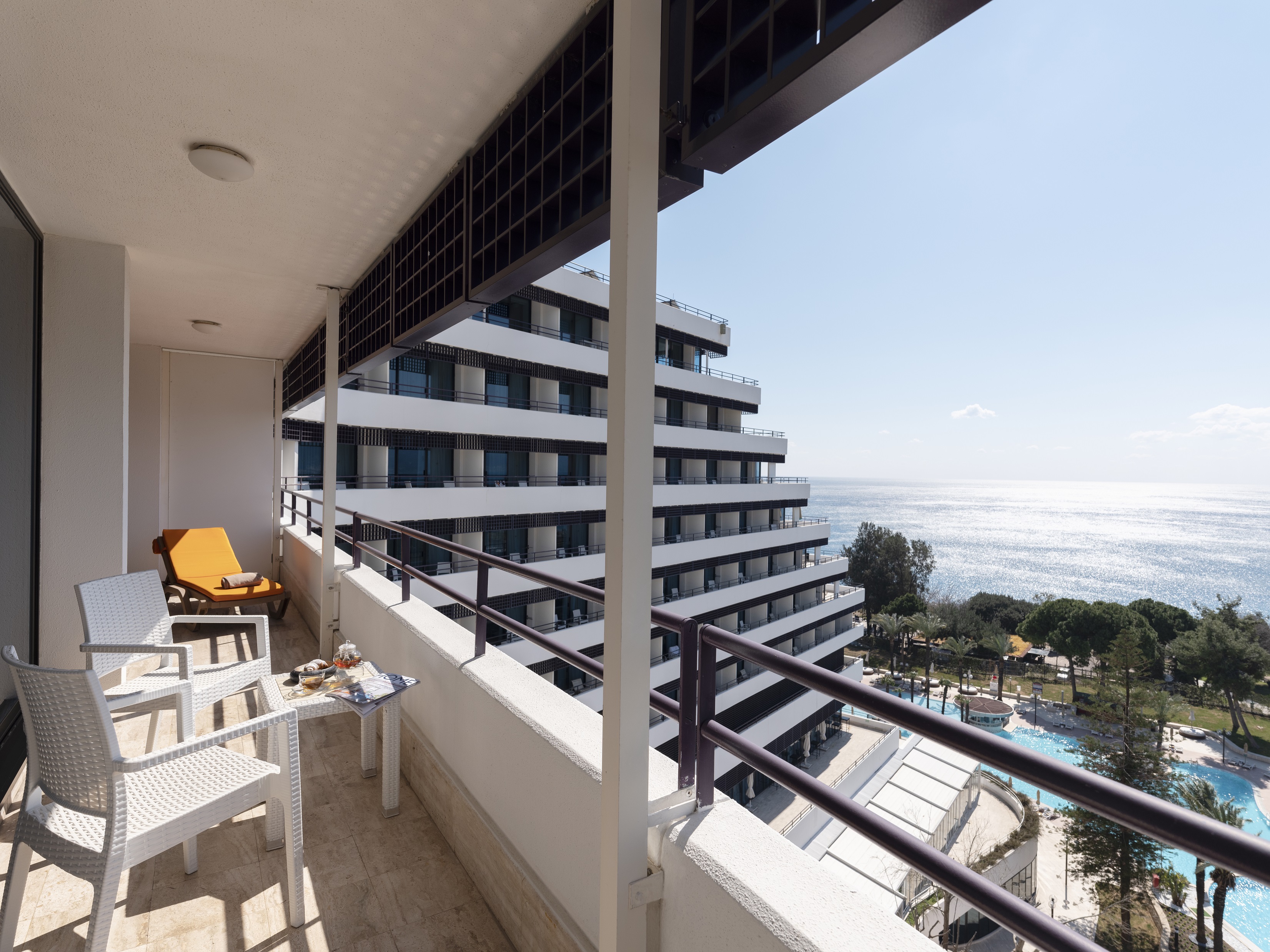 Расположение номера: 5-7 этаж Вид из номера: на сад/на море Покрытие пола: Ковролин Наполнение мини-бара: Прохладительные напитки, пиво, вода. Обновляется ежедневно. Уборка в номере: ежедневно Смена белья: раз в два дня Терраса 20 кв.м. 2 ванные комнаты. <br /> Центральная система кондиционирования (охлаждение/обогрев, включается централизованно в зависимости от погодных условий). |