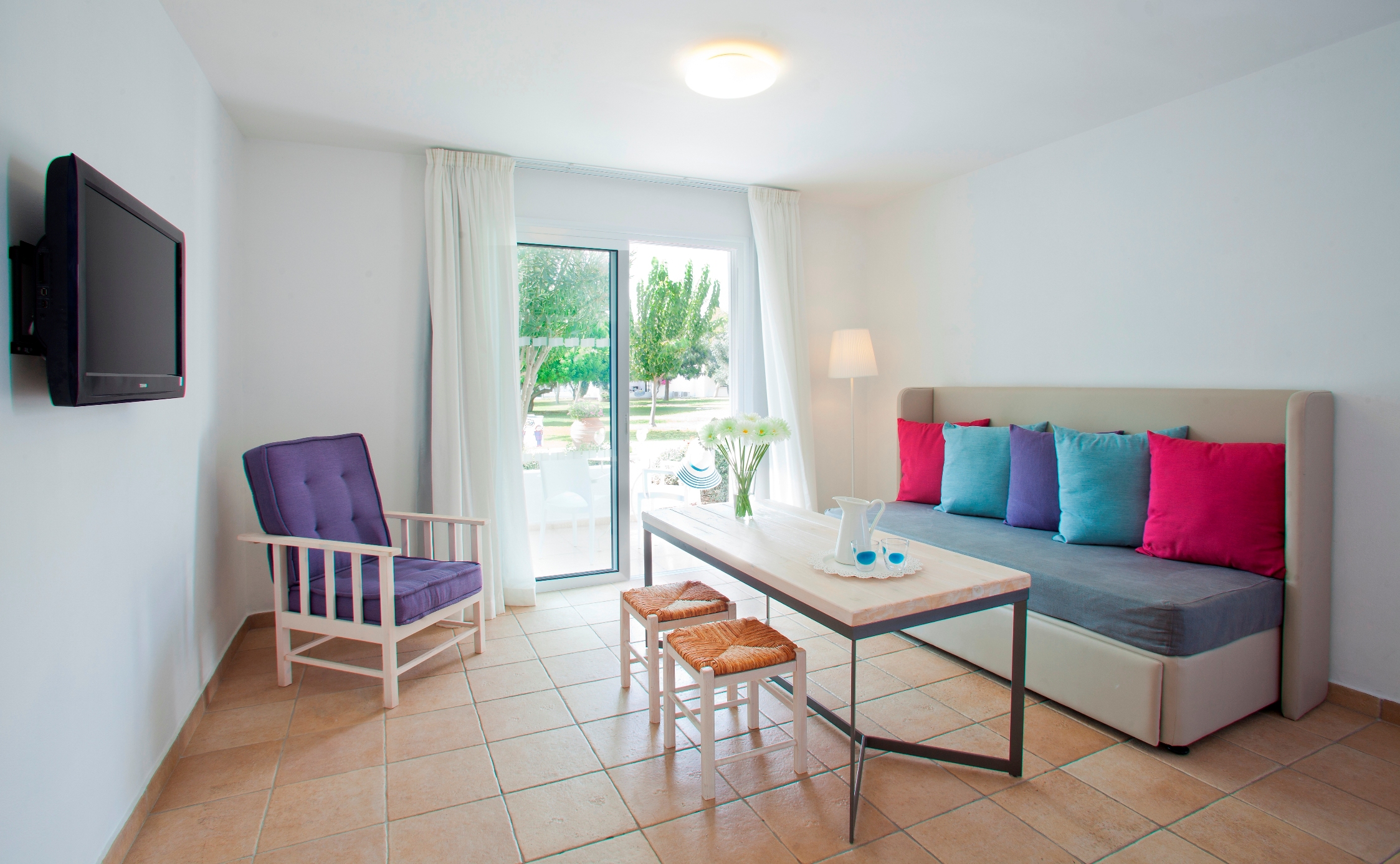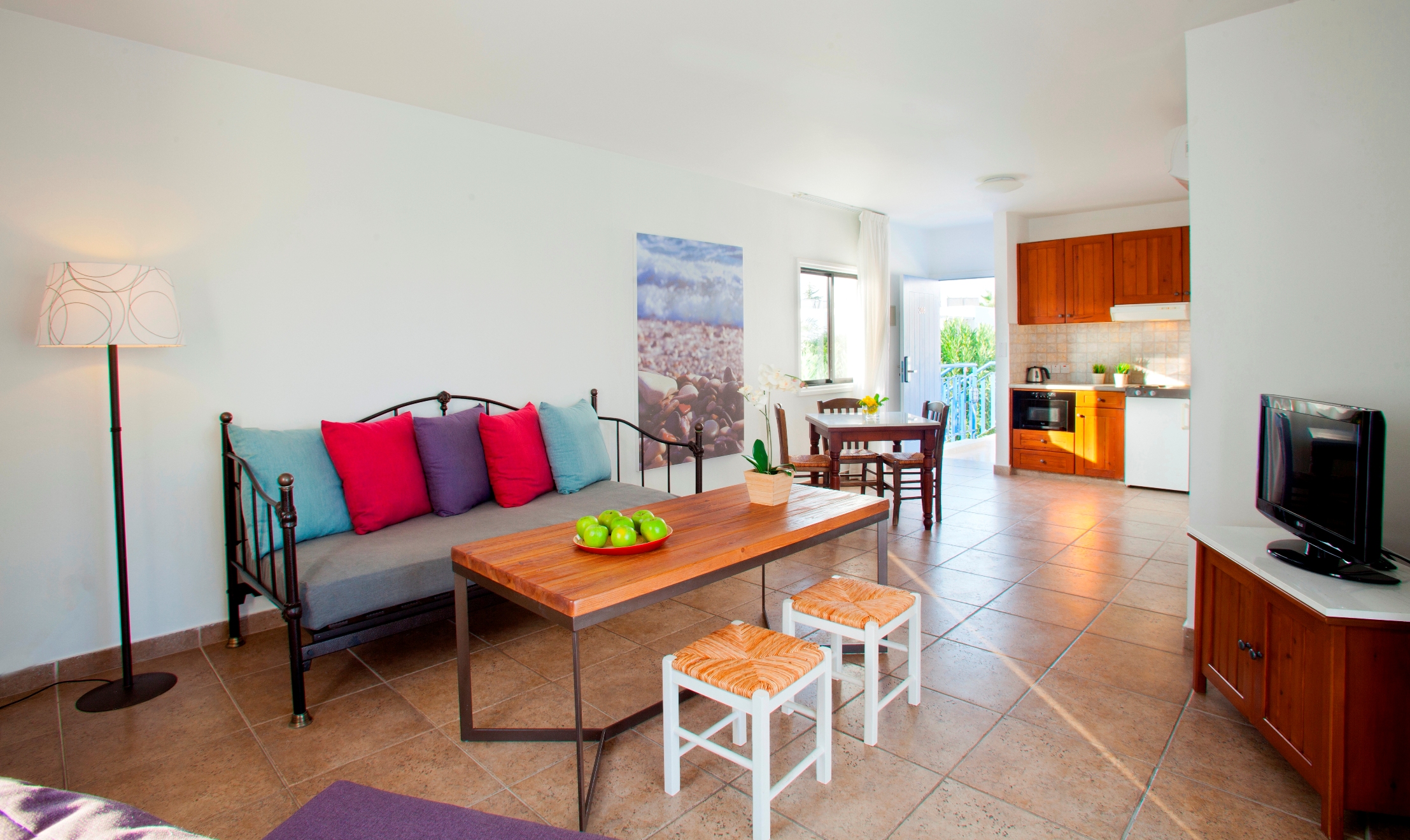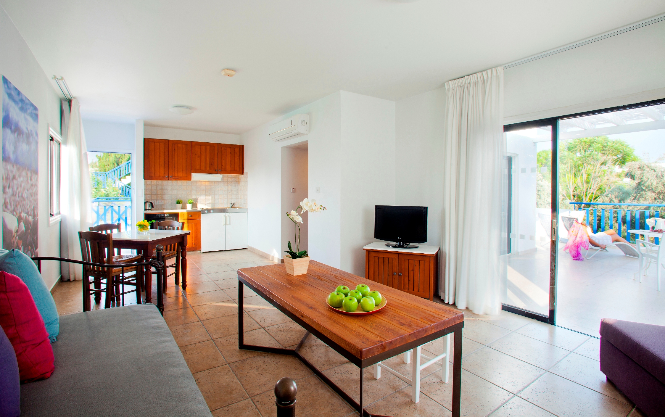 Расположение номера: в Aegean Village Вид из номера: на сад или на бассейн Покрытие пола: Плитка Оборудование кухни: плита, микроволновая печь, посуда Уборка в номере: шесть раз в неделю Смена белья: раз в три дня Однокомнатный номер разделен на зоны спальни и гостиной с мини-кухней, оборудован двуспальной или 2 односпальными кроватями и раскладным односпальным диваном. Дополнительно предоставляются халаты, DVD-плеер.<br /> <br /> Удобства в номерах:<br /> Кондиционер/отопление.<br /> Ванная комната.<br /> Балкон или терраса. <br /> Принадлежности для приготовления чая/кофе.<br /> Мини-холодильник.<br /> Спутниковое ТВ.<br /> Полотенца для бассейна. |