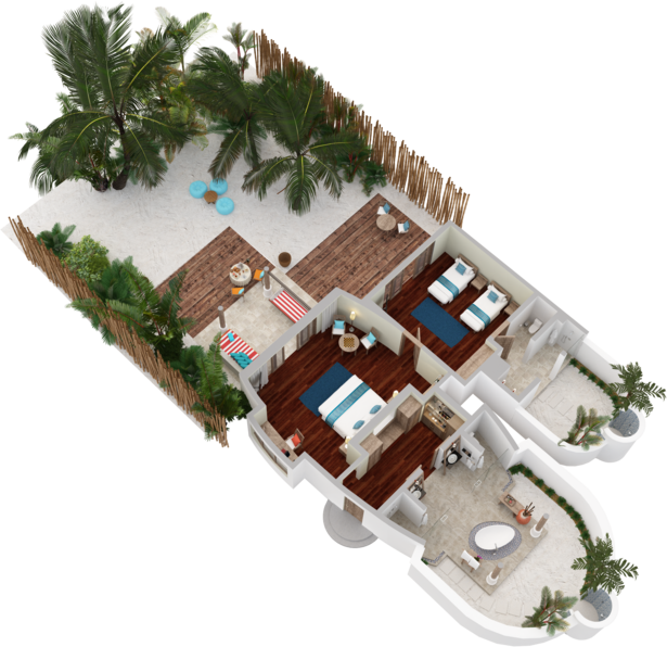 Расположение номера: рядом с пляжем. Две частично объединенные виллы с общей террасой и собственным бассейном у пляжа с прекрасным видом на лагуну.<br /> Виллы с видом на закат солнца.<br /> 2 спальни с двуспальными кроватями, каждая с ванной комнатой на открытом воздухе. <br /> Ванная комната под открытым небом с отдельной ванной-терраццо и ливневым душем.<br /> Кофеварка-эспрессо.<br /> Услуги дворецкого. |