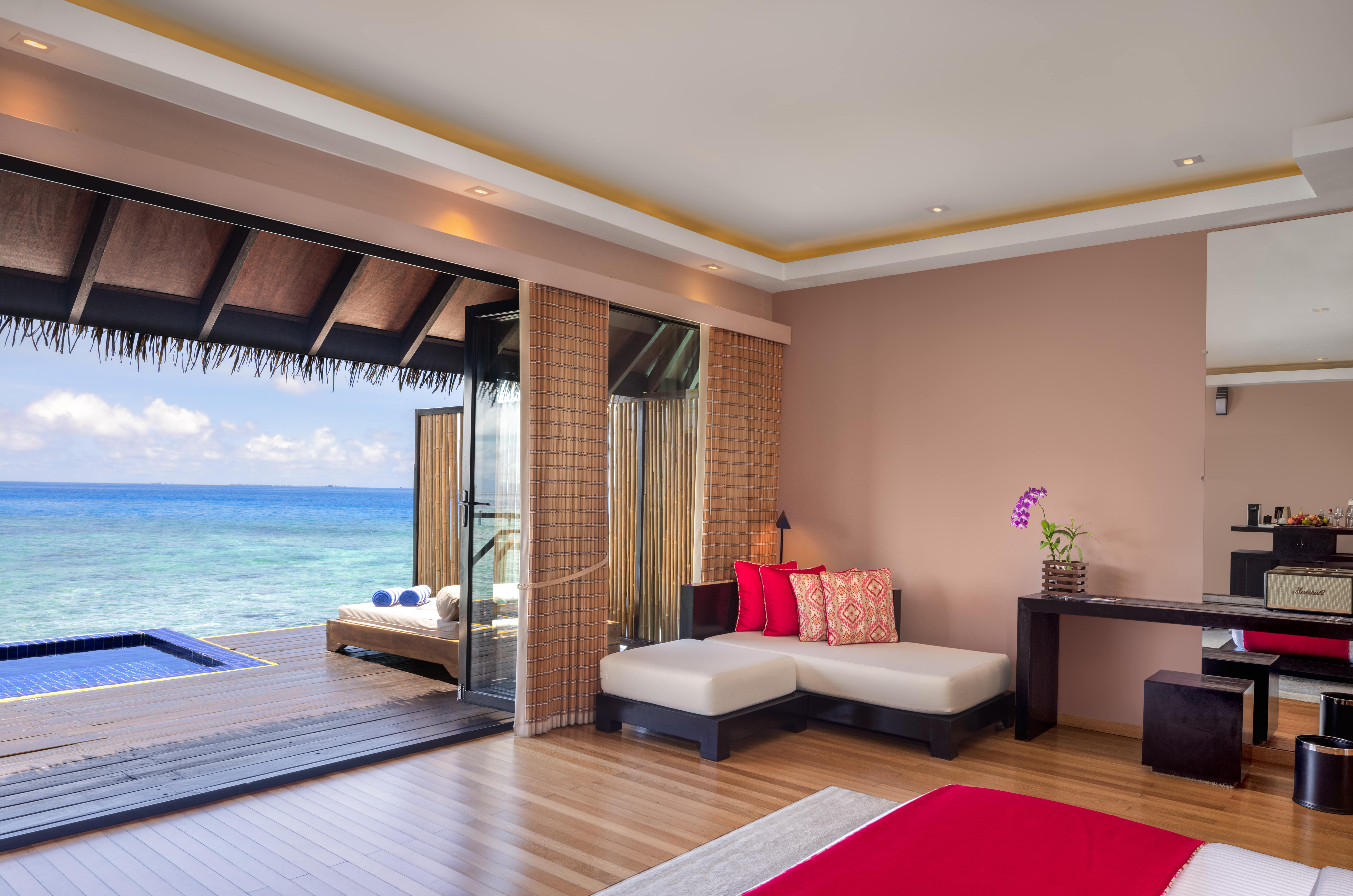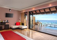 Расположение номера: вилла над водой Джакузи: в ванной комнате Покрытие пола: Деревянный пол Наполнение мини-бара: Пиво Carlsberg - 4 банки, Апельсиновый и манговый сок - по 2 упаковки, Прохладительные напитки - 2 бутылки (сприт, кола, тоник, газировка, горький лимон), Шоколад - 2 плитки, Минеральная вода - 2 бутылки, Свежее молоко - 2 пакетика (пополняется ежедневно). Терраса: шезлонги и обеденная зона, спуск в воду (деревянная лестница), бассейн.<br /> Банные принадлежности.<br /> Игристое вино или безалкогольное игристое вино, бесплатные свежие фрукты и ассорти из орехов по прибытии.<br /> Бесплатные канапе по вечерам.<br /> На виллу ежедневно доставляются два вида свежих фруктов.<br /> Меню подушек.<br /> Услуги дворецкого.<br /> При размещении 2 взрослых + 2 детей предоставляется только одно дополнительное спальное место и второй ребенок спит на кровати с родителями. |