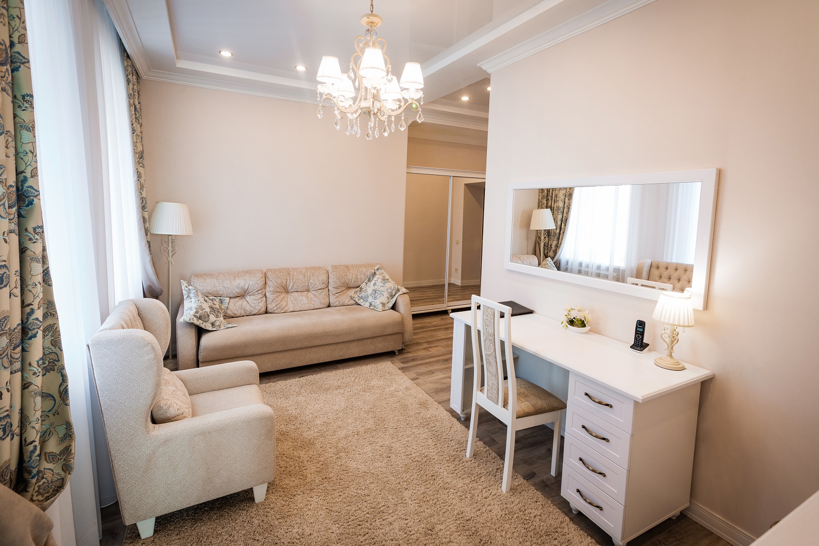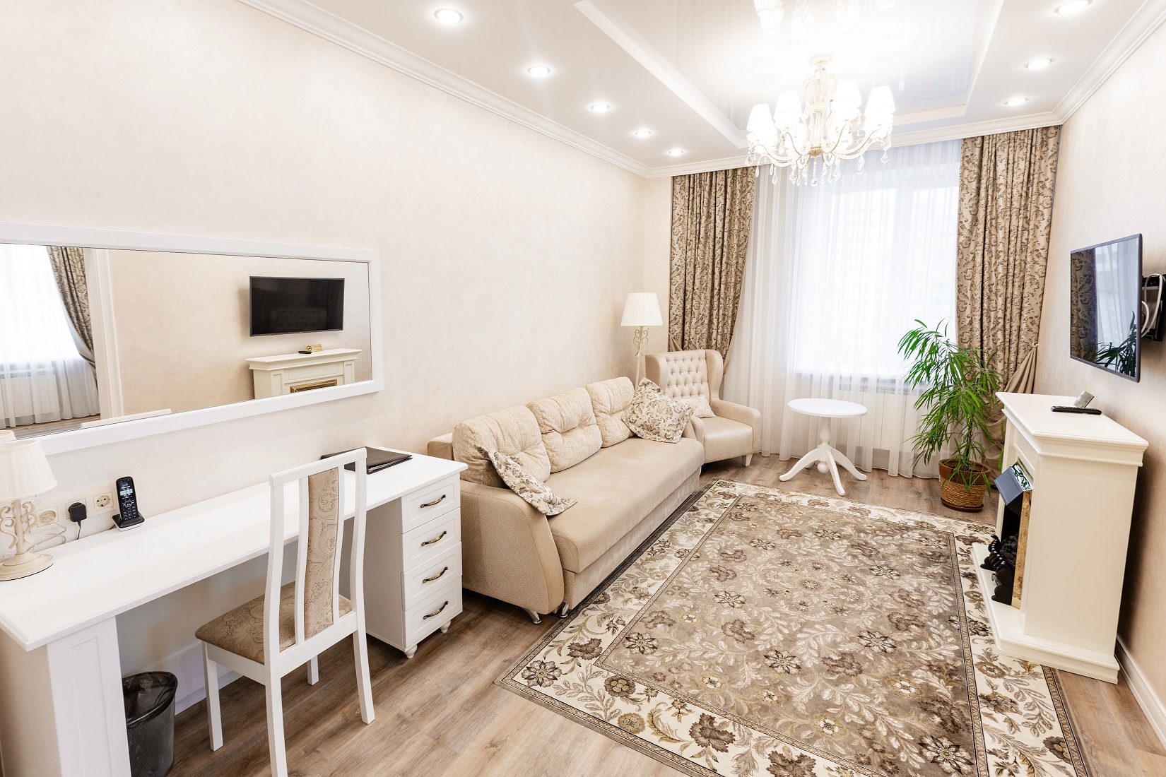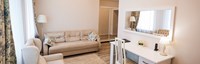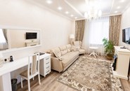 Расположение номера: 4,5 этажи Вид из номера: на территорию / на город Покрытие пола: Ламинат Оборудование кухни: (плиты нет!) Уборка в номере: 1 раз в день Смена белья: 1 раз в 3 дня; полотенца ежедневно Прихожая, гостиная, спальня. <br /> Дополнительное спальное место: диван раскладной.<br /> <br /> Год реновации: 2020. |