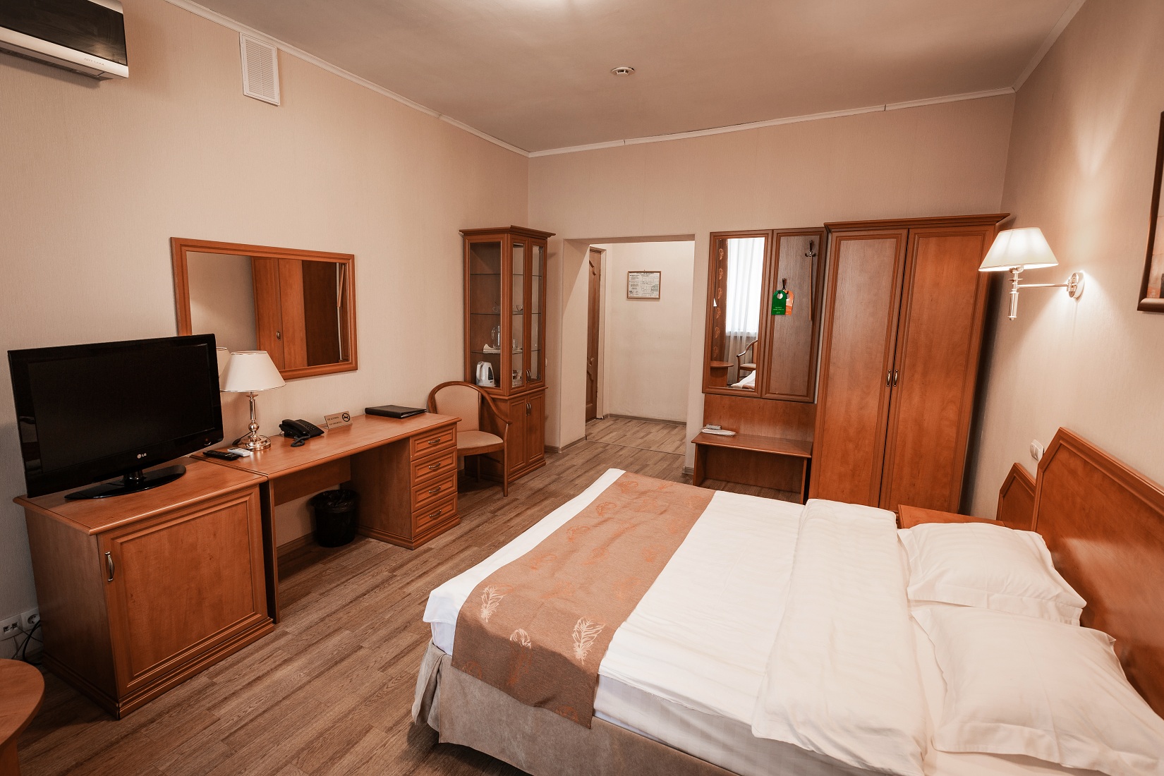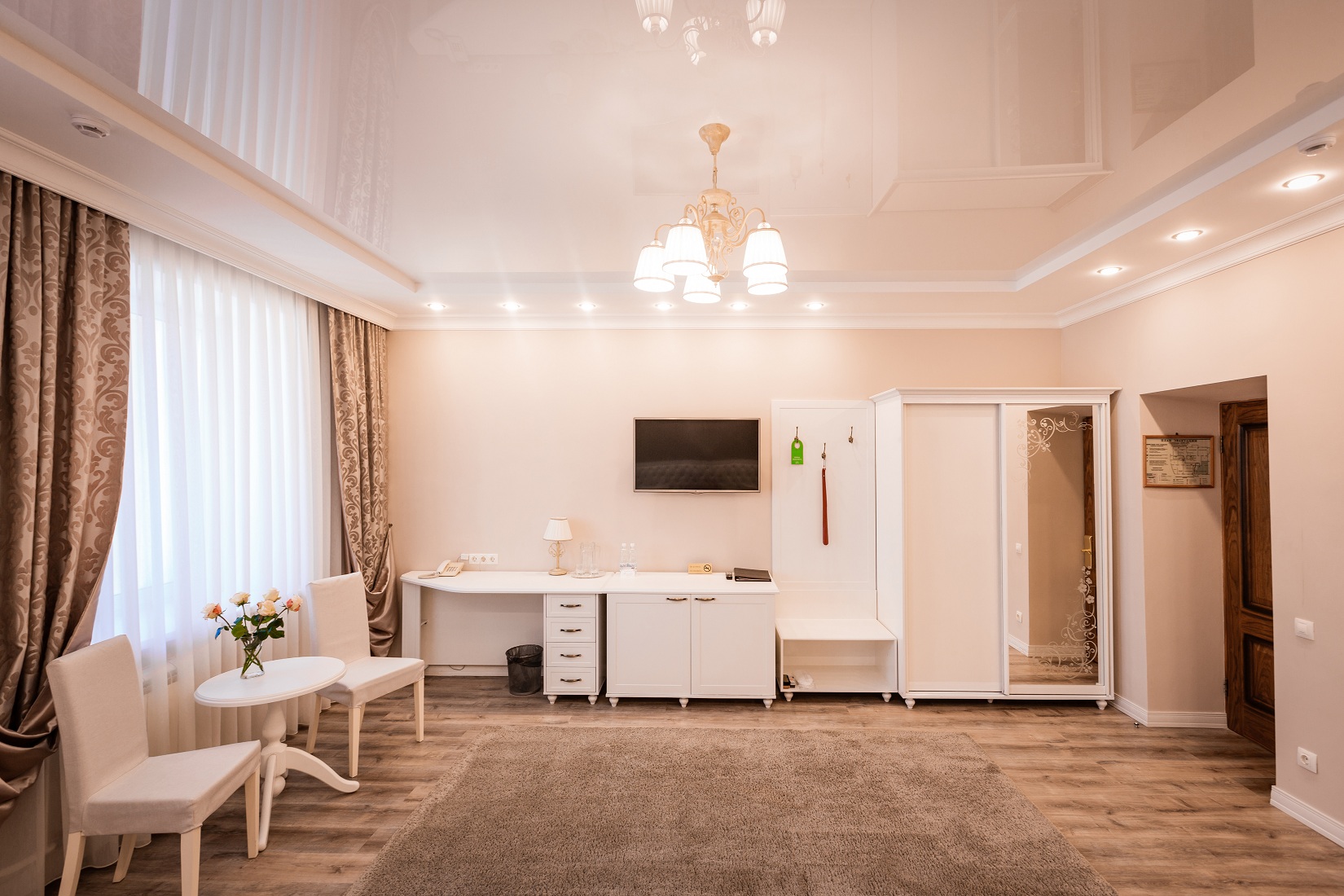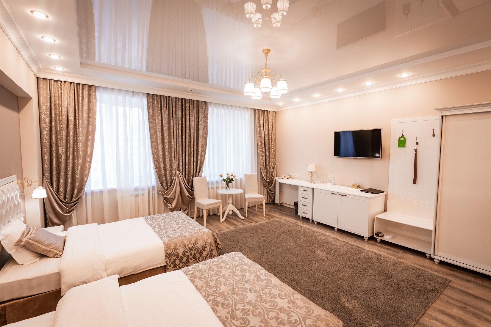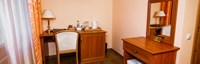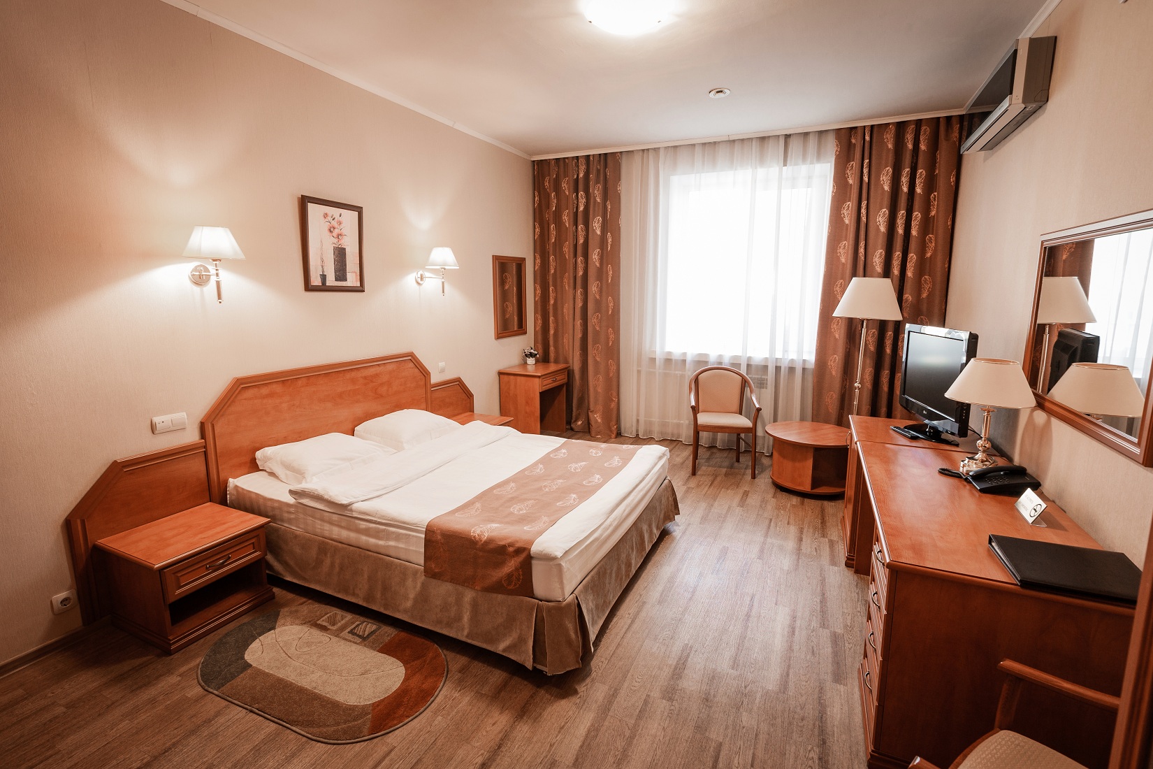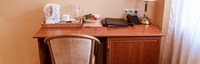 В гостинице для размещения гостей предлагаются 28 комфортабельных номеров. На втором этаже расположено кафе "Вернисаж", где сервируется горячий завтрак. На цокольном этаже здания работают бассейн и тренажерный зал.