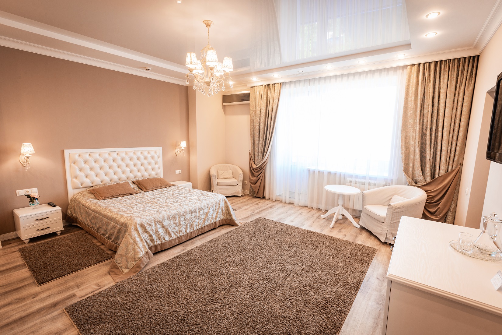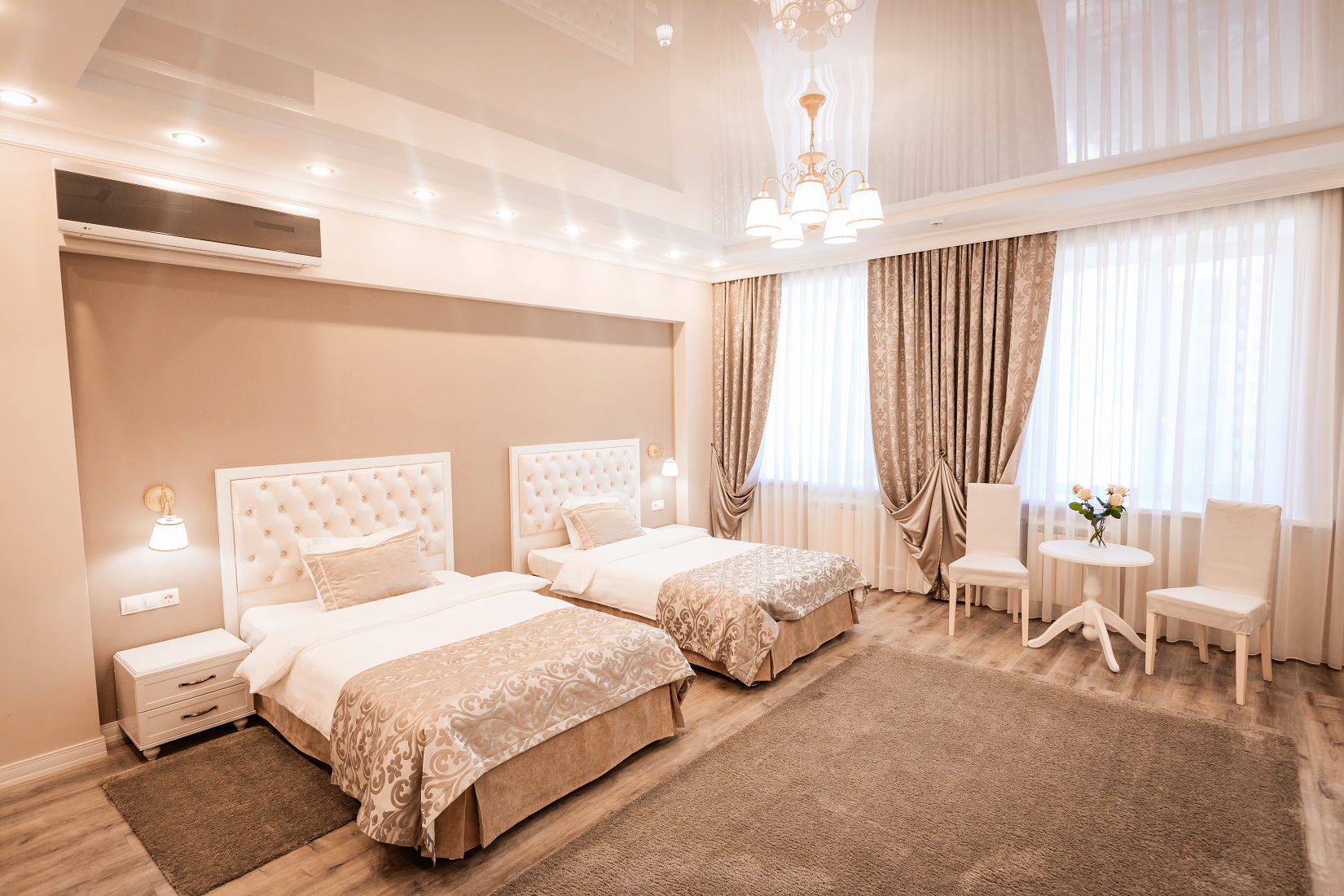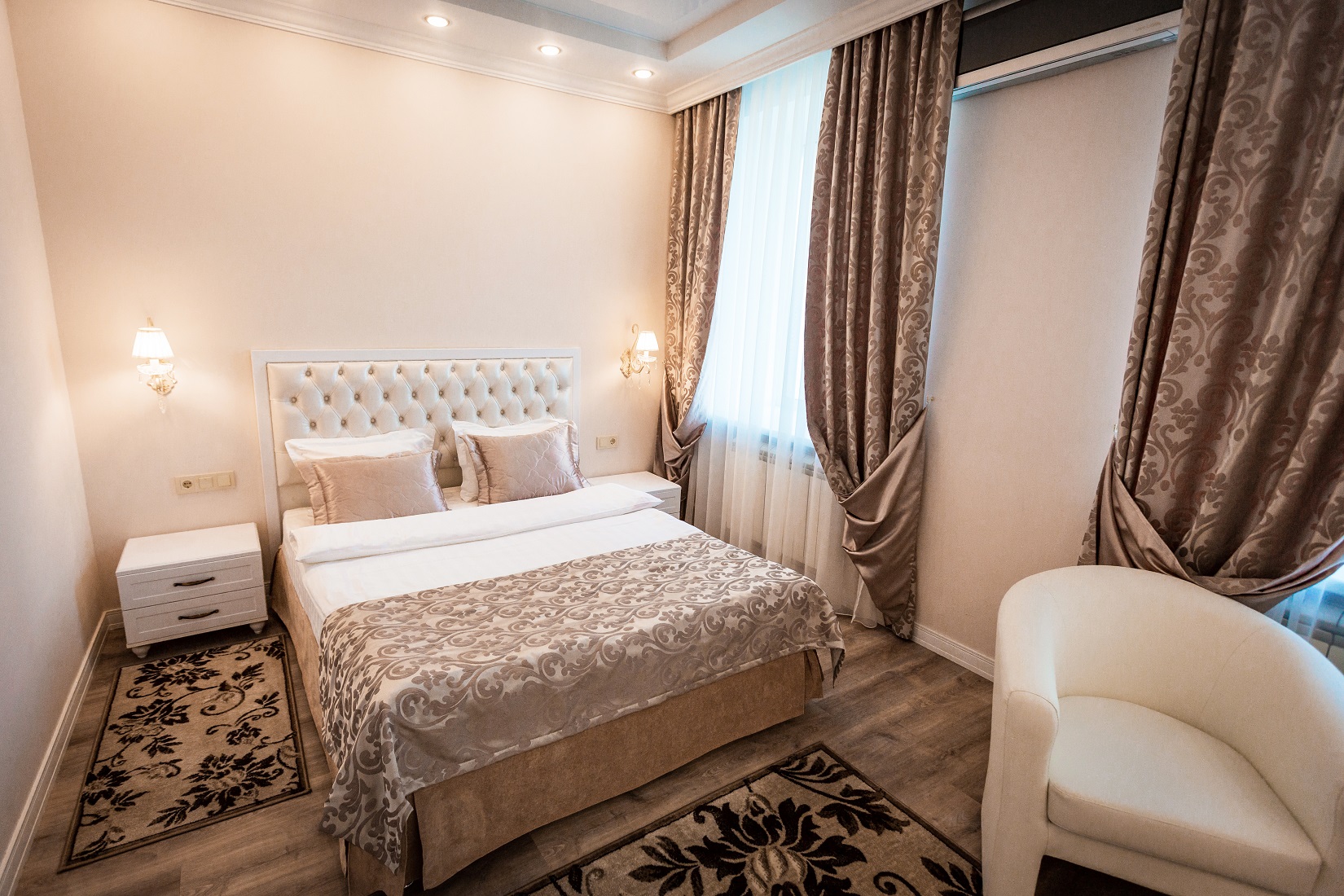 В гостинице для размещения гостей предлагаются 28 комфортабельных номеров. На втором этаже расположено кафе "Вернисаж", где сервируется горячий завтрак. На цокольном этаже здания работают бассейн и тренажерный зал.