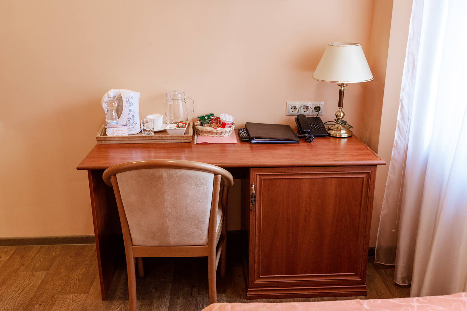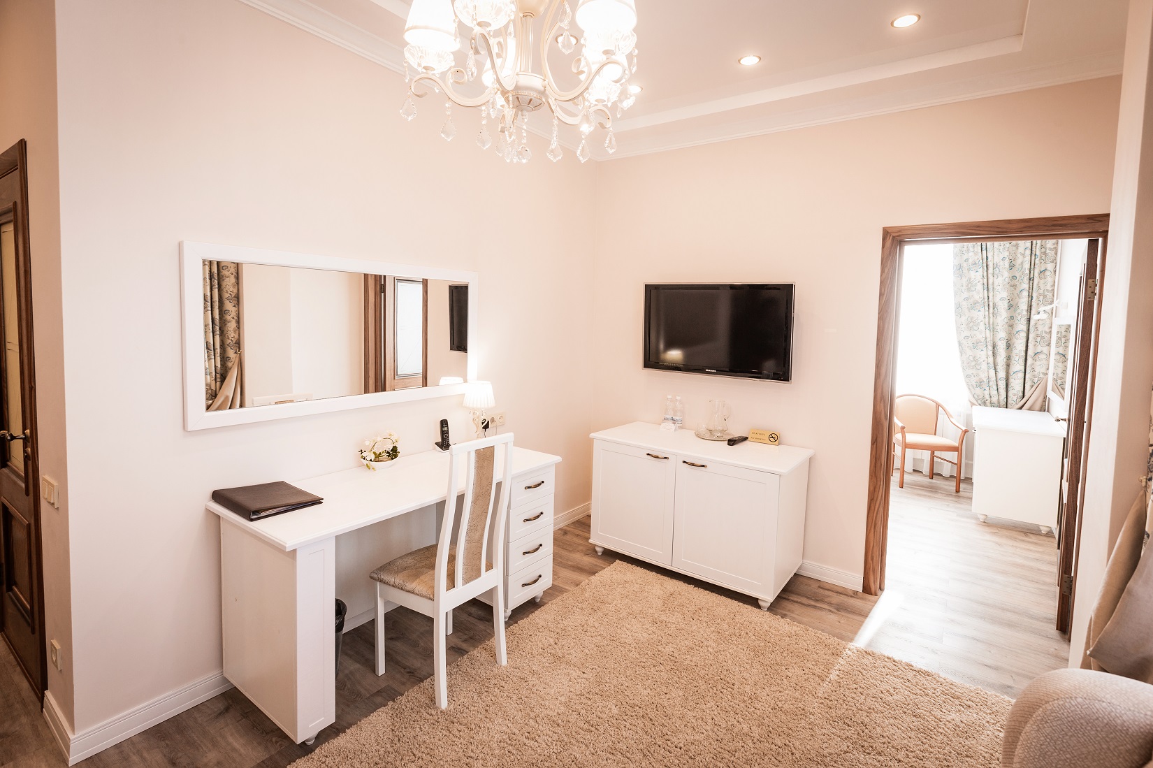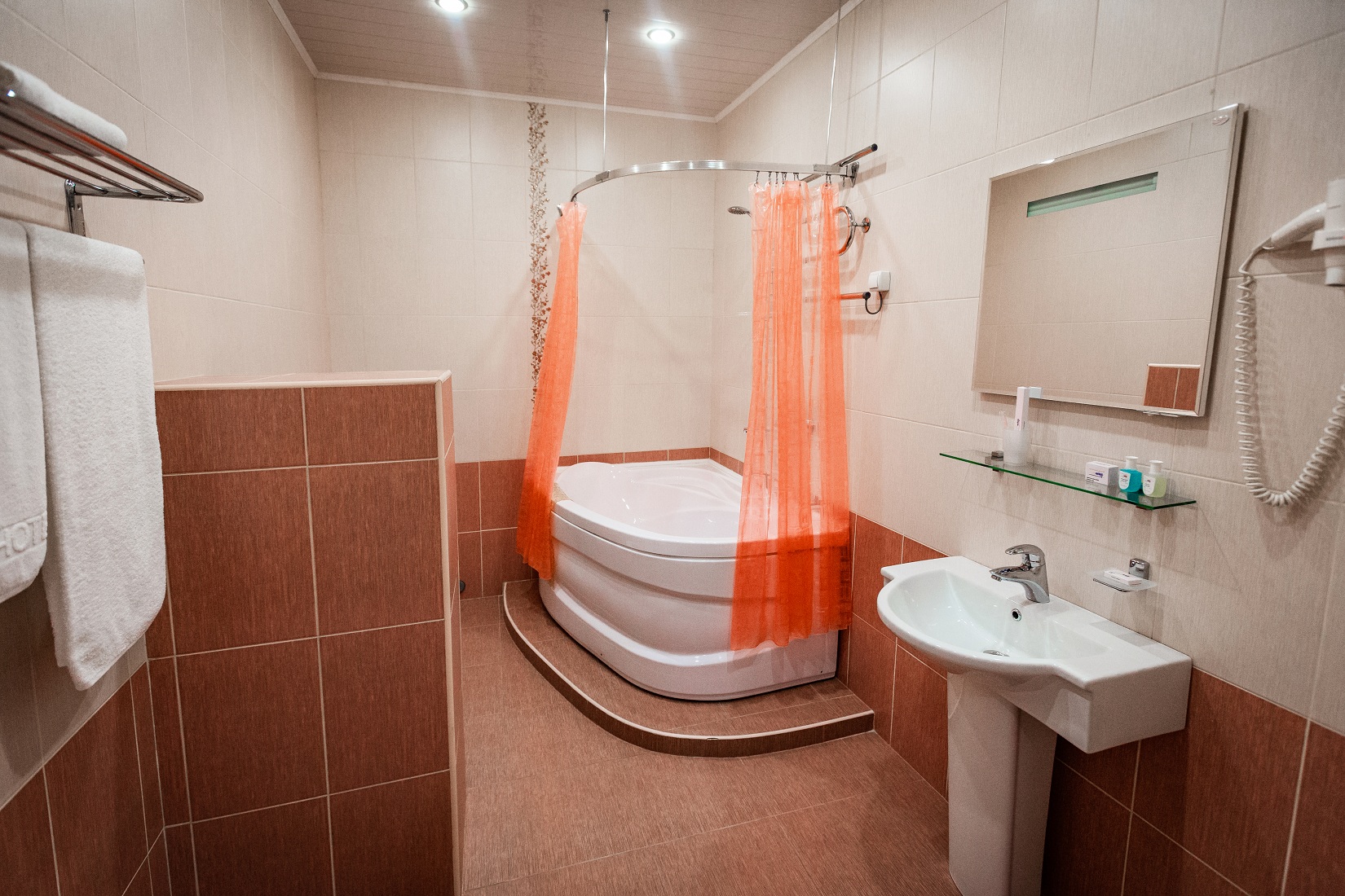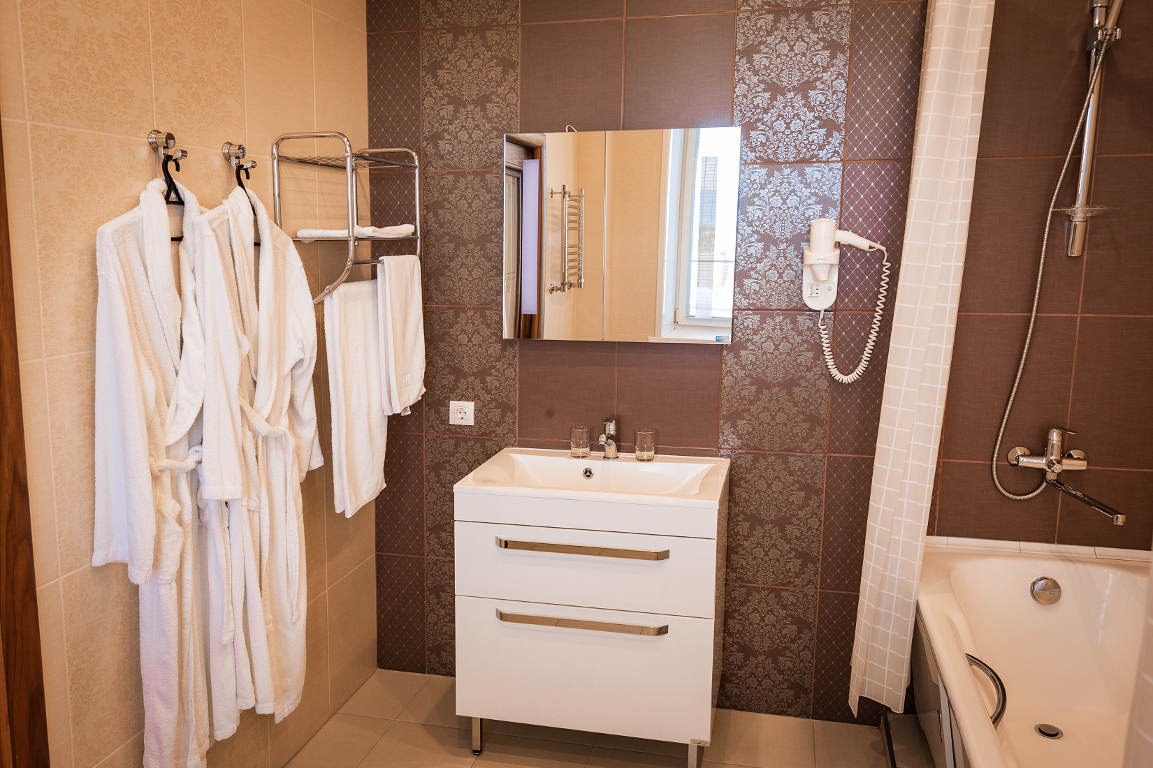 В гостинице для размещения гостей предлагаются 28 комфортабельных номеров. На втором этаже расположено кафе "Вернисаж", где сервируется горячий завтрак. На цокольном этаже здания работают бассейн и тренажерный зал.