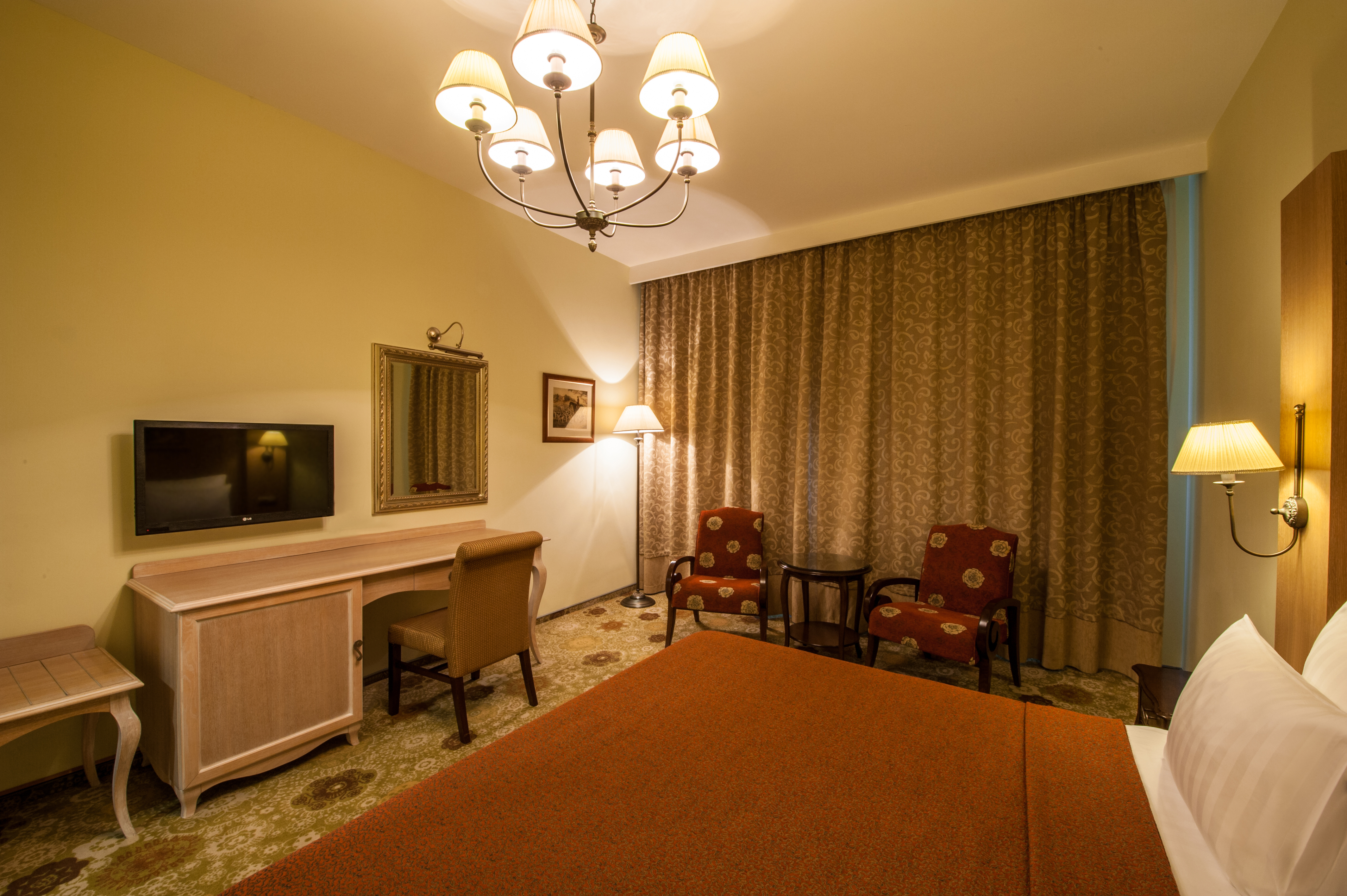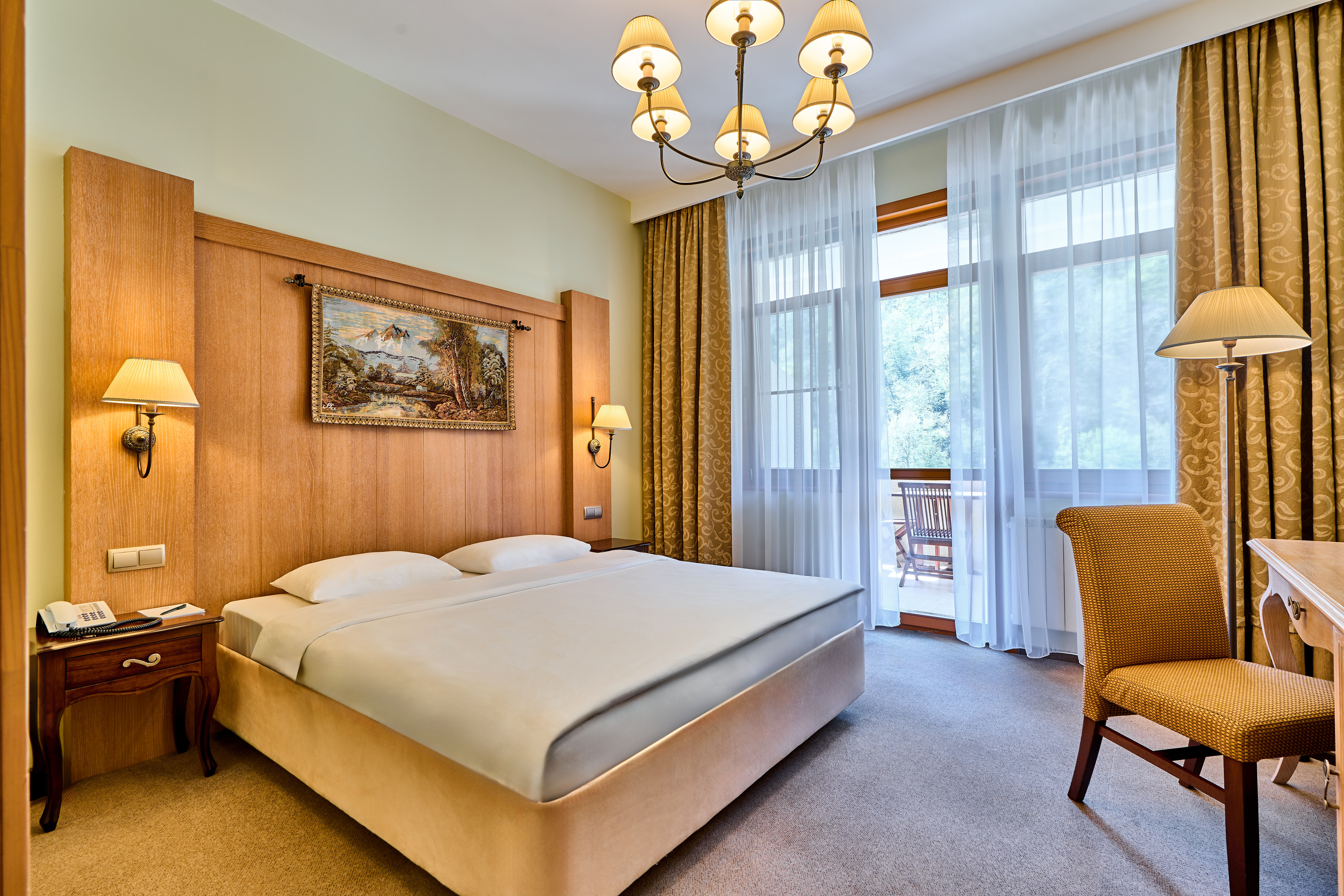 Расположение номера: Корпус A, B Вид из номера: На горы Покрытие пола: Ковролин Наполнение мини-бара: по желанию гостя (платно) Уборка в номере: ежедневно Смена белья: 1 раз в 2 дня Дополнительные услуги: Акустическая система ihome, Комплекты полотенец, Балконная мебель Просторные однокомнатные номера отличаются необычным планировочным решением и декором. Потолок мансардного типа, изысканная спальня с бронзовыми светильниками и широкой двуспальной кроватью, обилие света и чистота пространства дарят ощущение легкости и спокойствия, а наличие необходимой техники и Hi-Fi системы делают номера этой категории не только комфортными, но и функциональными.<br /> <br /> Часть номеров оборудованы балконами.<br /> <br /> Максимальное количество гостей: 4 взрослых (2 осн. + 2 доп. места).<br /> Дополнительное место - раскладывающийся диван.<br /> Ребенок до 4-х лет (вкл.) с представлением места (детская кроватка или диван) и питания размещаются - бесплатно.<br /> Детская кроватка предоставляется бесплатно (по запросу).<br /> <br /> "Люкс Студия": номер без дополнительного спального места.<br /> "Люкс Студия с доп. местом": номер с дополнительным спальным местом.  |