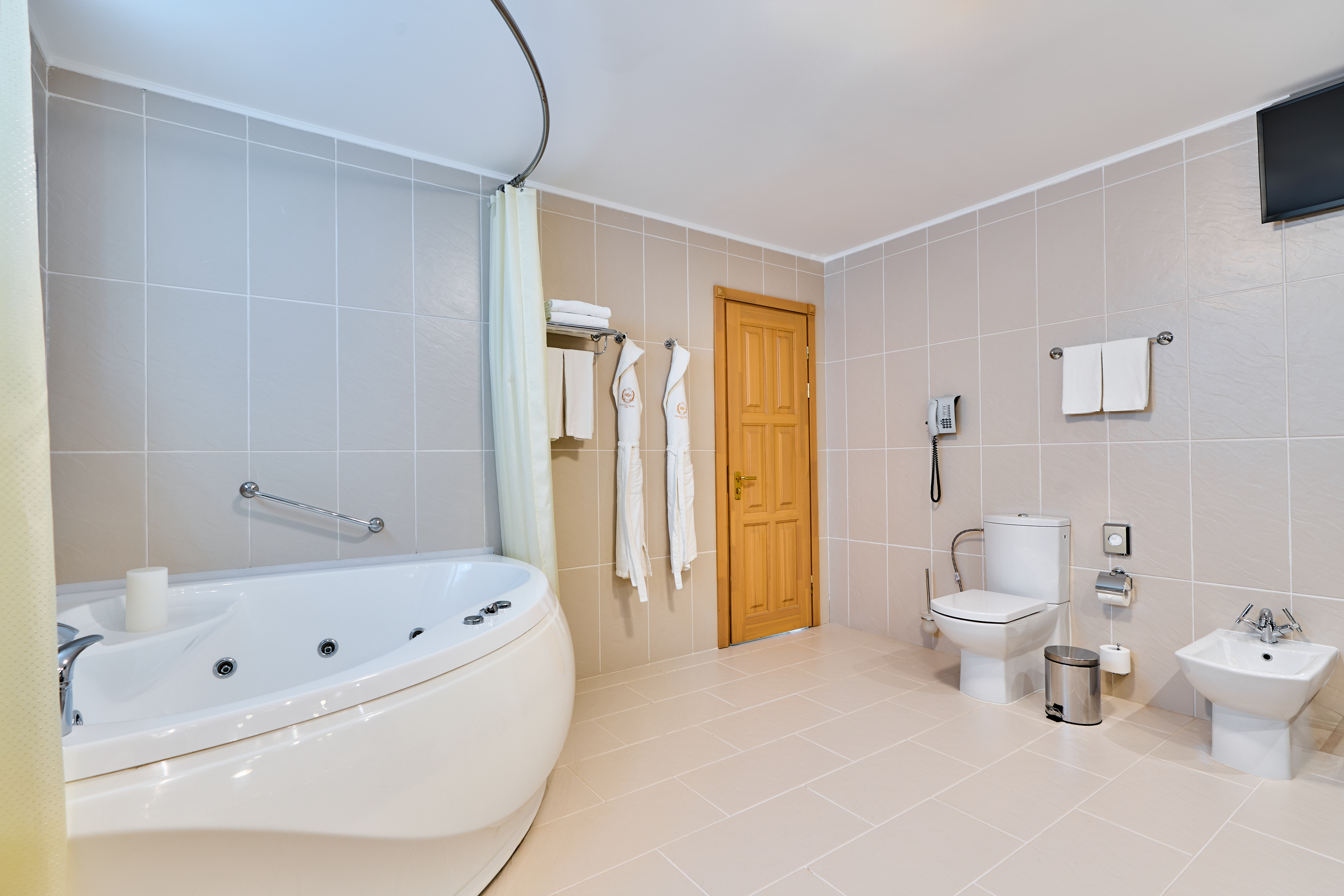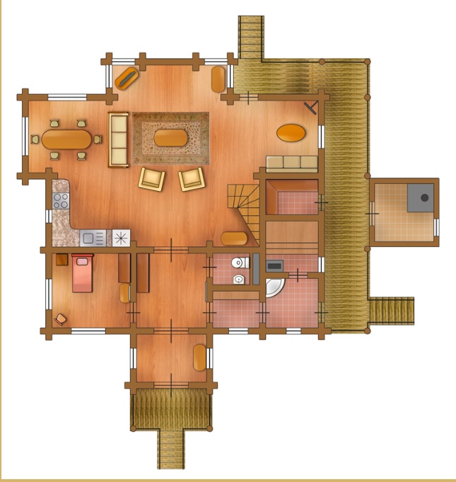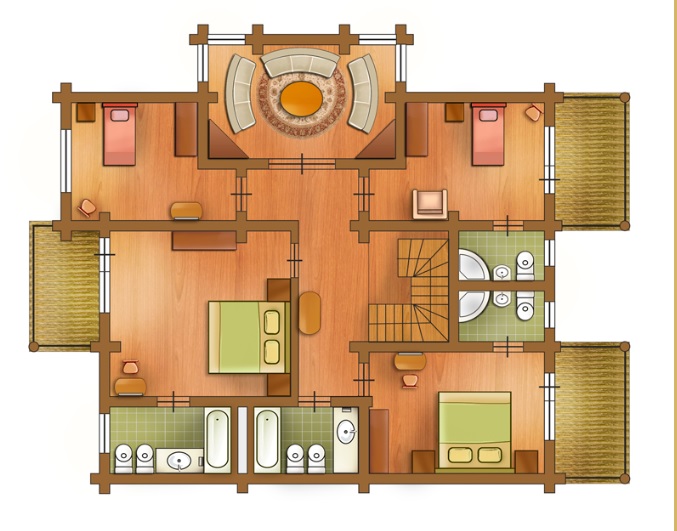 Покрытие пола: Ламинат Оборудование кухни: холодильник, морозильная камера, раковина, электрическая плита, вытяжка, посудомоечная машина, максибар. Все оборудование фирмы Electrolux. Уборка в номере: ежедневно Смена белья: 1 раз в 3 дня Вилла представляет собой отдельно стоящее 2-этажное здание с подъездом для автомашин, гостевым и техническим входом, балконами и террасами, оборудованы 5 спальнями, отдельными ванными комнатами, 2 гостиными, просторной кухней и сауной.<br /> На первом этаже Виллы располагается холл (7,3 м²), прихожая (4,9 м² ), санузел (14 м²), состоящий из туалетной комнаты, раздевалки, душевой и сауны, одна спальня (8,6 м²), гостиная (41,3 м²), обеденный зал (9,5 м²) и помещение кухни (10,2 м²). В прихожей и холле - зеркало, шкаф, вешалки для одежды, утюг и гладильная доска. Спальня на 1 этаже на 1 гостя: 1 односпальная кровать, шкаф, зеркало, прикроватная тумба. В гостиной: мягкая мебель, журнальные столики. В обеденной комнате – большой обеденный стол и стулья.<br /> На втором этаже расположены четыре спальни (18,1 м², 12 м², 11 м², 10 м²), ванные комнаты (две по 3 м² и две по 4,5 м²), библиотека. В каждой спальне есть шкаф, кровать, прикроватная тумба, коврики прикроватные, стул, плазменное ТВ (только на 2-м этаже). Две спальни имеют двуспальную кровать и свою ванную комнату, электронный сейф расположен в самой большой по размеру спальне; в двух других спальнях - односпальные кровати, причем одна из спален не имеет своей отдельной ванной комнаты.<br /> Всего 5 спален на 7 человек – две двухместные и три одноместные кровати.<br /> <br /> "Villa": номер без дополнительного спального места.<br /> "Villa с доп. местом": номер с дополнительным спальным местом.  |