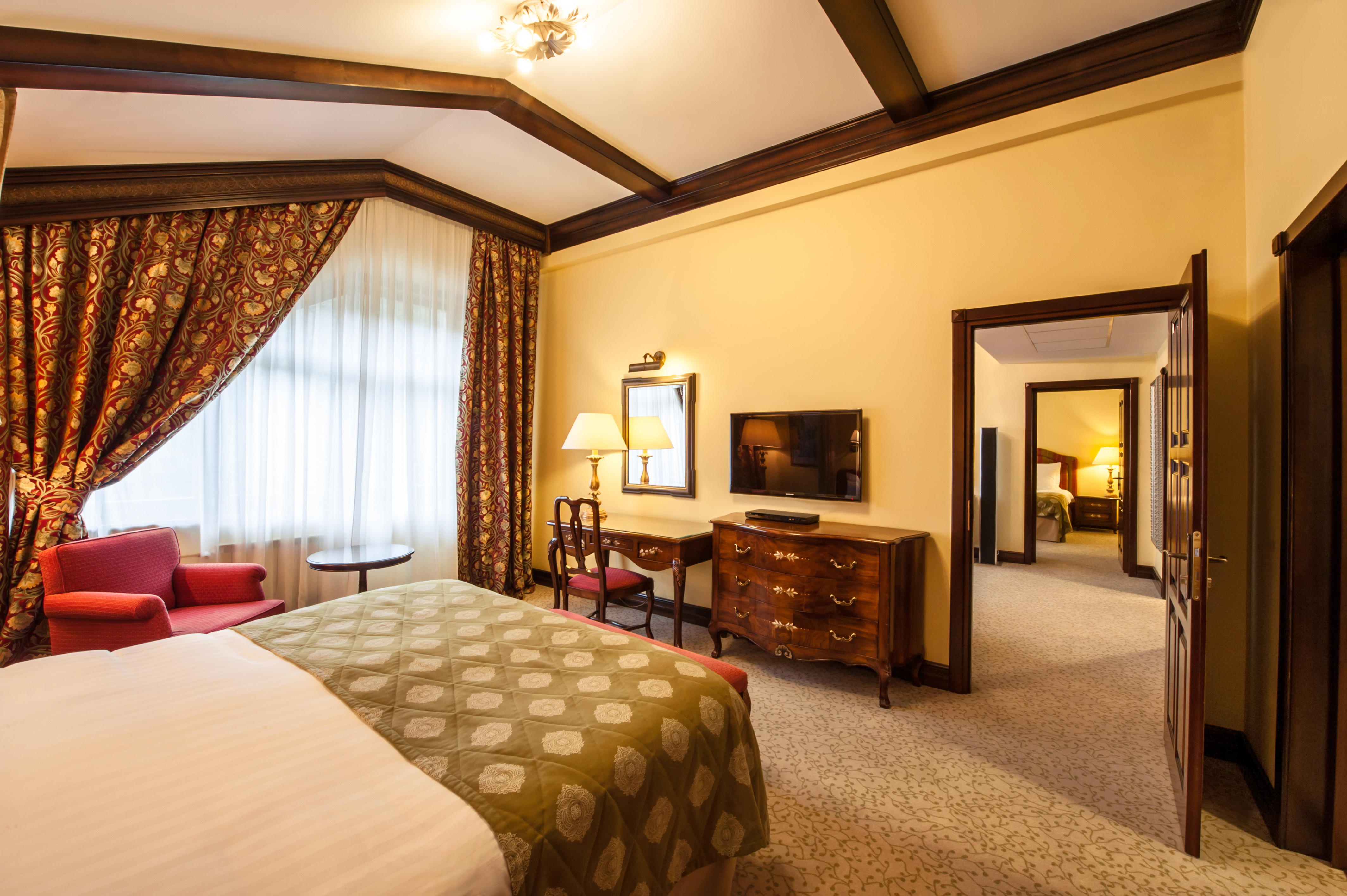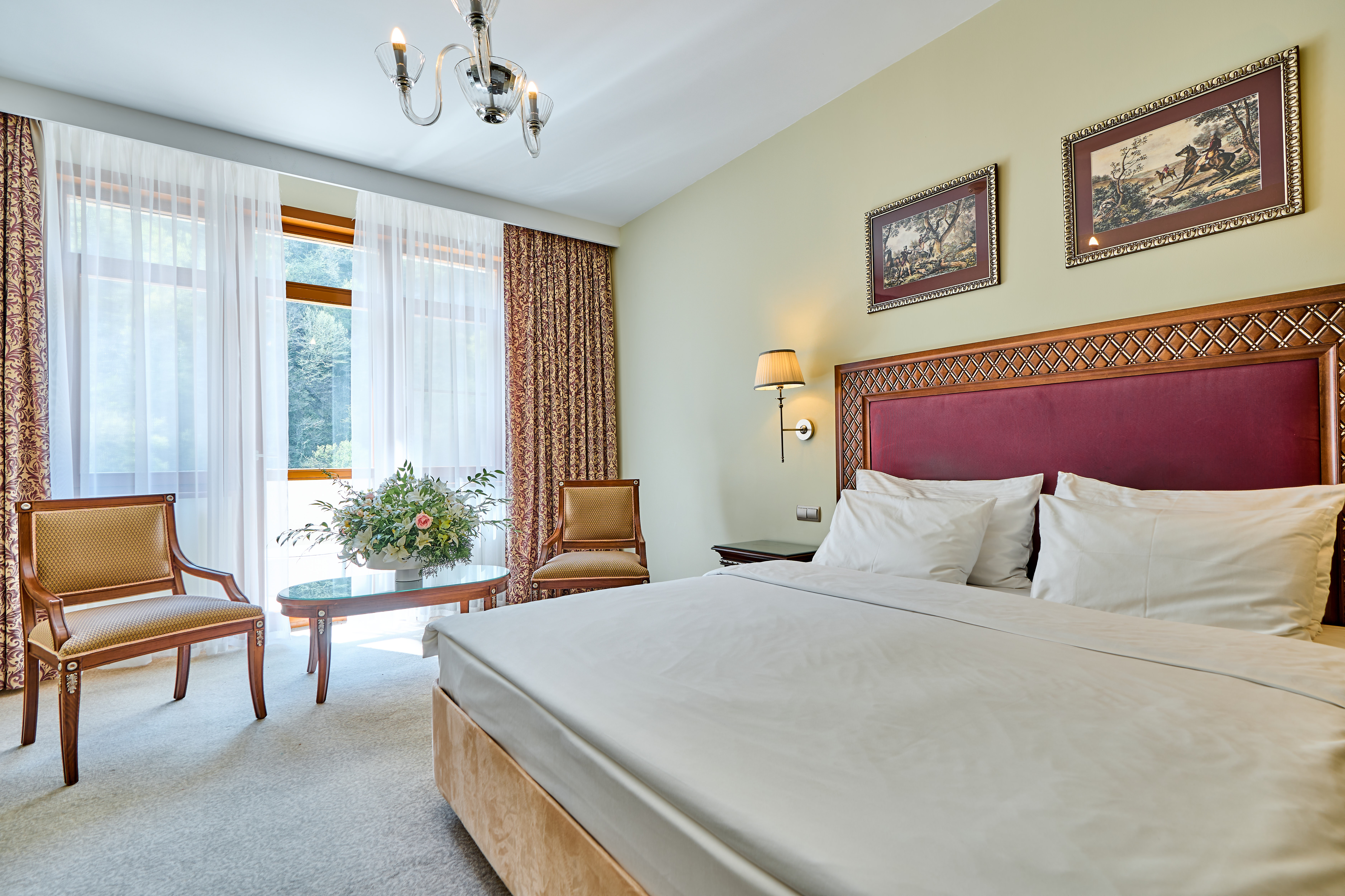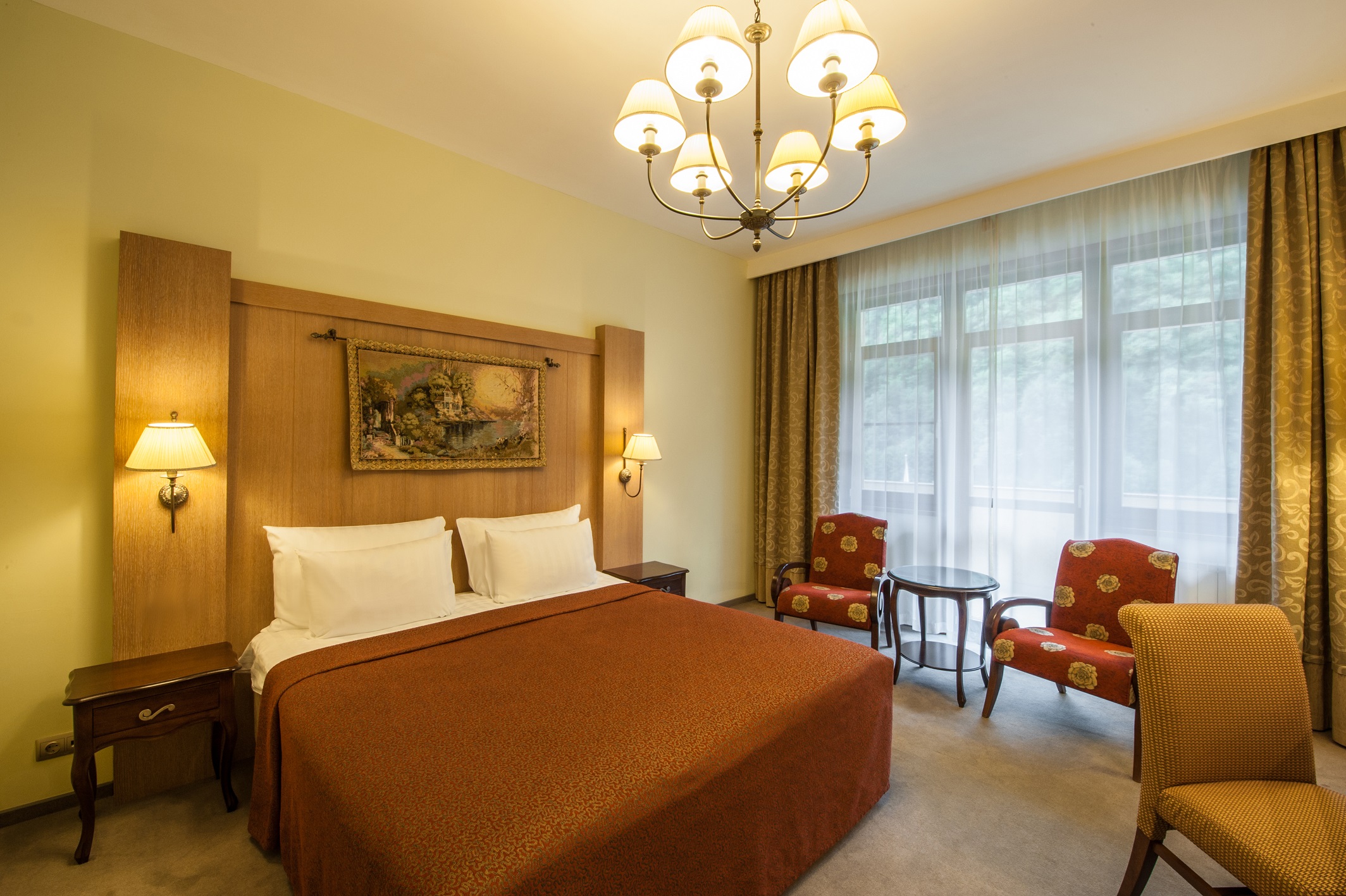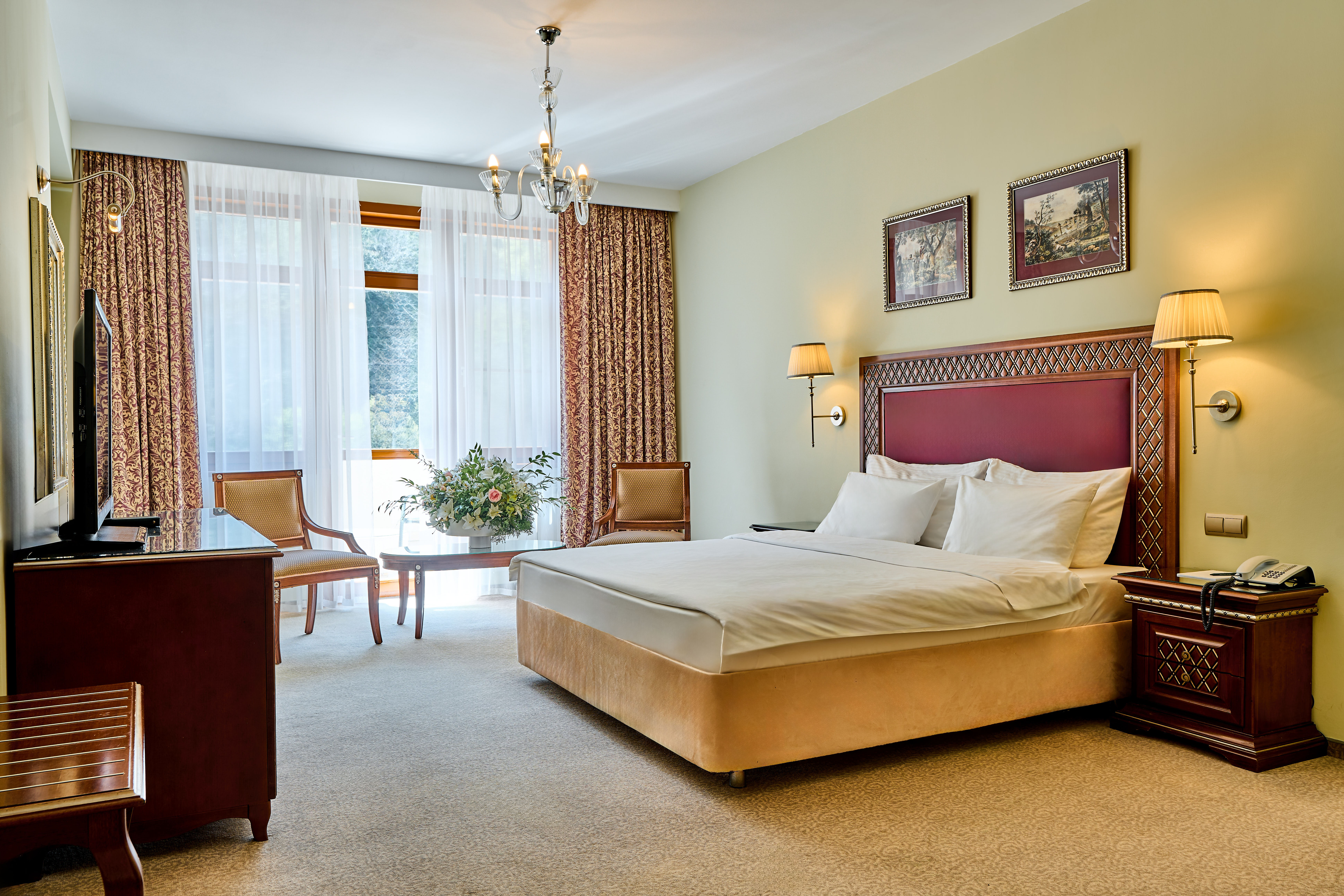 413 уютных номеров, деревянные виллы, бары и рестораны с кухней из сезонных продуктов. В составе гостиничного комплекса также имеются 9 конференц-залов и детские клубы, 2 крытых и 2 открытых бассейна, теннисные корты, спортивные площадки, залы и бойцовский клуб. Для гостей доступны канатные дороги и горнолыжные трассы мирового уровня, экскурсионные и развлекательные программы.