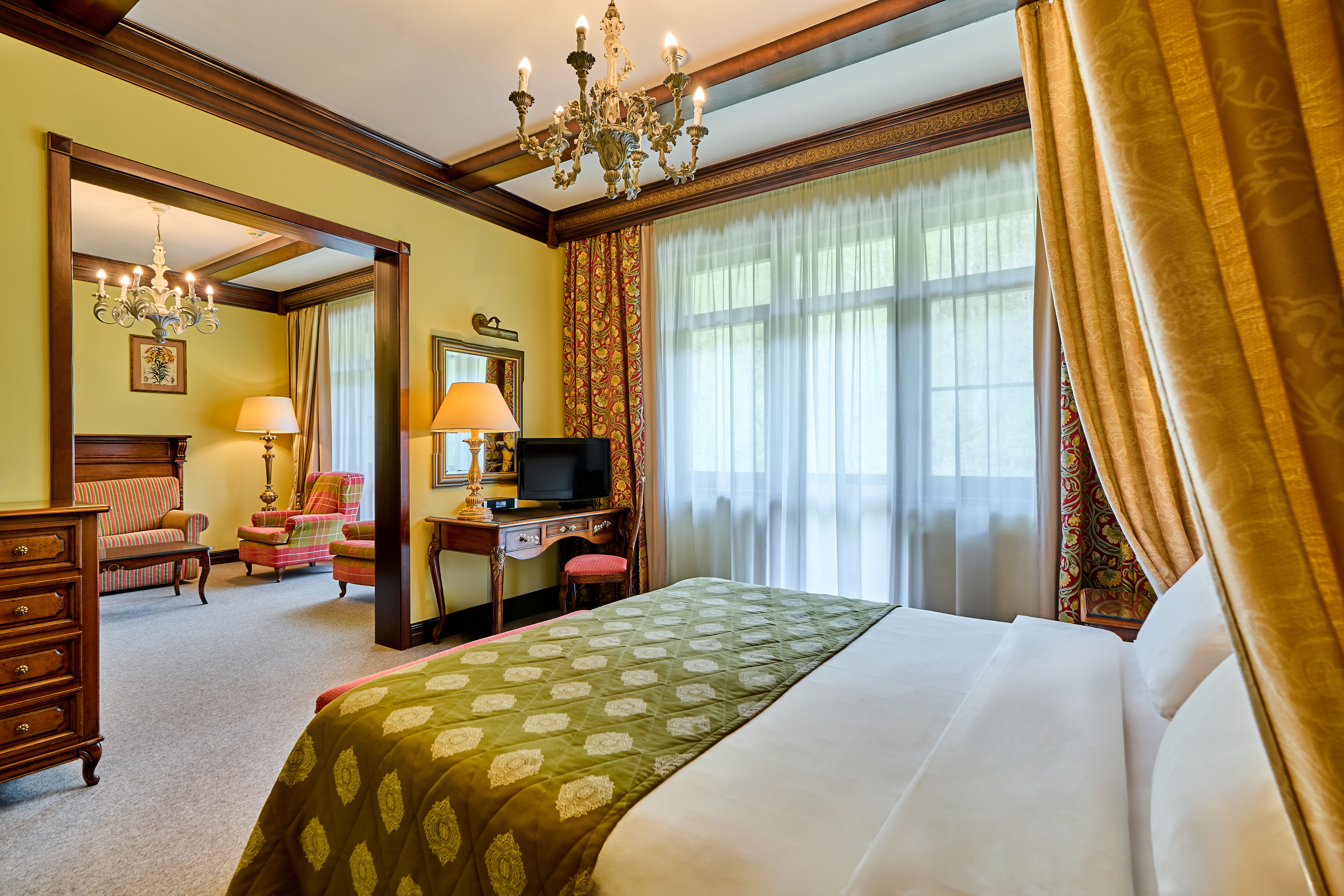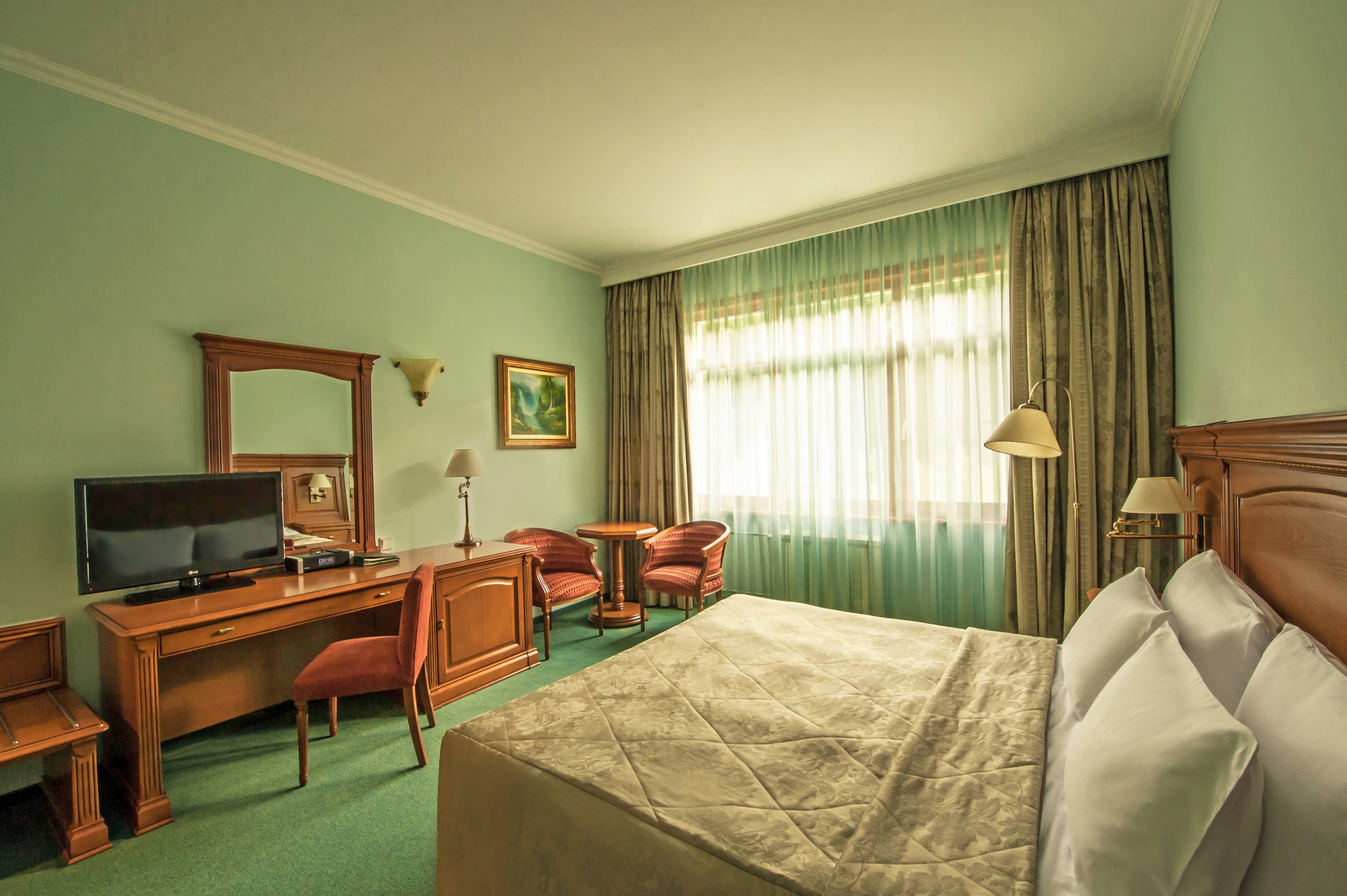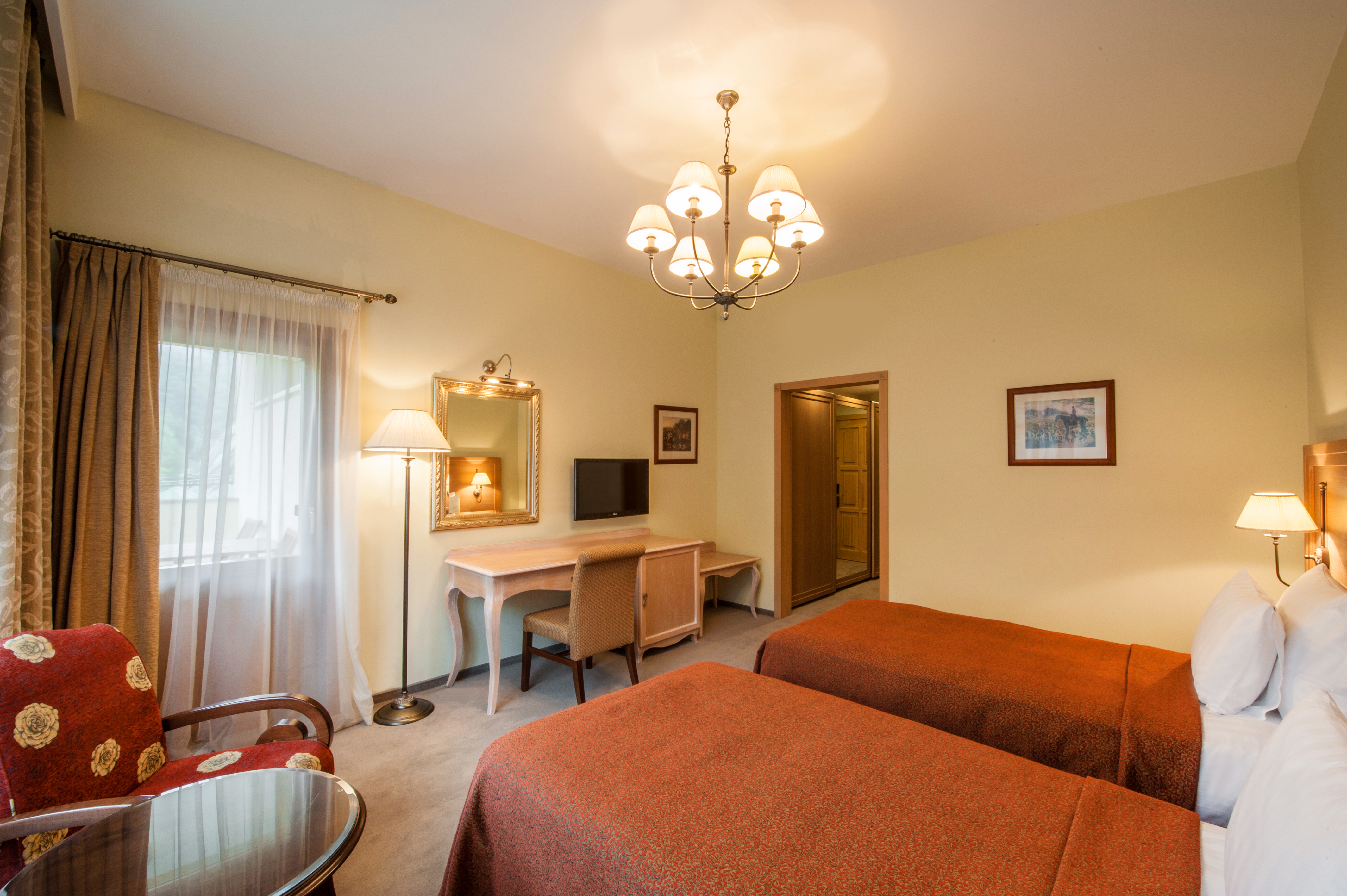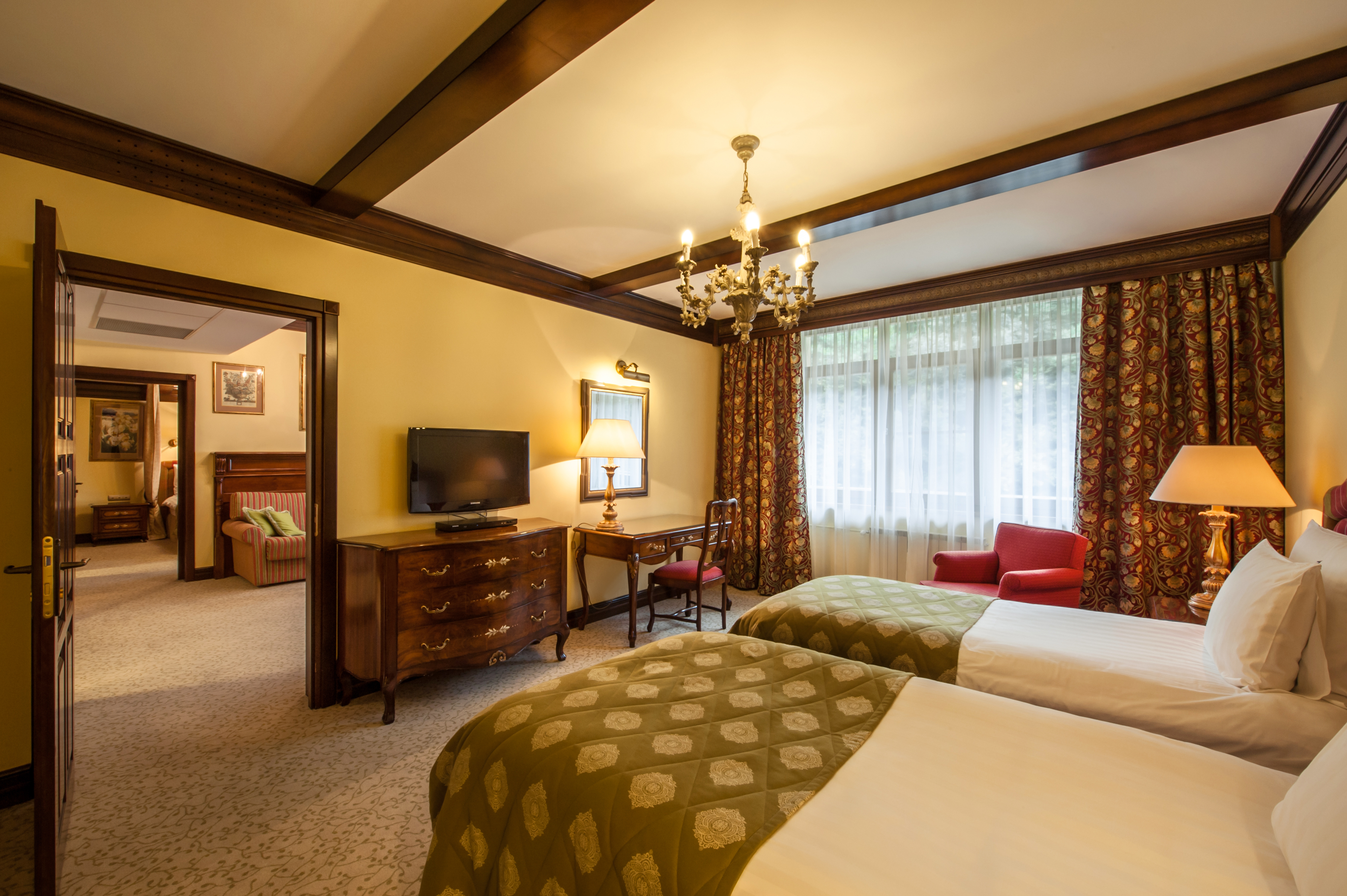 Расположение номера: Корпус A, C Вид из номера: На горную реку Ачипсе и горы Покрытие пола: Ковролин Наполнение мини-бара: по желанию гостя (платно) Уборка в номере: ежедневно Смена белья: 1 раз в 2 дня Дополнительные услуги: Акустическая система ihome, Комплекты полотенец, Балконная мебель Двухкомнатные номера станут идеальным решением для респектабельной публики. Планировочное решение по разделению пространства на отдельные зоны для сна и отдыха делают каждый номер категории люкс функциональным и уютным. В спальне имеются двуспальная кровать, два санузла и просторная терраса. В гостиной – мягкая мебель и журнальный столик. Все номера категории люкс в корпусах «А» и «С» имеют просторный балкон.<br /> <br /> Максимальное количество гостей: 3 взрослых и ребенок до 11 лет (2 осн. и 2 доп. места).<br /> Дополнительное место: раскладывающийся диван.<br /> Ребенок до 4-х лет (вкл.) с представлением места (детская кроватка или еврораскладушка) и питания размещаются - бесплатно.<br /> Детская кроватка предоставляется бесплатно (по запросу).<br /> <br /> "Люкс": номер без дополнительного спального места.<br /> "Люкс с доп. местом": номер с дополнительным спальным местом.  |