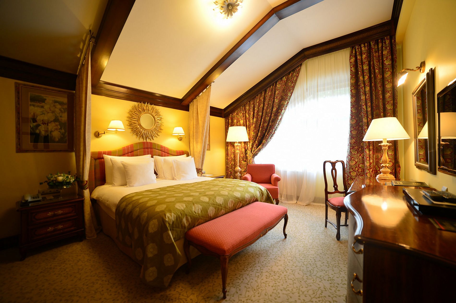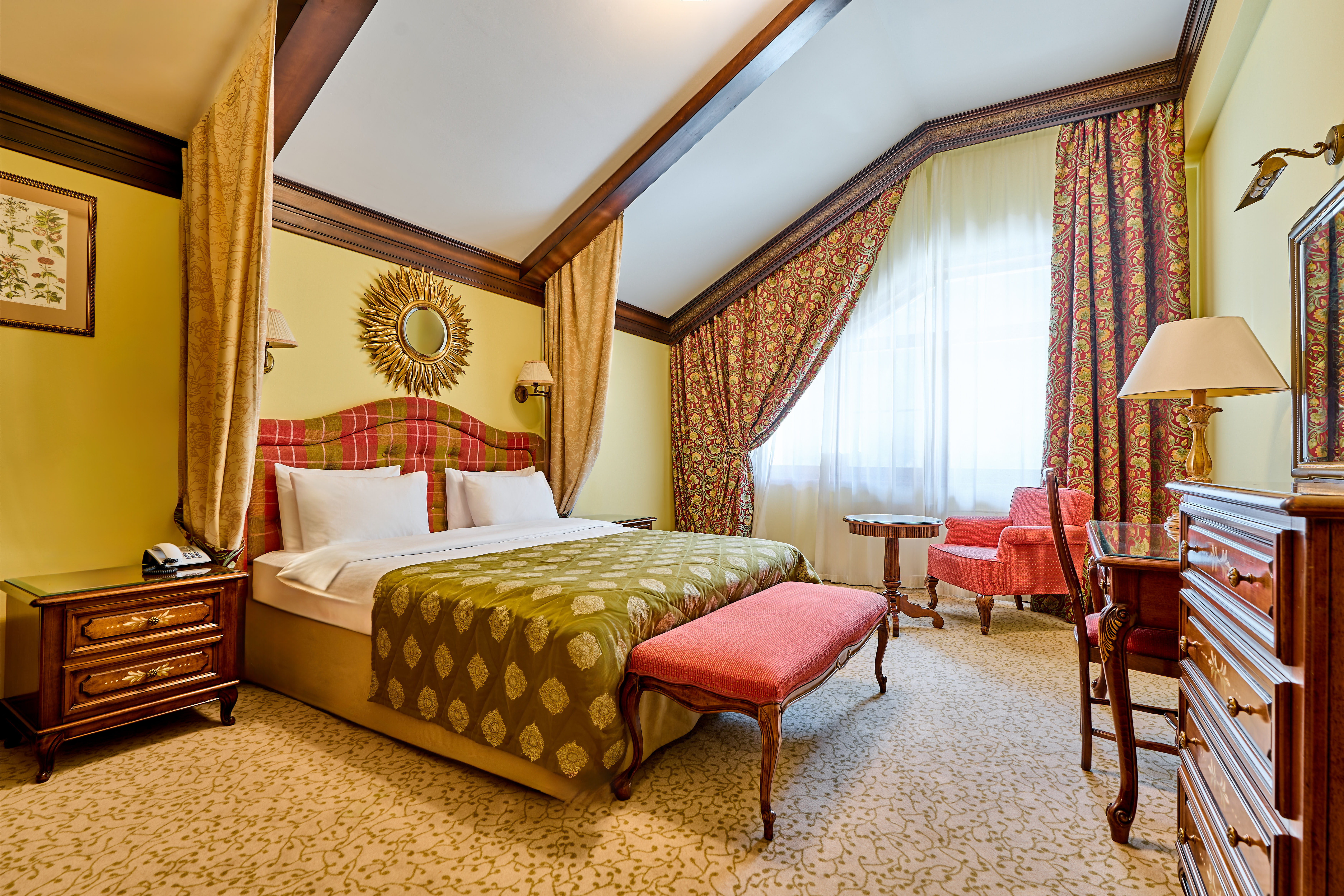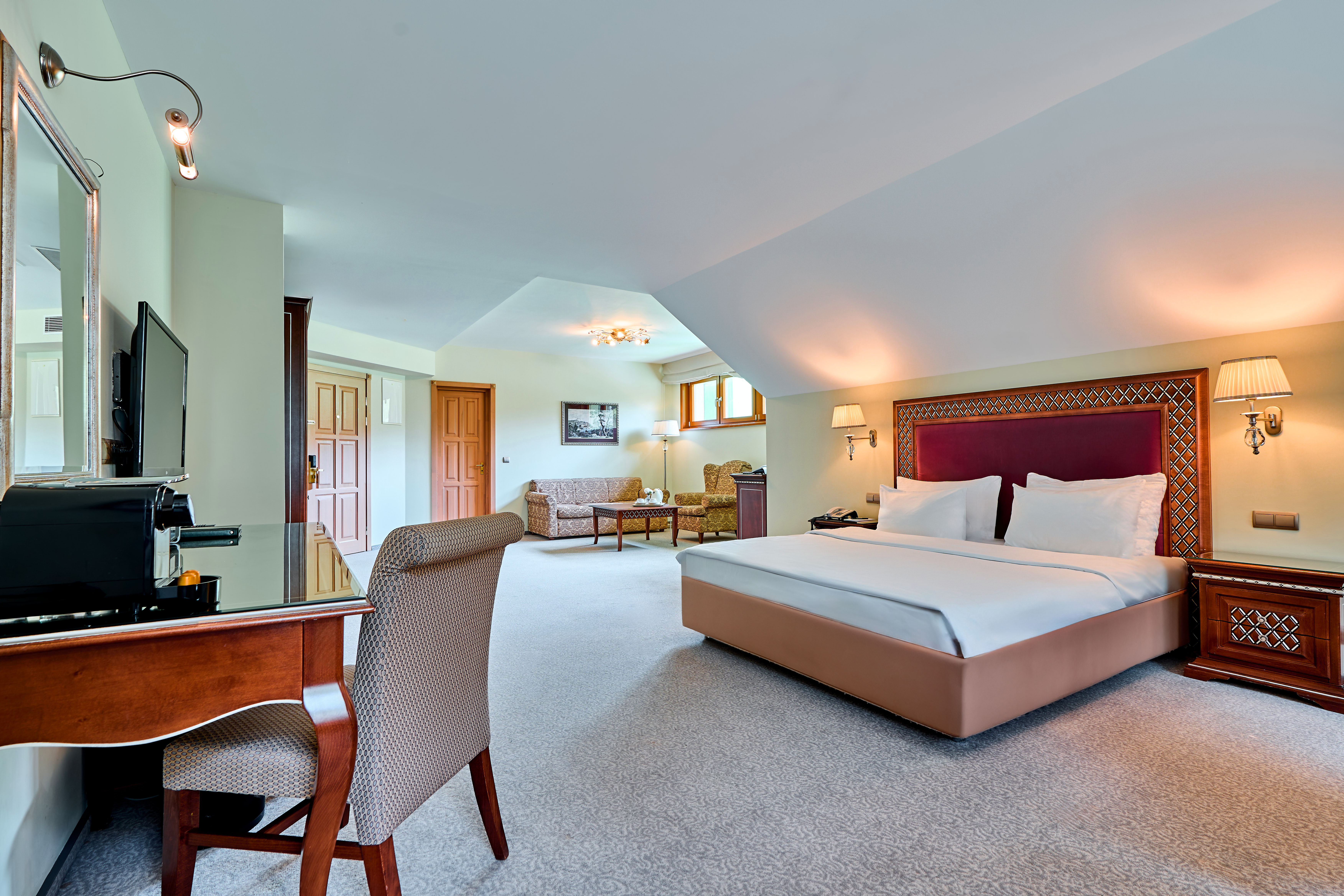 Комментарии: Площадь номера: 32-37 кв.м.<br /> <br /> Номер мансардный без балкона в корпусе А.<br /> <br /> Максимальное количество гостей: 3 взрослых (2 осн. + 1 доп. место).<br /> Дополнительное место - еврораскладушка.<br /> Ребенок до 4-х лет (вкл.) с представлением места (детская кроватка или еврораскладушка) и питания размещаются - бесплатно.<br /> Детская кроватка предоставляется бесплатно (по запросу).<br /> <br /> "Делюкс Кинг Мансарда А" - номер без дополнительного спального места.<br /> "Делюкс Кинг Мансарда А с доп местом" - номер с дополнительным спальным местом.