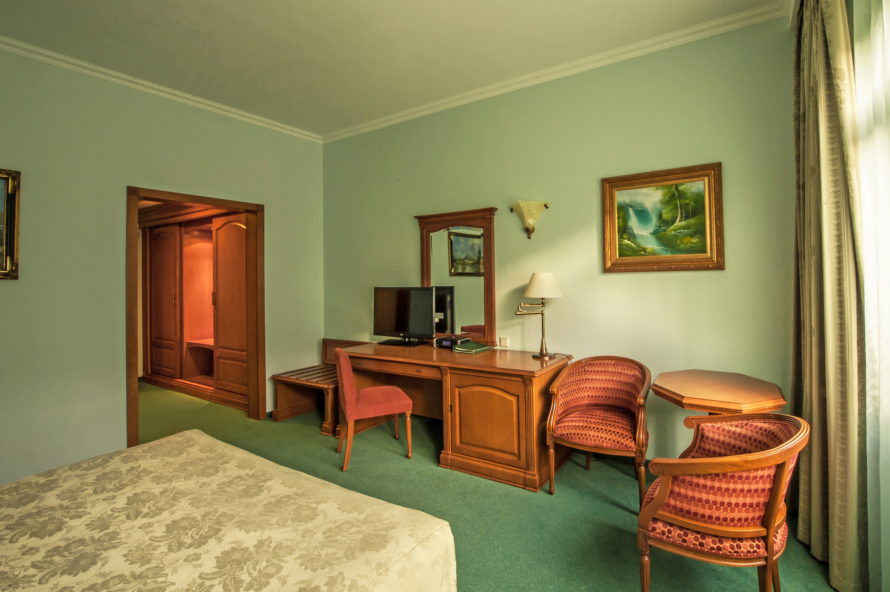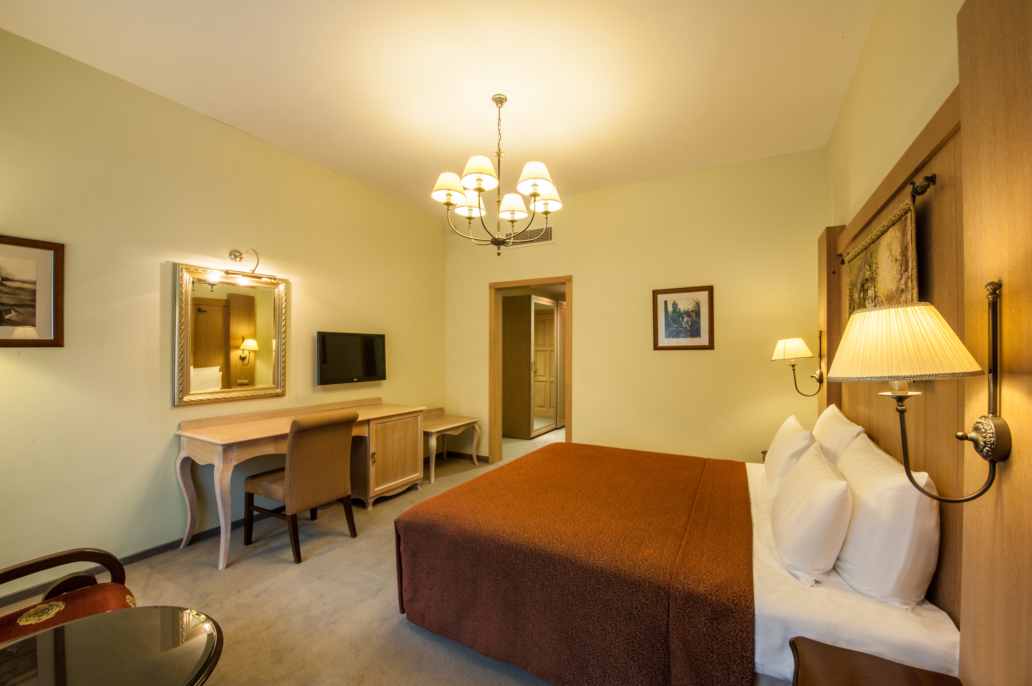 Комментарии: Площадь номера: 32-37 кв.м.<br /> <br /> Номер без балкона в корпусе А.<br /> <br /> Максимальное количество гостей: 3 взрослых (2 осн. + 1 доп. место).<br /> Дополнительное место - еврораскладушка.<br /> Ребенок до 4-х лет (вкл.) с представлением места (детская кроватка или еврораскладушка) и питания размещаются - бесплатно.<br /> Детская кроватка предоставляется бесплатно (по запросу).<br /> <br /> "Делюкс Кинг А" - номер без дополнительного спального места.<br /> "Делюкс Кинг А с доп местом" - номер с дополнительным спальным местом.