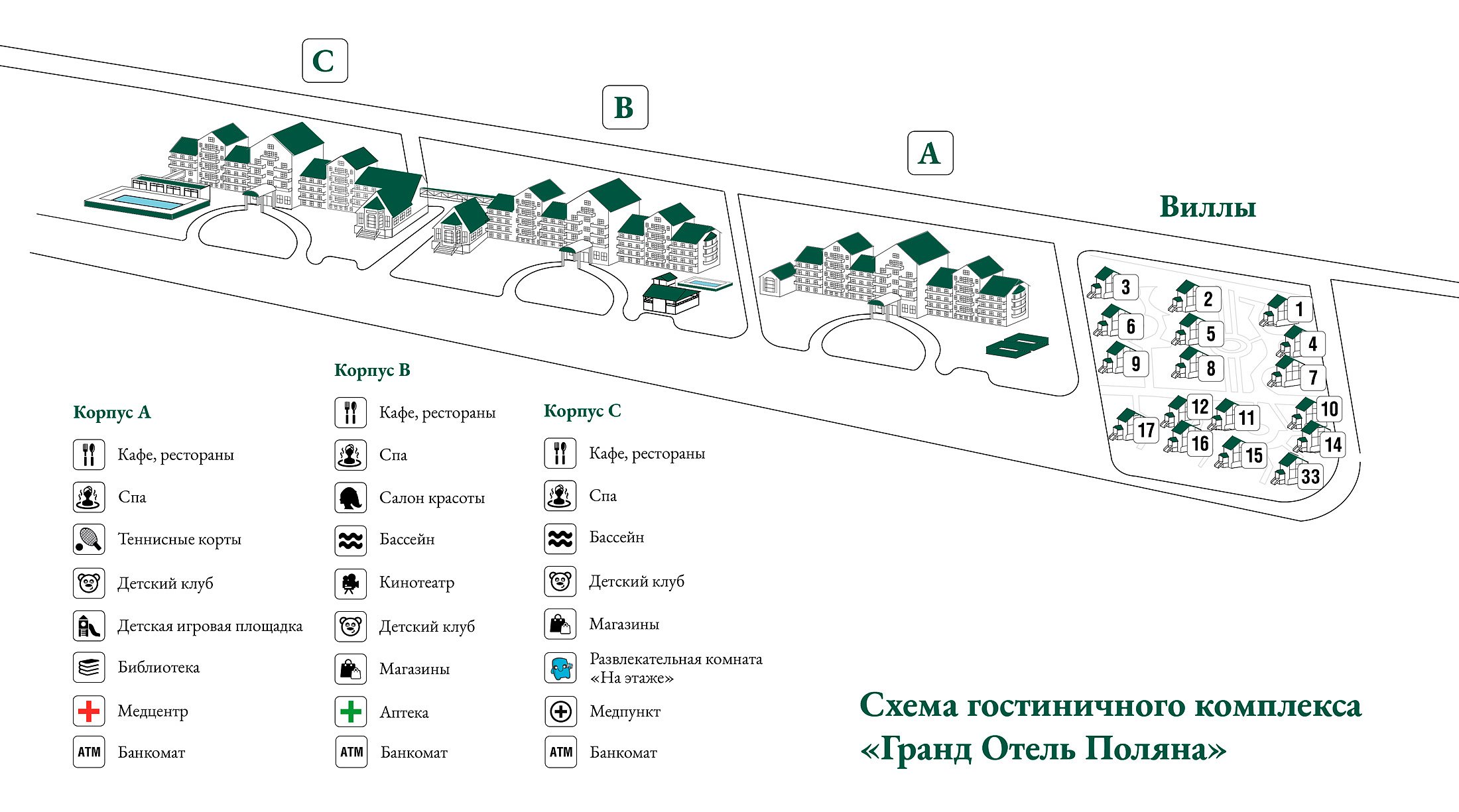 | Количество корпусов | корпуса «А», «В» и «С», 17 вилл |