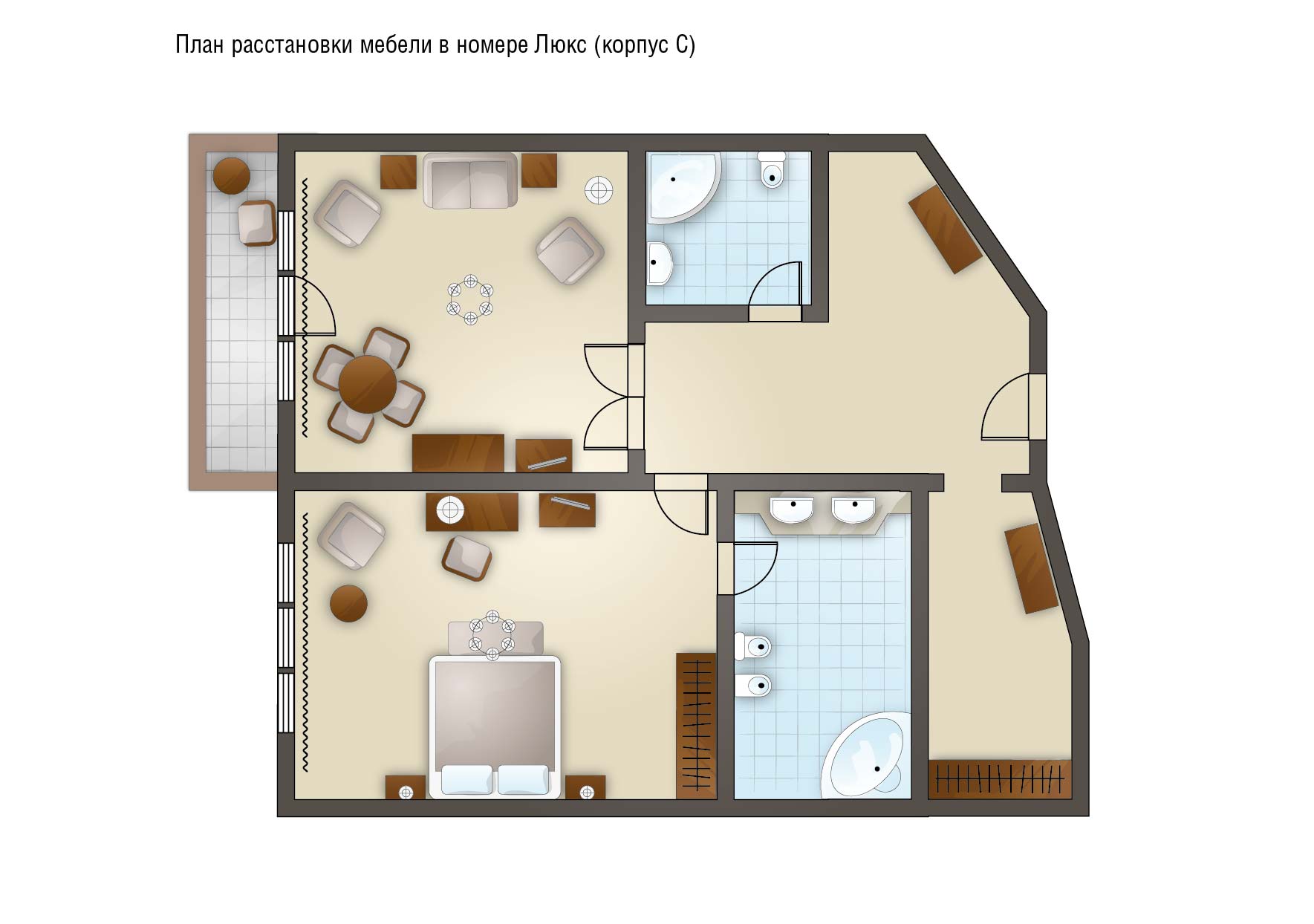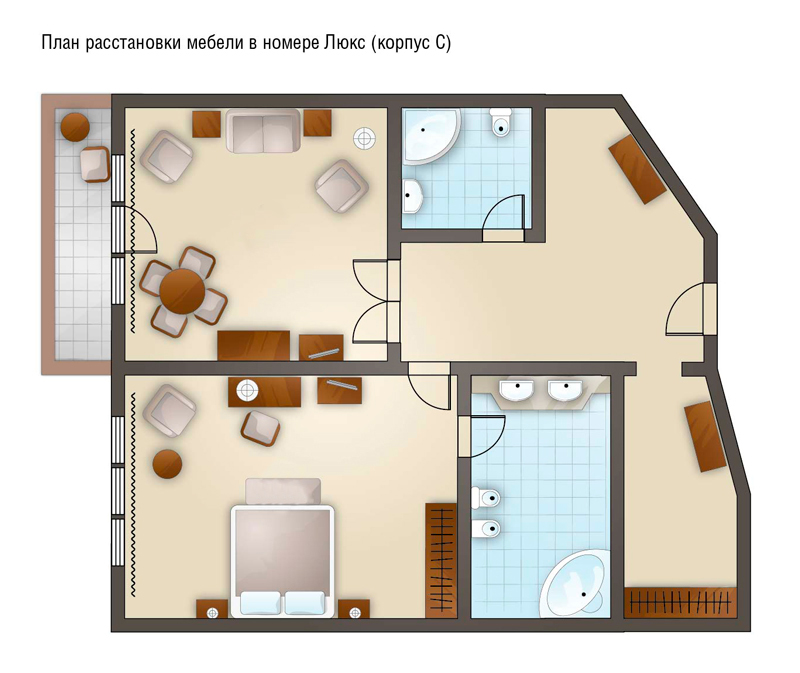 Комментарии: Двухкомнатные номера станут идеальным решением для респектабельной публики. Планировочное решение по разделению пространства на отдельные зоны для сна и отдыха делают каждый номер категории люкс функциональным и уютным. В спальне имеются двуспальная кровать, два санузла и просторная терраса. В гостиной – мягкая мебель и журнальный столик. Все номера категории люкс в корпусах «А» и «С» имеют просторный балкон.<br /> <br /> Максимальное количество гостей: 3 взрослых и ребенок до 11 лет (2 осн. и 2 доп. места).<br /> Дополнительное место: раскладывающийся диван.<br /> Ребенок до 4-х лет (вкл.) с представлением места (детская кроватка или еврораскладушка) и питания размещаются - бесплатно.<br /> Детская кроватка предоставляется бесплатно (по запросу).<br /> <br /> "Люкс": номер без дополнительного спального места.<br /> "Люкс с доп. местом": номер с дополнительным спальным местом.