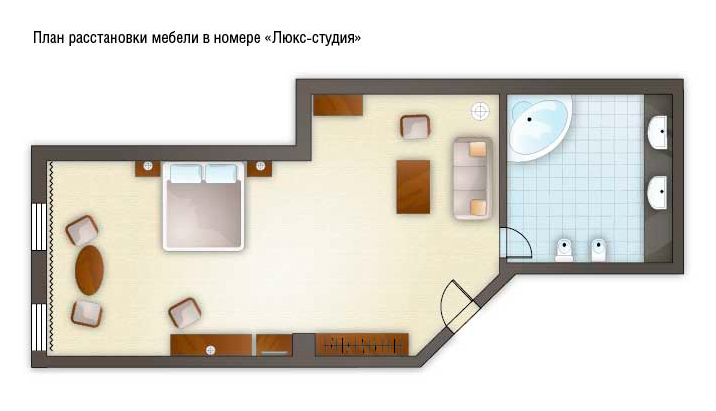 Комментарии: Просторные однокомнатные номера отличаются необычным планировочным решением и декором. Потолок мансардного типа, изысканная спальня с бронзовыми светильниками и широкой двуспальной кроватью, обилие света и чистота пространства дарят ощущение легкости и спокойствия, а наличие необходимой техники и Hi-Fi системы делают номера этой категории не только комфортными, но и функциональными.<br /> <br /> Часть номеров оборудованы балконами.<br /> <br /> Максимальное количество гостей: 4 взрослых (2 осн. + 2 доп. места).<br /> Дополнительное место - раскладывающийся диван.<br /> Ребенок до 4-х лет (вкл.) с представлением места (детская кроватка или диван) и питания размещаются - бесплатно.<br /> Детская кроватка предоставляется бесплатно (по запросу).<br /> <br /> "Люкс Студия": номер без дополнительного спального места.<br /> "Люкс Студия с доп. местом": номер с дополнительным спальным местом.