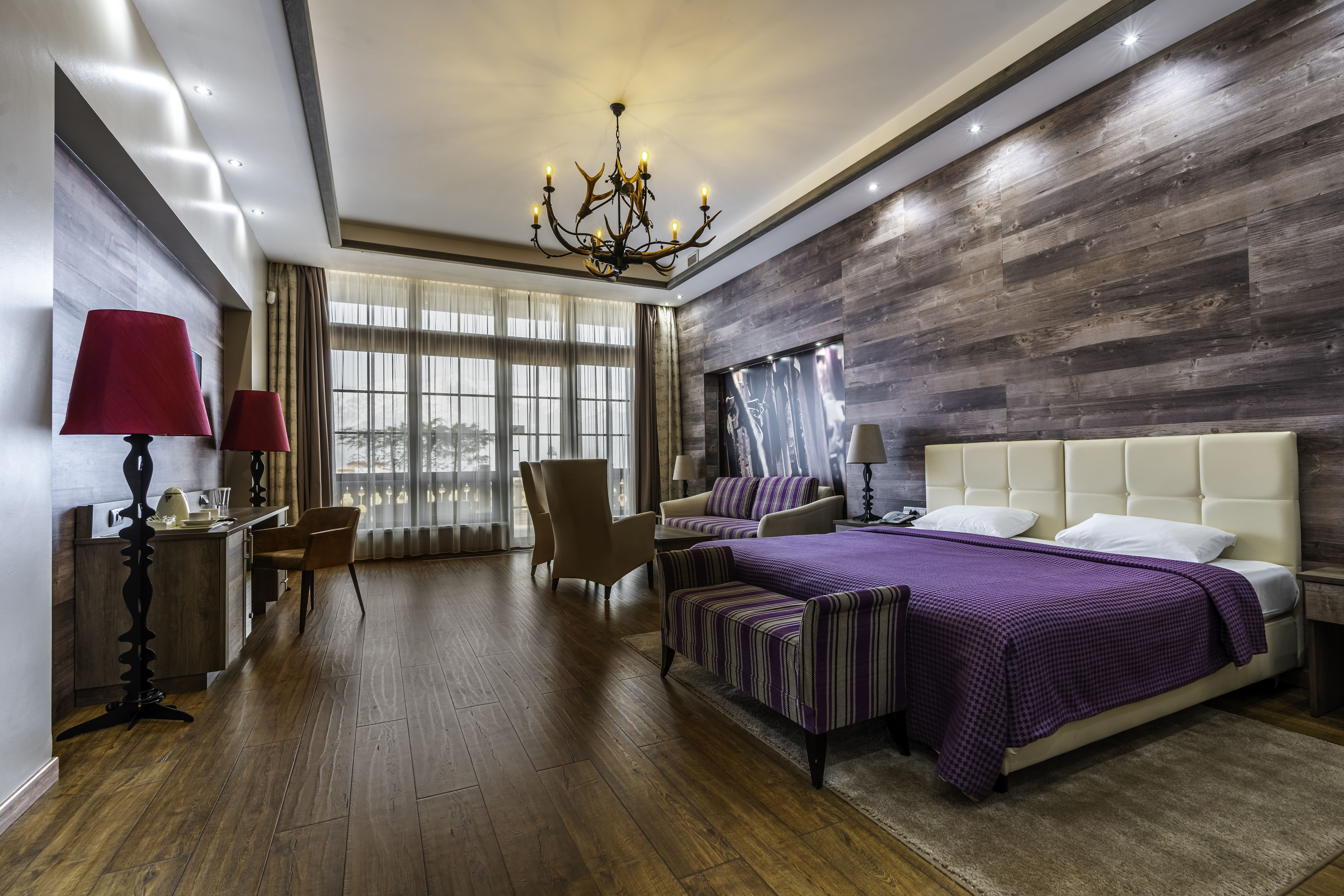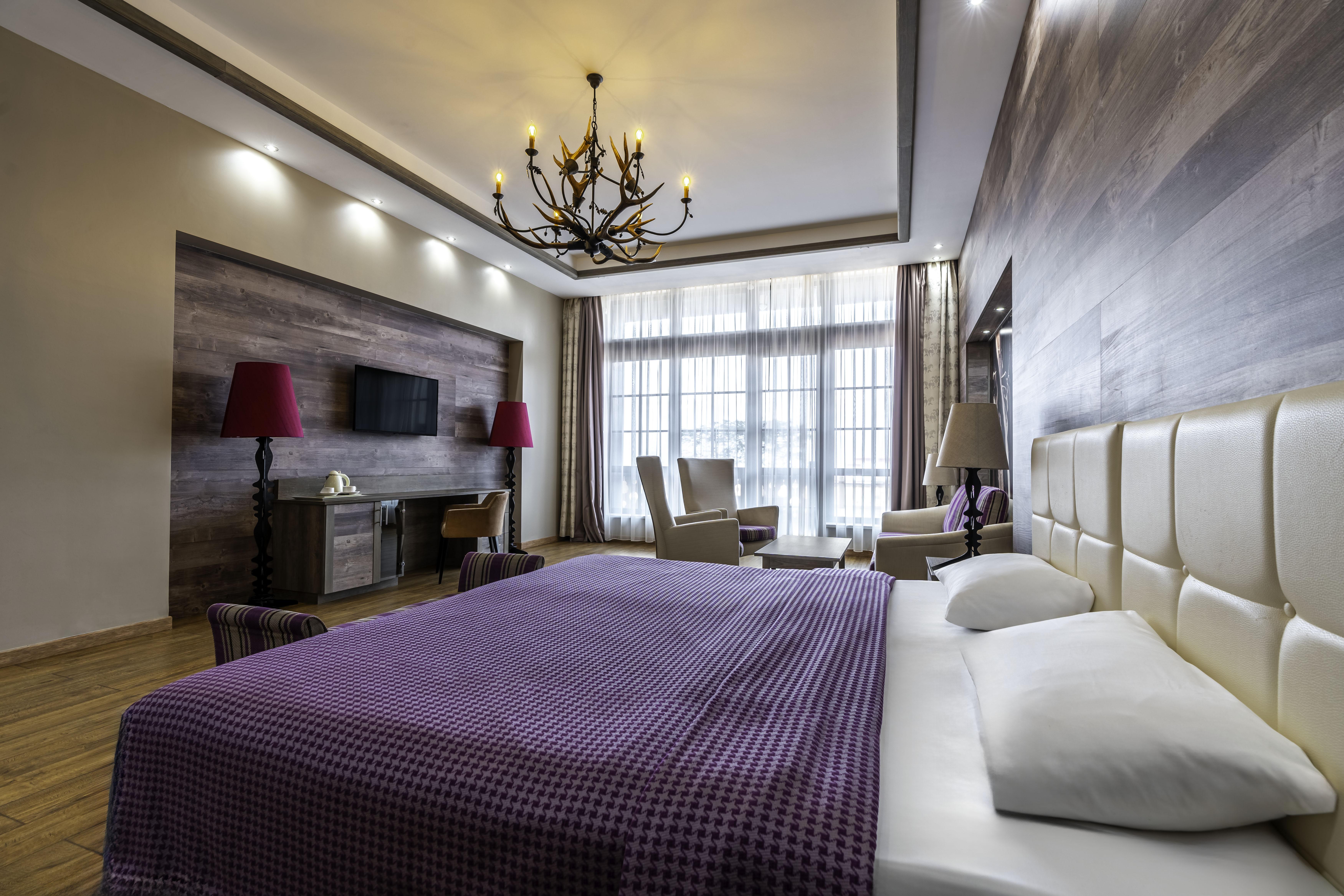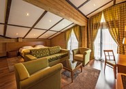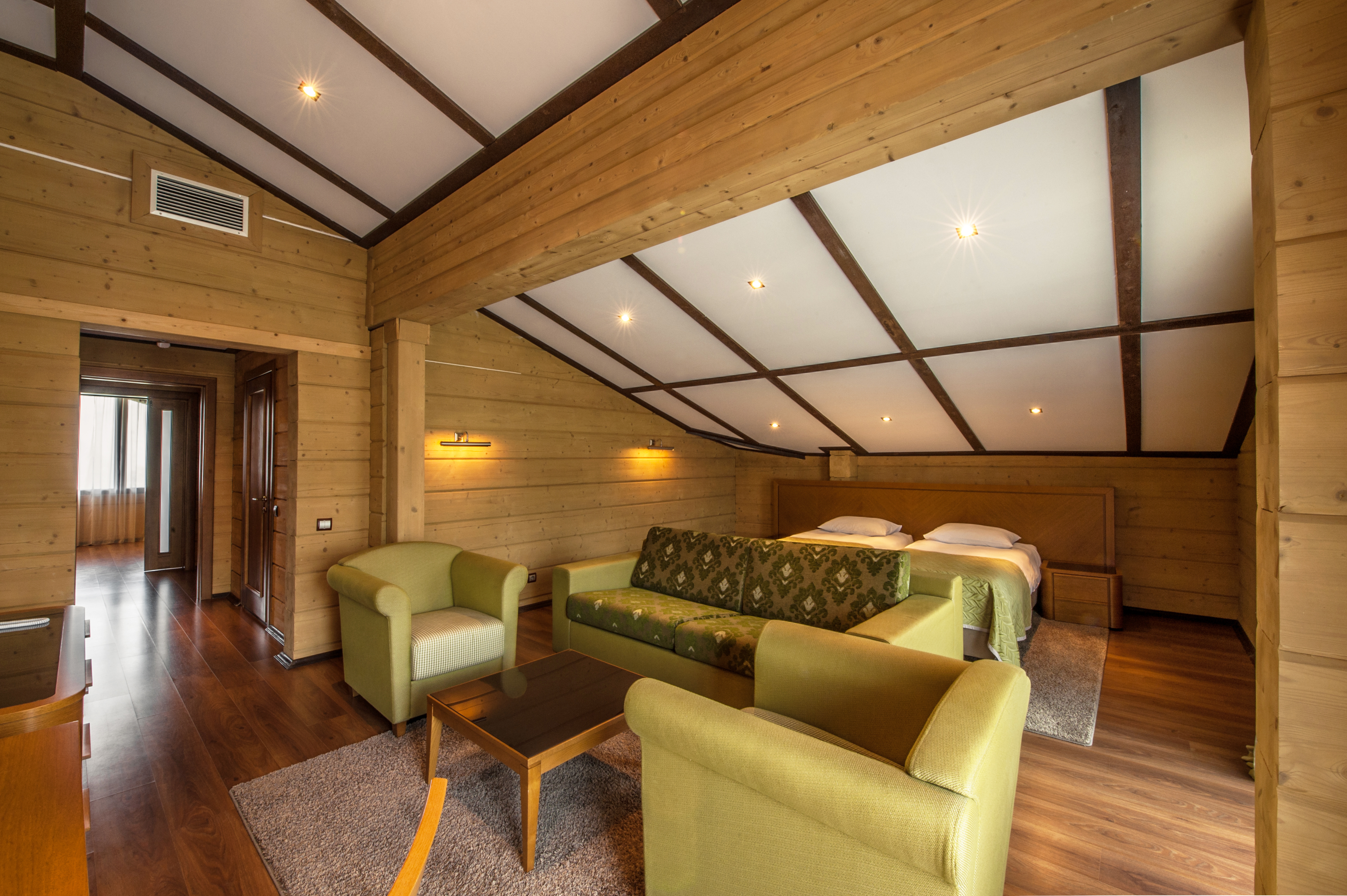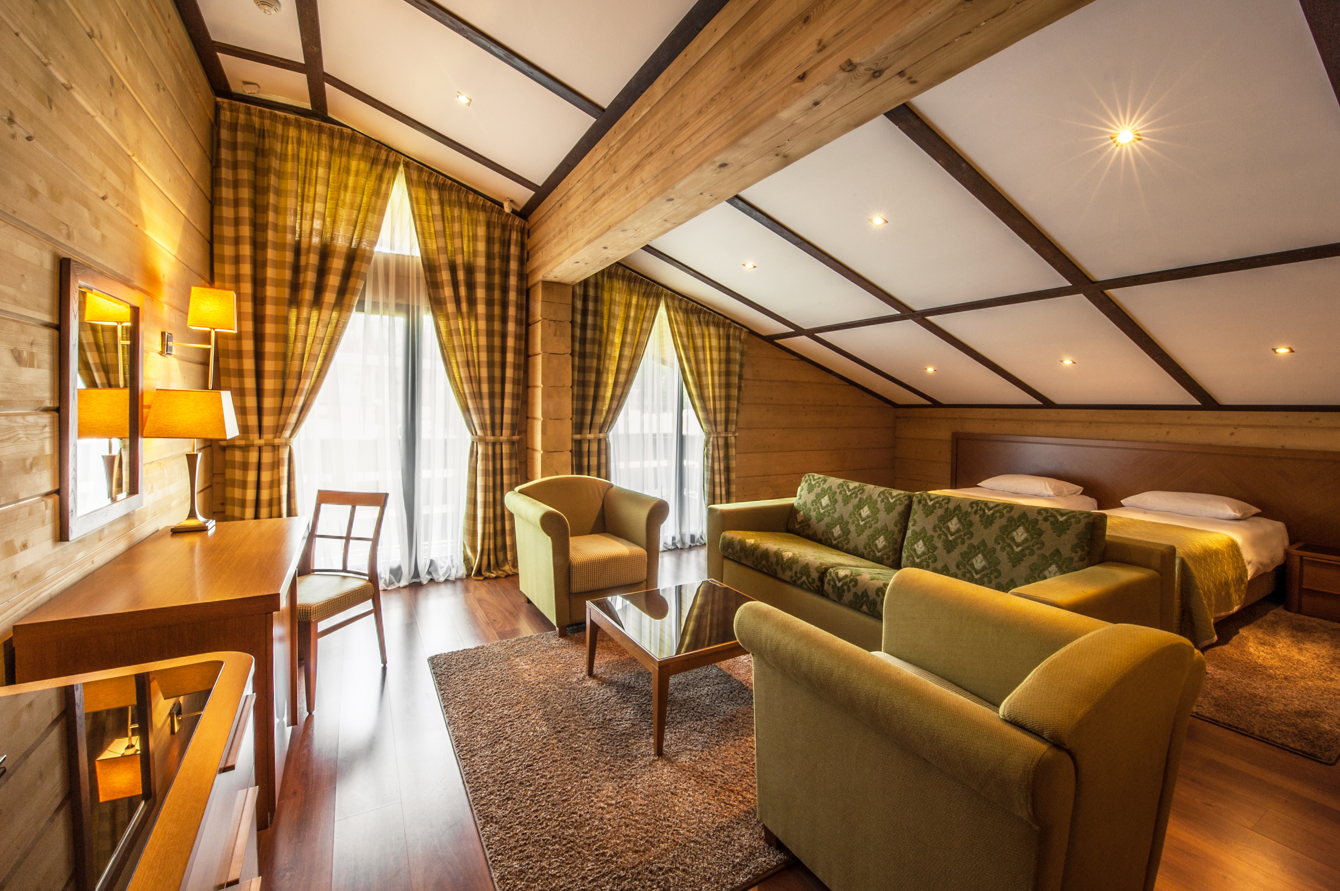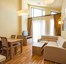 Вид из номера: На горы Покрытие пола: Ламинат Наполнение мини-бара: по желанию гостя Уборка в номере: ежедневно Смена белья: 1 раз в 3 дня Дополнительные услуги: Ортопедические матрасы, пледы, махровые салфетки, набор принадлежностей для ванных комнат, комплекты полотенец Однокомнатный номер состоит из спальни с ареалом гостиной и совмещенной туалетной комнаты с душевой кабиной и ванной.<br /> В номере расположены 2 полутороспальные кровати с матрасами-конструкторами, кушетка, 2 прикроватные тумбочки, телефон, трюмо с зеркалом.<br /> В ареале гостиной – раскладной диван, 2 мягких кресла, журнальный стол, классические настольная и напольная лампы, офисный стол со встроенным мини-баром, стул, плазменный LCD-телевизор с возможностью выхода в интернет. Интерьер выполнен в сиренево-фиолетовых или бардовых тонах. Комната освещена большой люстрой в виде оленьих рогов и точечным освещением по периметру комнаты. Есть выход на общую террасу, панорамные окна.<br /> <br /> "Полулюкс" - номер без дополнительного спального места.<br /> "Полулюкс с доп. местом" - номер с дополнительным спальным местом.  |