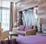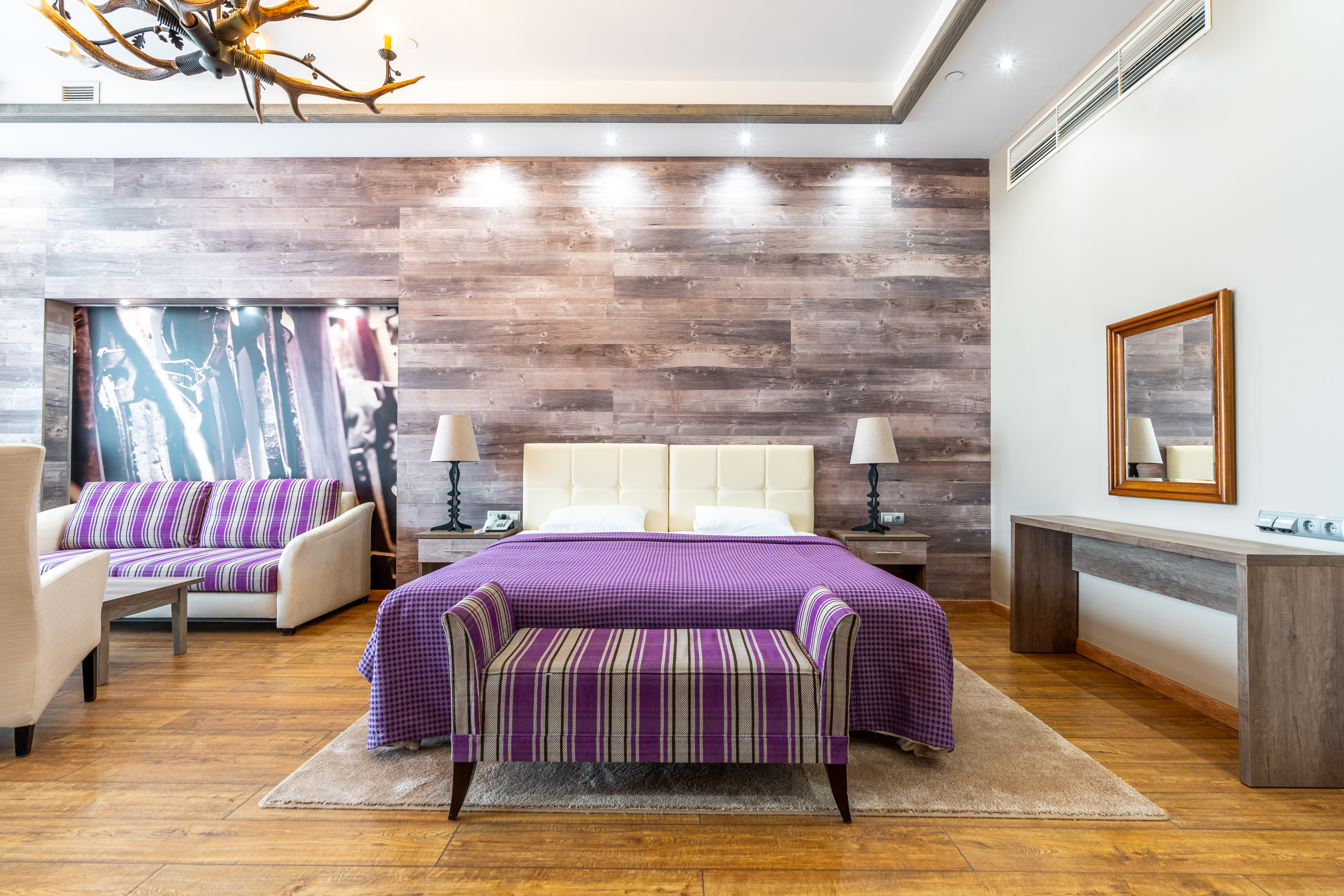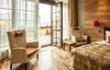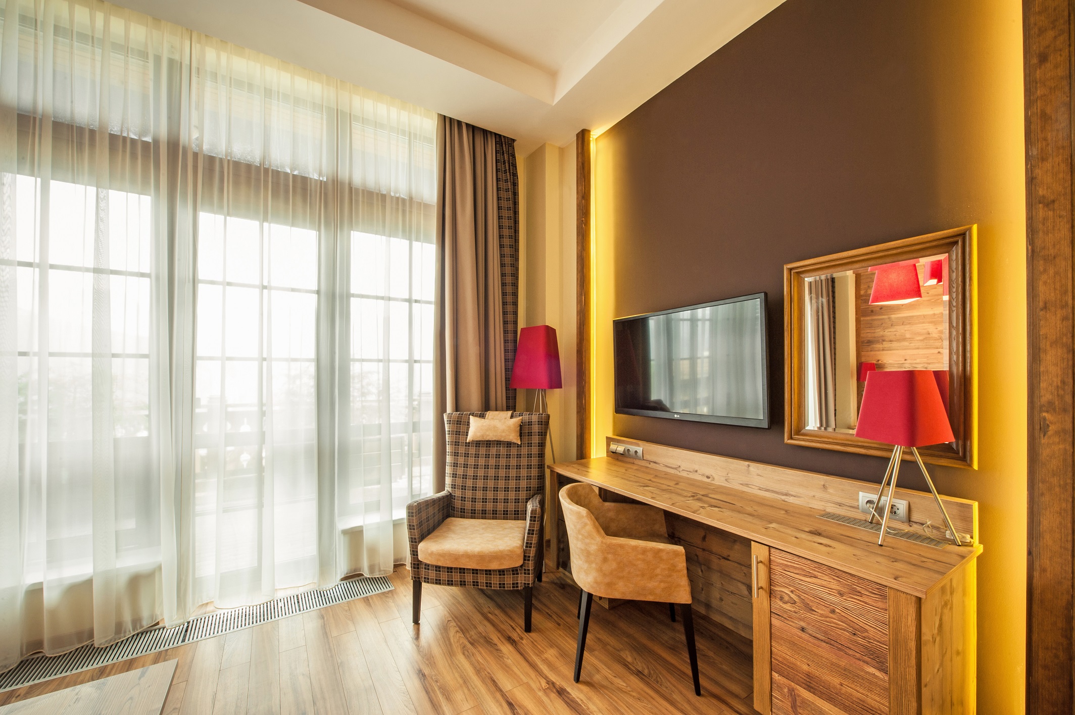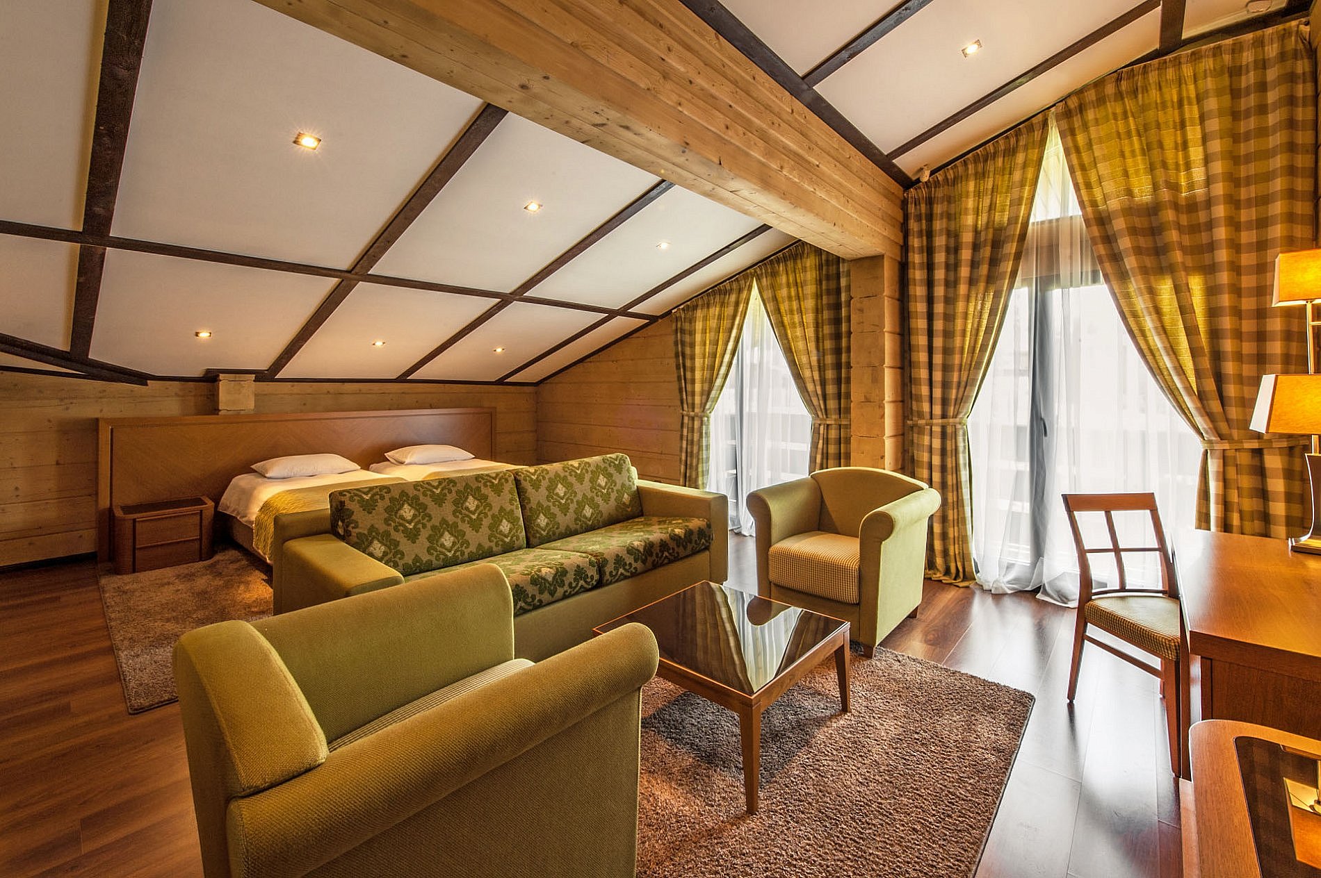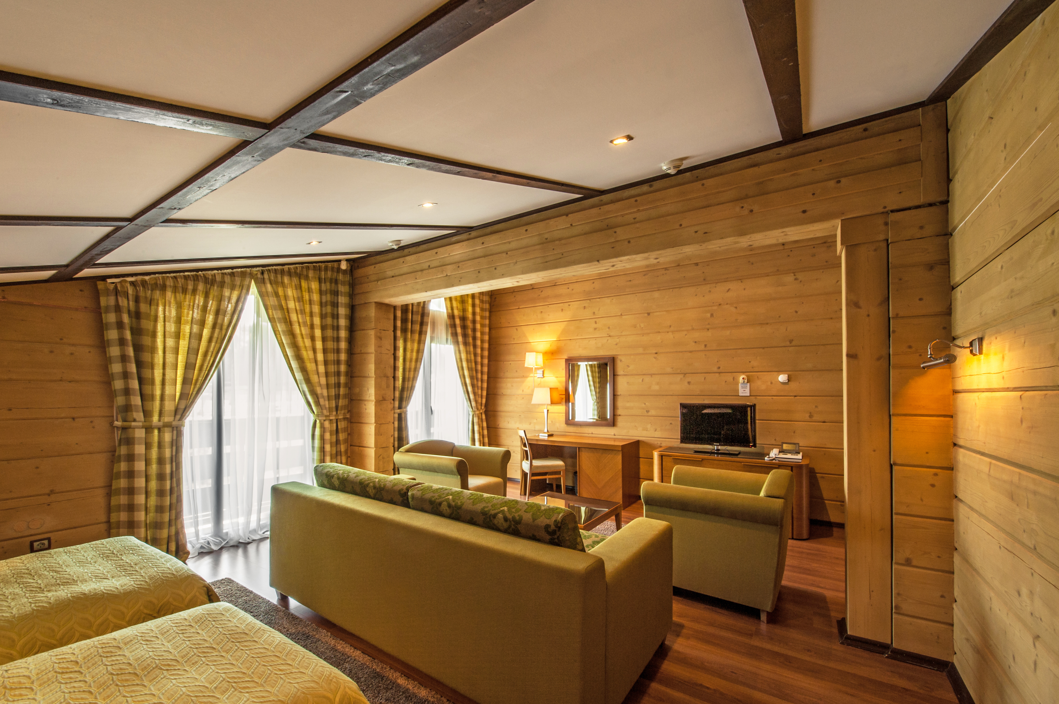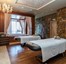 Вид из номера: На горы Покрытие пола: Ламинат Наполнение мини-бара: по желанию гостя Уборка в номере: ежедневно Смена белья: 1 раз в 3 дня Дополнительные услуги: Ортопедические матрасы, пледы, махровые салфетки, набор принадлежностей для ванных комнат, комплекты полотенец Однокомнатный номер состоит из спальни с ареалом гостиной и совмещенной туалетной комнаты с душевой кабиной и ванной.<br /> В номере расположены 2 полутороспальные кровати с матрасами-конструкторами, кушетка, 2 прикроватные тумбочки, телефон, трюмо с зеркалом.<br /> В ареале гостиной – раскладной диван, 2 мягких кресла, журнальный стол, классические настольная и напольная лампы, офисный стол со встроенным мини-баром, стул, плазменный LCD-телевизор с возможностью выхода в интернет. Интерьер выполнен в сиренево-фиолетовых или бардовых тонах. Комната освещена большой люстрой в виде оленьих рогов и точечным освещением по периметру комнаты. Есть выход на общую террасу, панорамные окна.<br /> <br /> "Полулюкс" - номер без дополнительного спального места.<br /> "Полулюкс с доп. местом" - номер с дополнительным спальным местом.  |