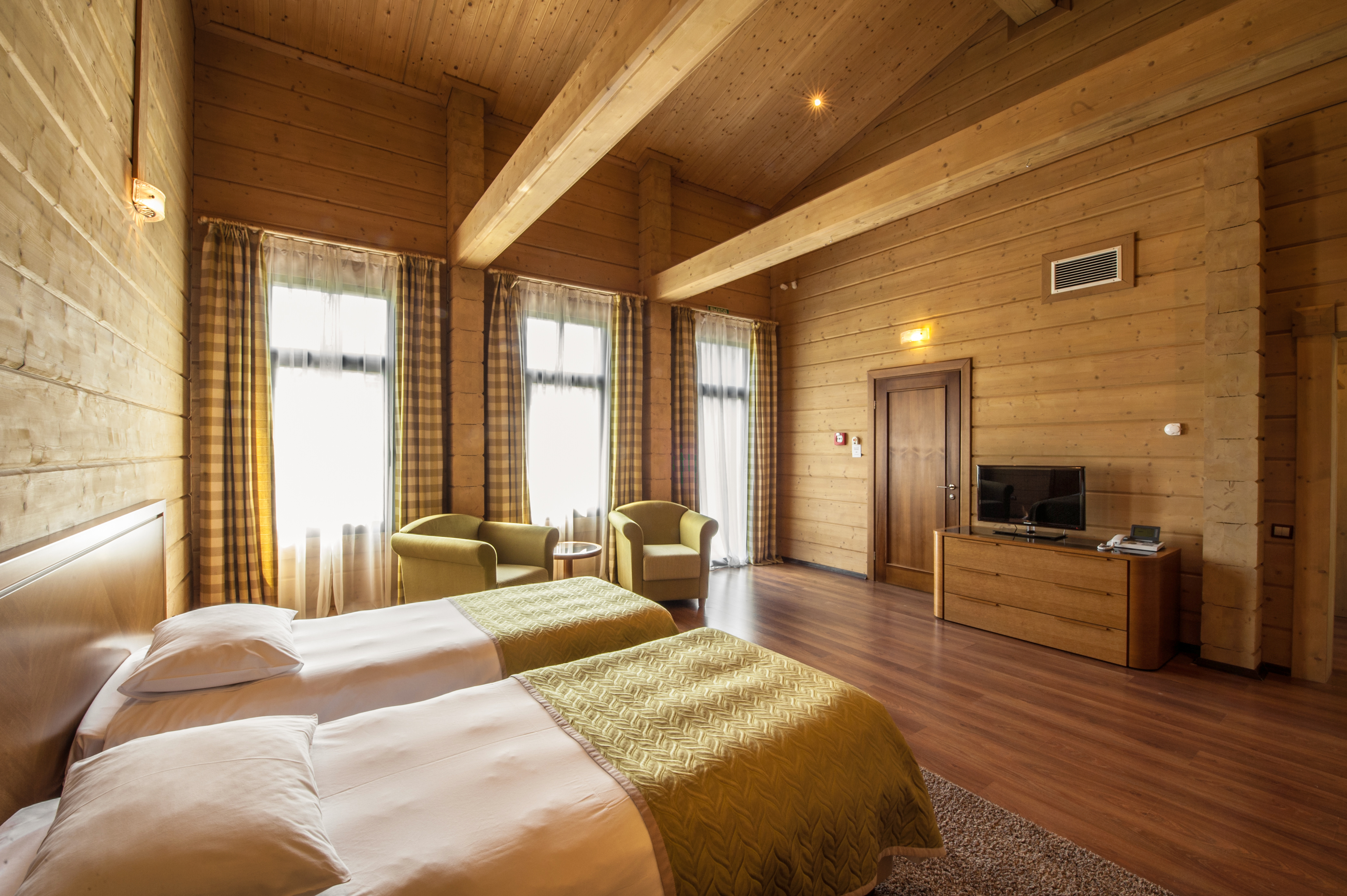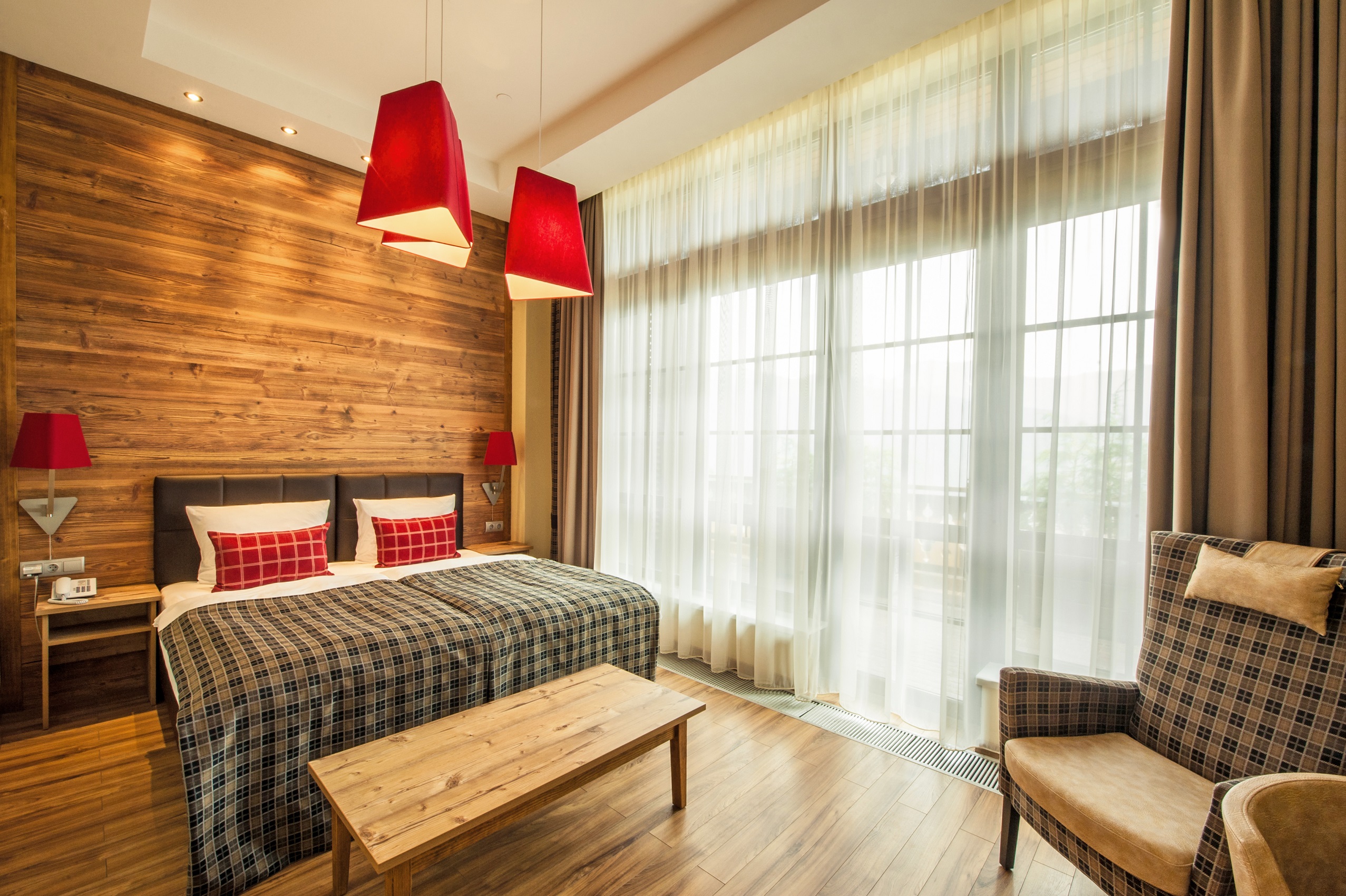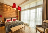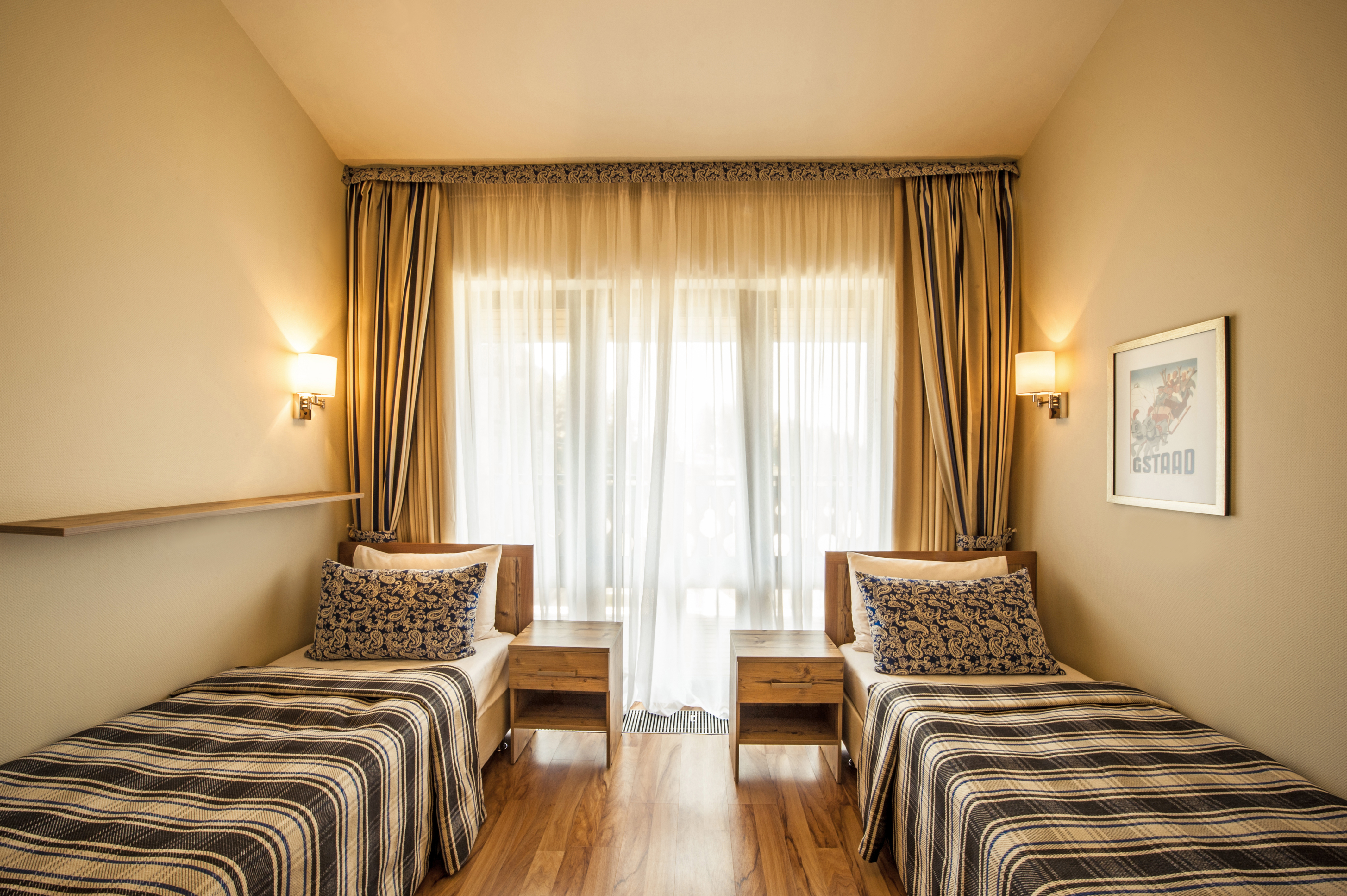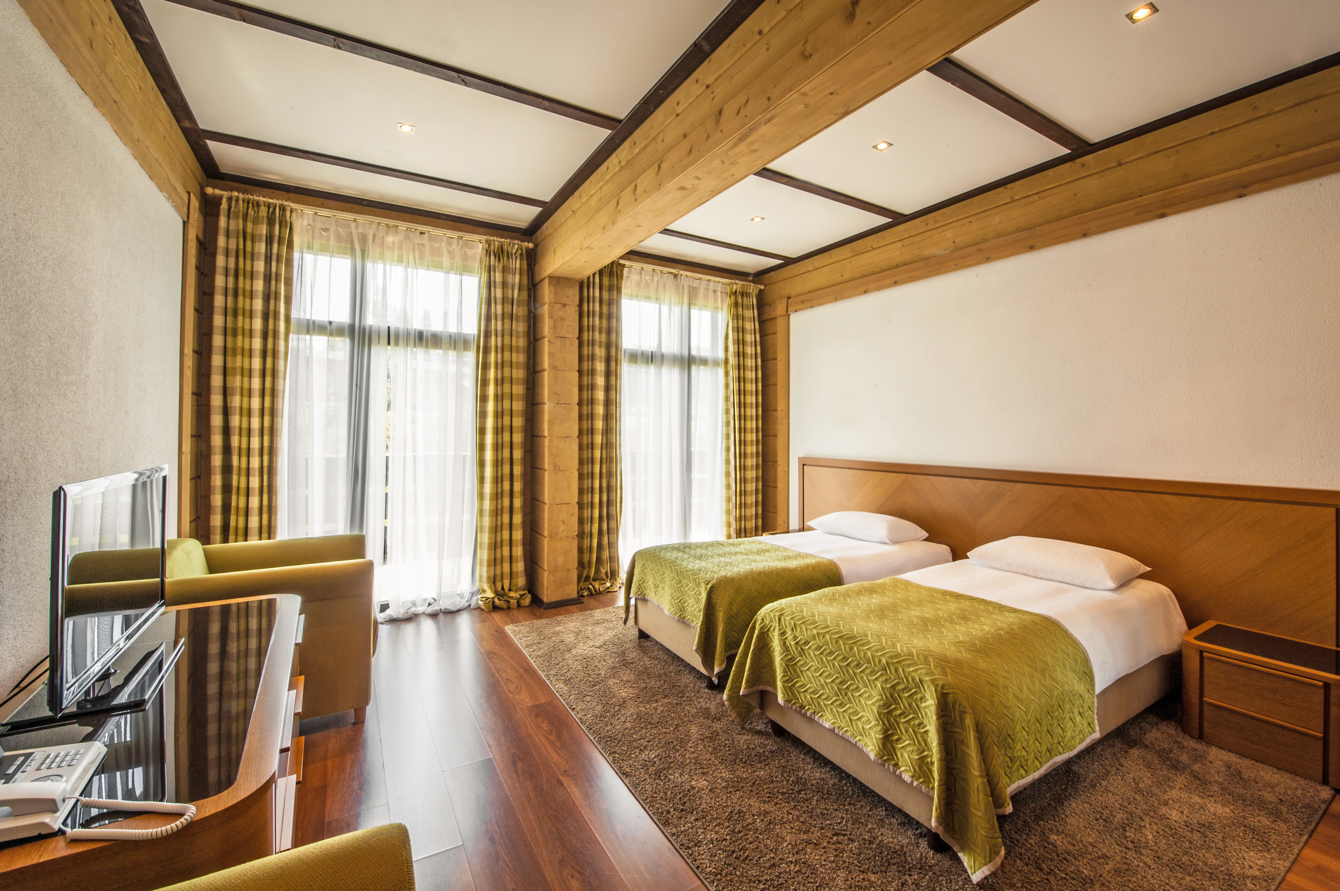 Комментарии: Площадь номера: 16-18 кв.м.<br /> <br /> Однокомнатный номер состоит из спальни и совмещенной туалетной комнаты с душевой кабиной.<br /> В номере расположены 2 полутороспальные кровати с матрасами-конструкторами, которые при необходимости объединяются в размер Queen size. Интерьер оформлен в традиционном альпийском стиле, в светлых тонах. <br /> В номере есть все необходимое: офисный стол со встроенным мини-баром, стул, 1 мягкое кресло, журнальный стол, 2 прикроватные тумбочки, зеркало, телефон, плазменный LCD-телевизор с возможностью выхода в интернет, классические настольная и напольная лампы.<br /> <br /> "Стандарт" - номер без дополнительного спального места.<br /> "Стандарт с доп. местом" - номер с дополнительным спальным местом.