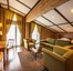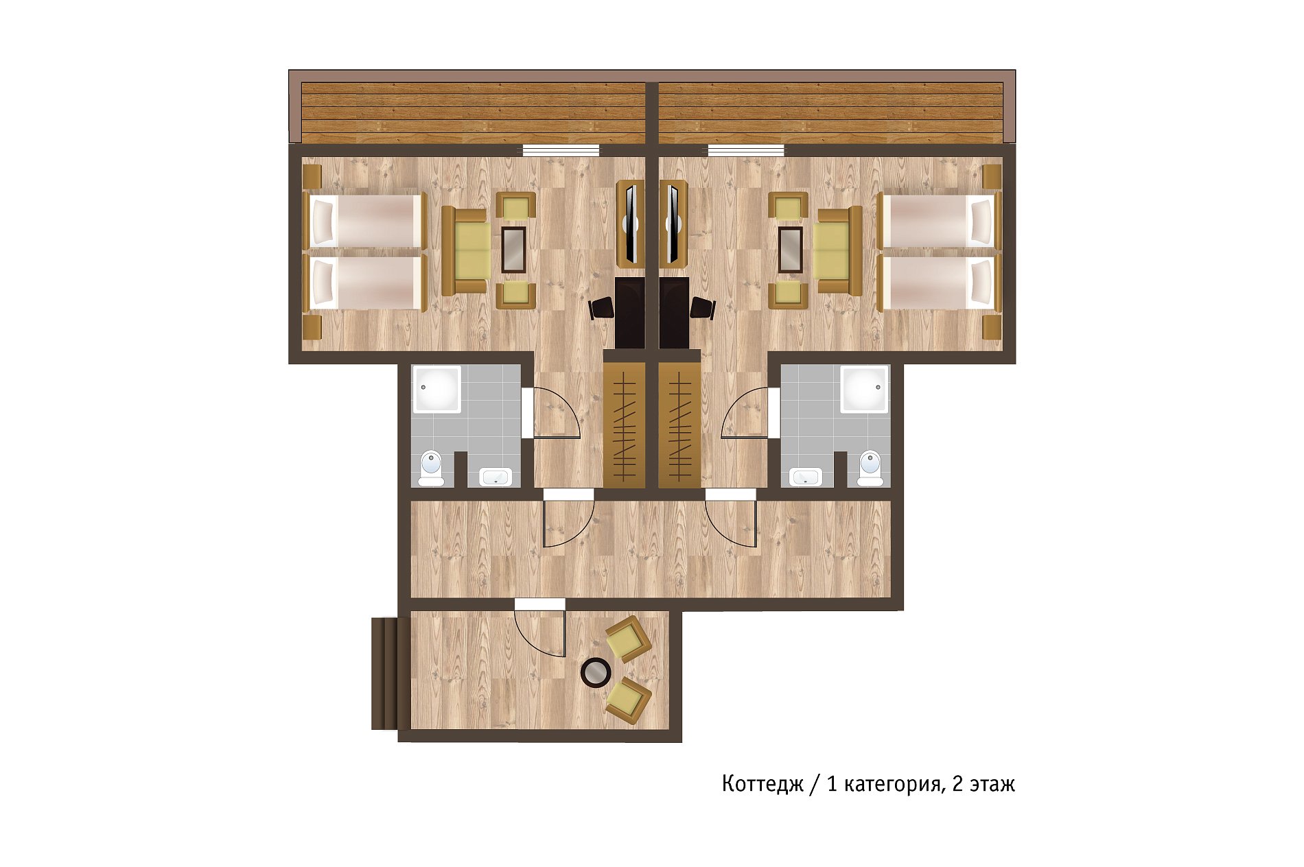 Комментарии: Двухэтажный коттедж с 5-ю спальнями, гостиной, кладовой.<br /> <br /> 1 этаж (200 кв. м):<br /> В гостиной находятся обеденный стол, 8 стульев, шкаф для одежды, сейф, электрический чайник, плазменный LCD-телевизор с возможностью выхода в интернет и тумба, холодильник, журнальный стол, диван, гладильная доска и утюг, мягкое кресло, микроволновая печь. <br /> На 1-ом этаже 3 спальни. В каждой спальне – две раздельные («twin») кровати, 2 прикроватных тумбочки, письменный стол, стул, шкаф для одежды, деревянная панель с крючками и полкой для верхней одежды, полки для обуви, зеркало, 2 мягких кресла, журнальный стол, настольные лампы. Все спальни оборудованы телефонами и плазменными LCD-телевизорами с возможностью выхода в интернет. <br /> По периметру 1-го этажа проходит терраса с выходом из всех 3-х спален и гостиной.<br /> <br /> 2 этаж (150 кв.м): <br /> На верхней лестничной площадке - небольшая зона отдыха: два кресла и кофейный столик, настенная лампа.<br /> На 2-ом этаже находятся 2 спальни с ареалом гостиной. В каждой спальне – две раздельные («twin») кровати, 2 прикроватных тумбочки, письменный стол, стул, шкаф для одежды, зеркало, журнальный стол, диван, настольные лампы, 2 мягких кресла. Все спальни оборудованы телефонами и плазменными LCD-телевизорами с возможностью выхода в интернет.<br /> По периметру 2-го этажа проходит балкон с выходом из обеих спален.<br /> <br /> Ванные комнаты во всех 5-ти спальнях – умывальник, унитаз, душевая кабина. Имеется фен, розетка с напряжением 220 V, настенное зеркало, полотенцесушитель. Ванная комната отделана кафелем, пол с подогревом. В одной из спален на 1-ом этаже вместо душевой кабины установлена классическая ванна. В некоторых спальнях санузел расположен отдельно от ванной комнаты, дополнен умывальником.<br /> <br /> "Коттедж" - номер без дополнительного спального места.<br /> "Коттедж с доп. местом" - номер с дополнительным спальным местом.