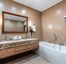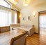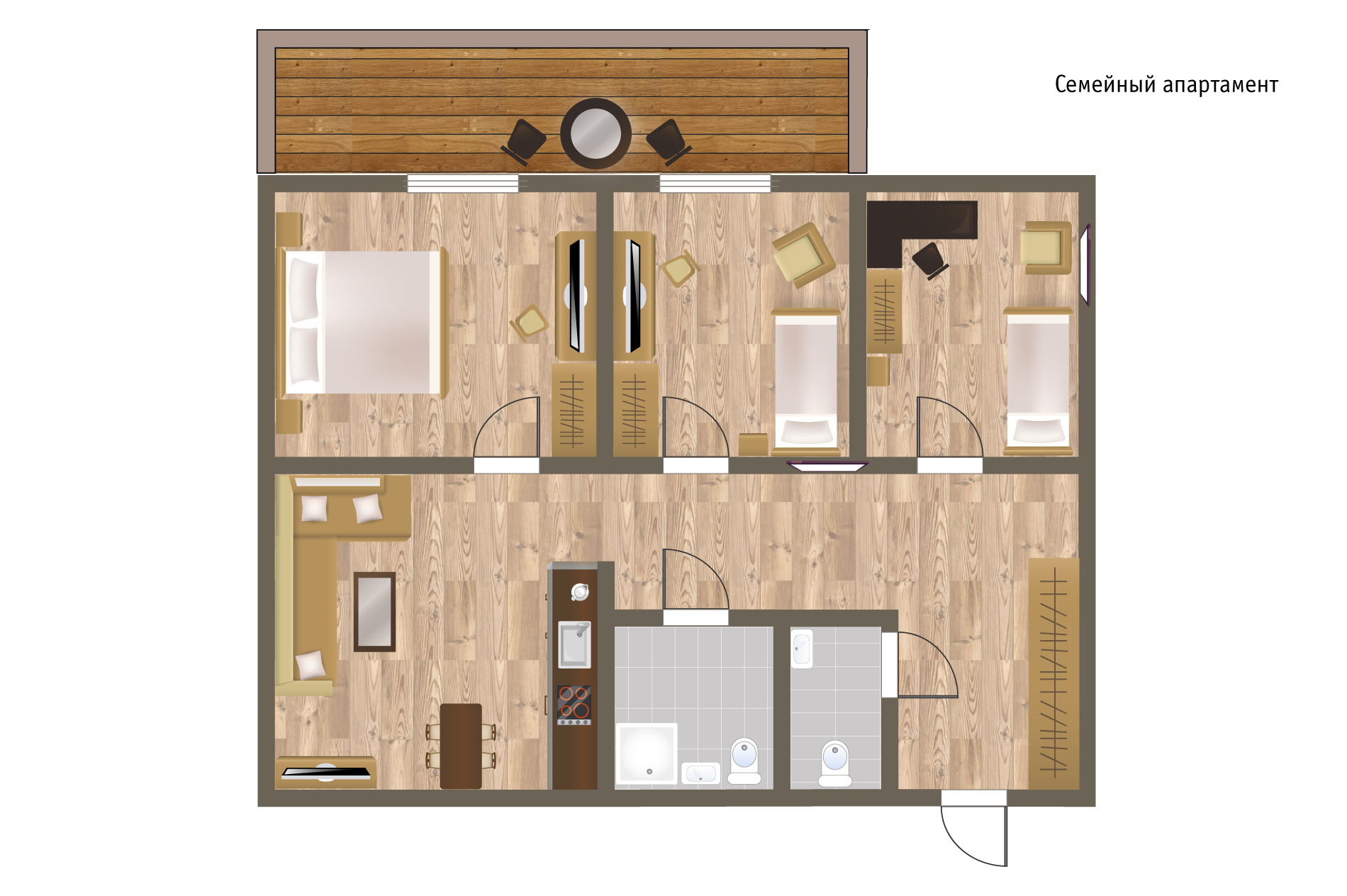 Вид из номера: На горы Покрытие пола: Ламинат Оборудование кухни: Холодильник, посудомоечная машина, электрическая варочная панель, вытяжка, микроволновая печь, посуда Уборка в номере: ежедневно Смена белья: 1 раз в 3 дня Трехкомнатный апартамент с тремя спальнями и гостиной с кухонной зоной. В гостиной кухонный гарнитур, обеденный стол, 4 стула, раскладной диван, журнальный столик и тумба, плазменный LCD-телевизор с возможностью выхода в интернет.<br /> В одной из спален - две раздельные («twin») кровати, во второй и в третьей - одна («single») кровать. Во всех спальнях: шкаф, письменный стол, стул, 2 настенные полки, прикроватная тумбочка у каждой кровати, телефон, сейф, настольная и настенные лампы и плазменный LCD-телевизор с возможностью выхода в интернет. <br /> Трехкомнатные апартаменты оборудованы дополнительным санузлом с унитазом и умывальником.<br /> <br /> "Апартамент Семейный" - номер без дополнительного спального места.<br /> "Апартамент Семейный с доп. местом" - номер с дополнительным спальным местом.  |
