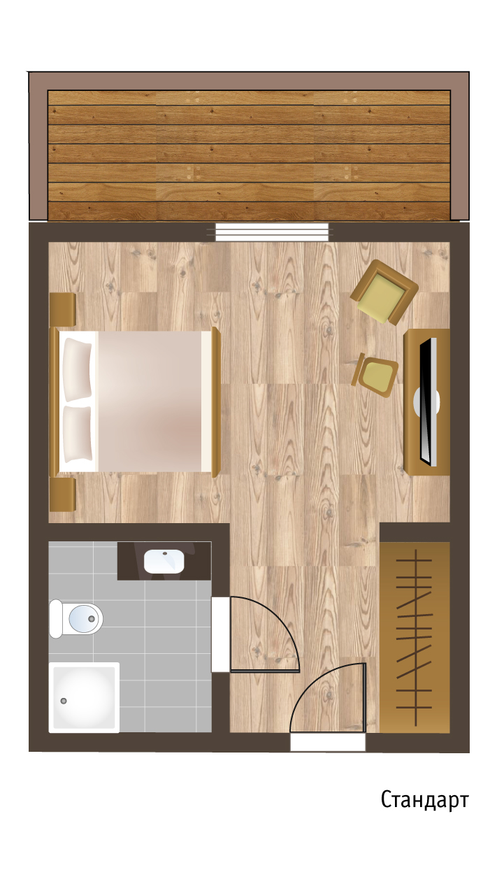 Покрытие пола: Ламинат Уборка в номере: ежедневно Смена белья: 1 раз в 3 дня Дополнительные услуги: Ортопедические матрасы, пледы, махровые салфетки, набор принадлежностей для ванных комнат, комплекты полотенец Площадь номера: 16-18 кв.м.<br /> <br /> Однокомнатный номер состоит из спальни и совмещенной туалетной комнаты с душевой кабиной.<br /> В номере расположены 2 полутороспальные кровати с матрасами-конструкторами, которые при необходимости объединяются в размер Queen size. Интерьер оформлен в традиционном альпийском стиле, в светлых тонах. <br /> В номере есть все необходимое: офисный стол со встроенным мини-баром, стул, 1 мягкое кресло, журнальный стол, 2 прикроватные тумбочки, зеркало, телефон, плазменный LCD-телевизор с возможностью выхода в интернет, классические настольная и напольная лампы.<br /> <br /> Общая терраса. <br /> <br /> "Стандарт с Видом на Горы/ с Террасой" - номер без дополнительного спального места.<br /> "Стандарт с Видом на Горы/ с Террасой с доп местом" - номер с дополнительным спальным местом.  |