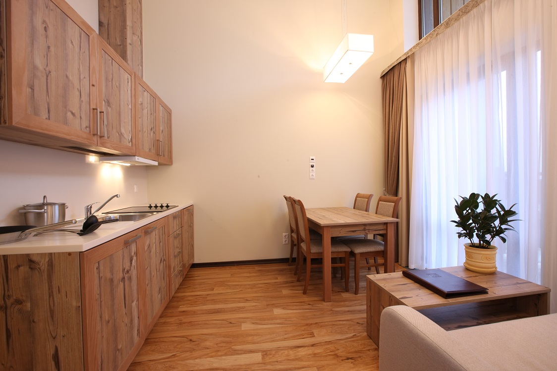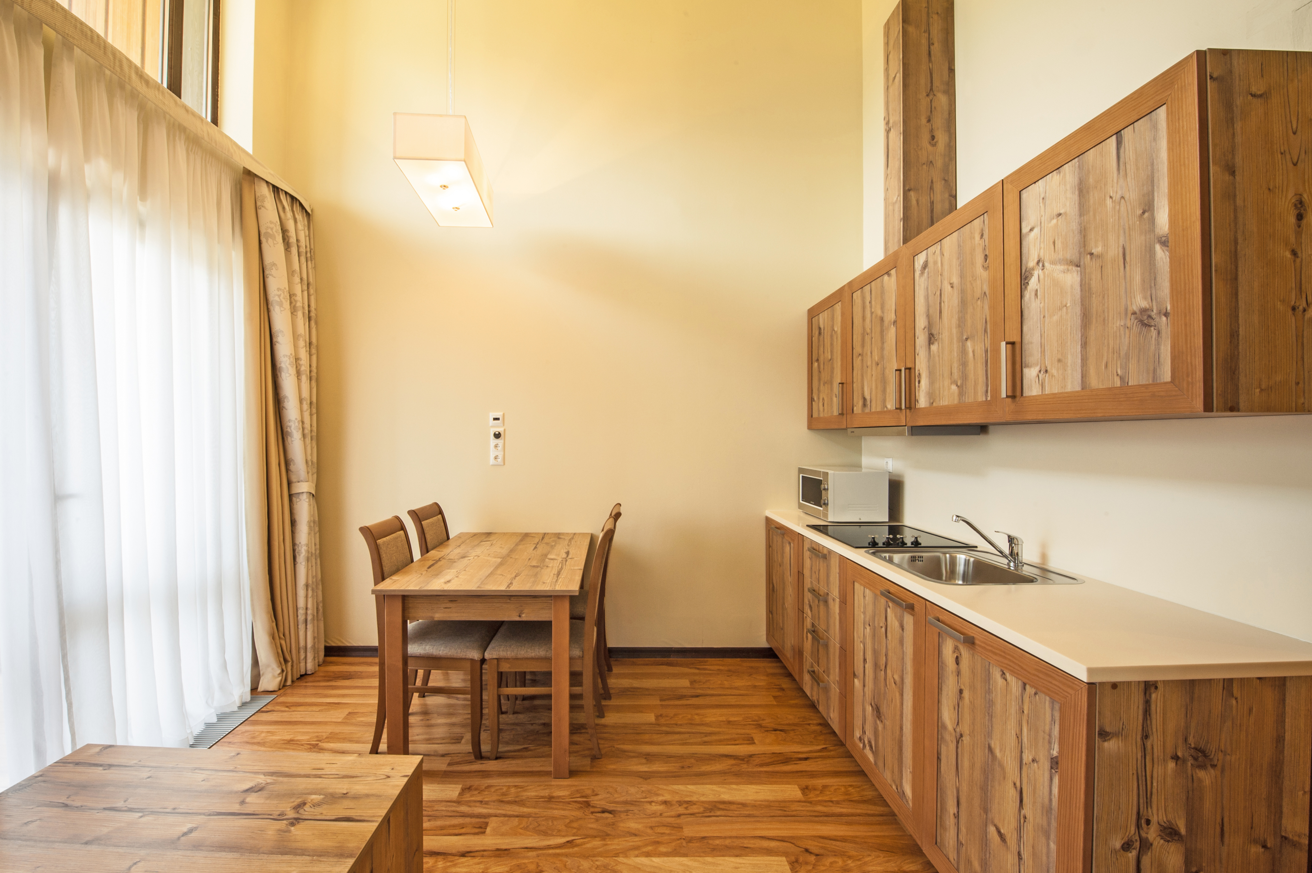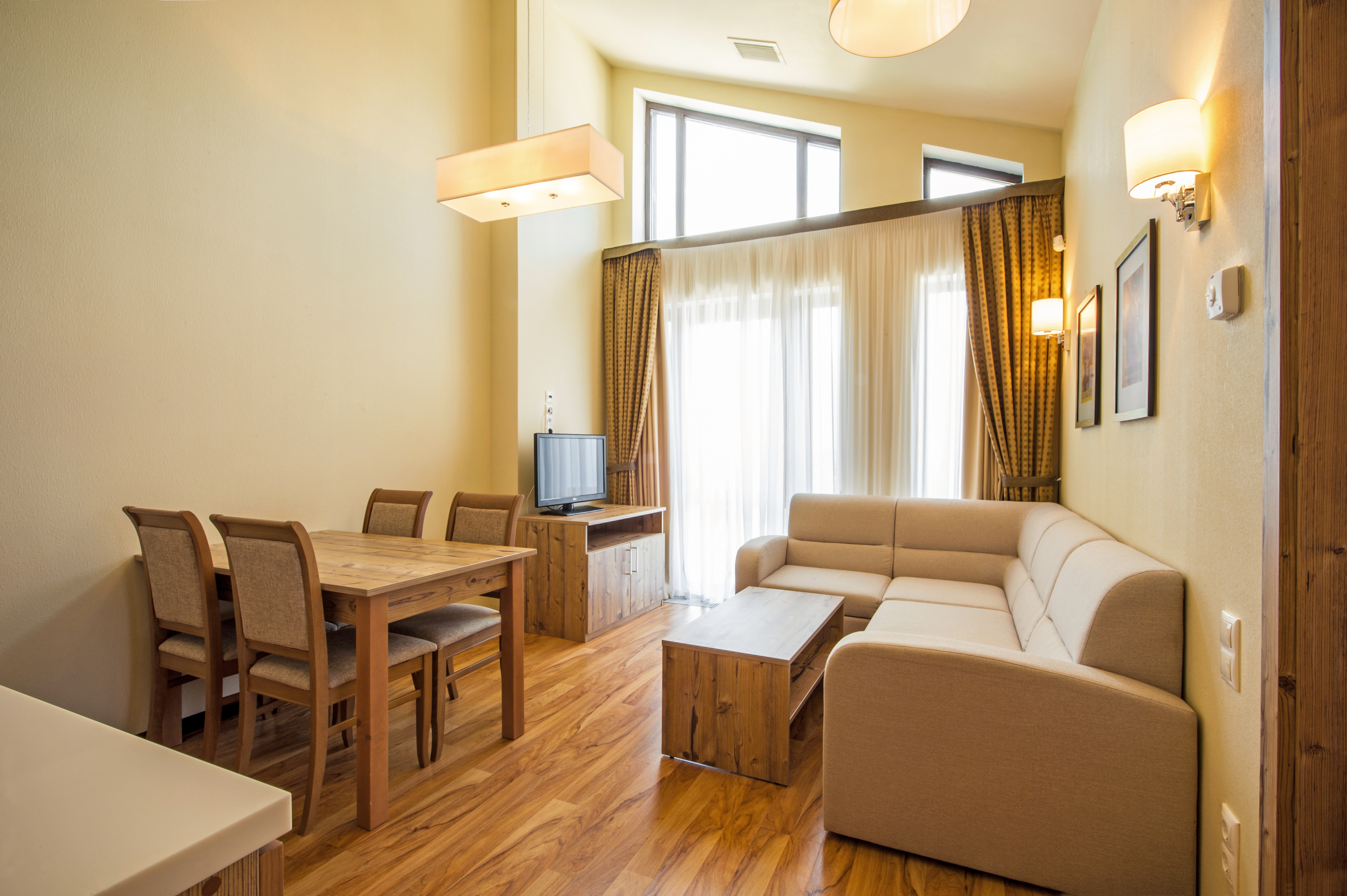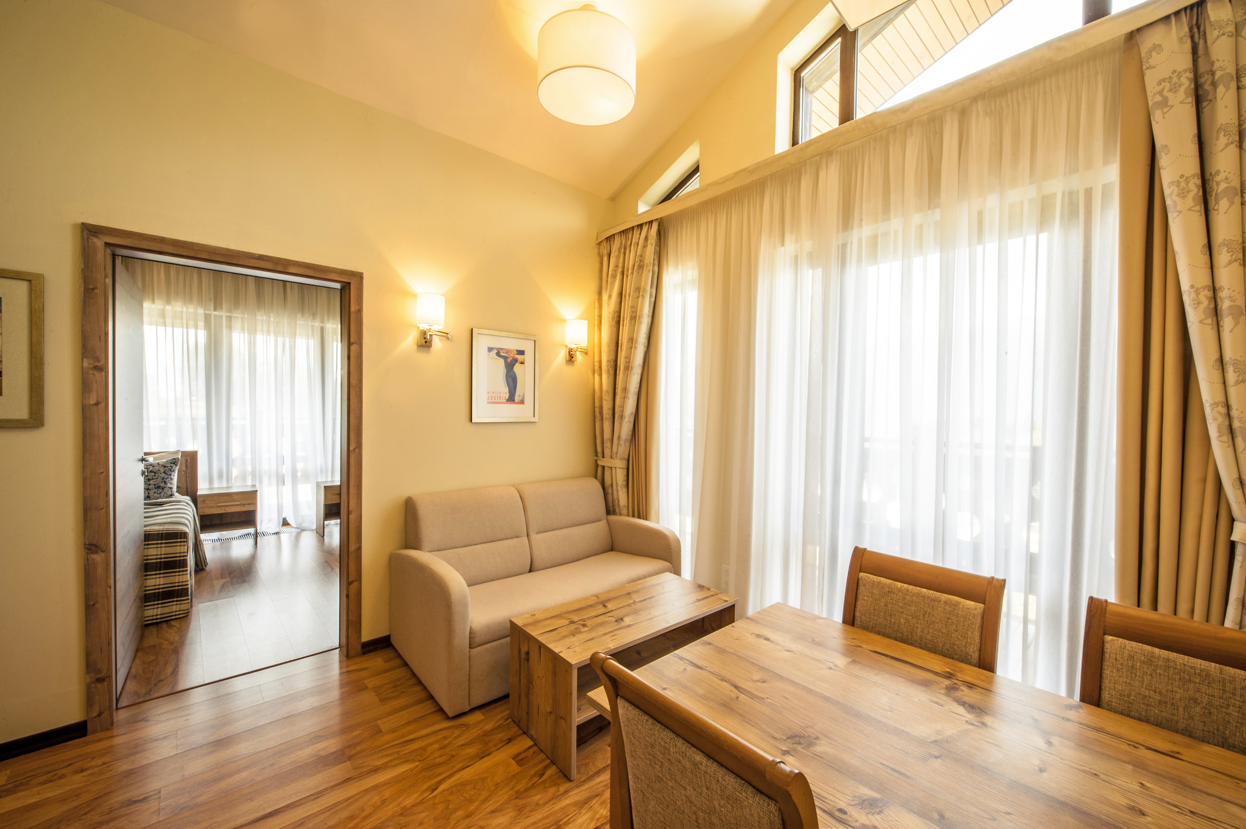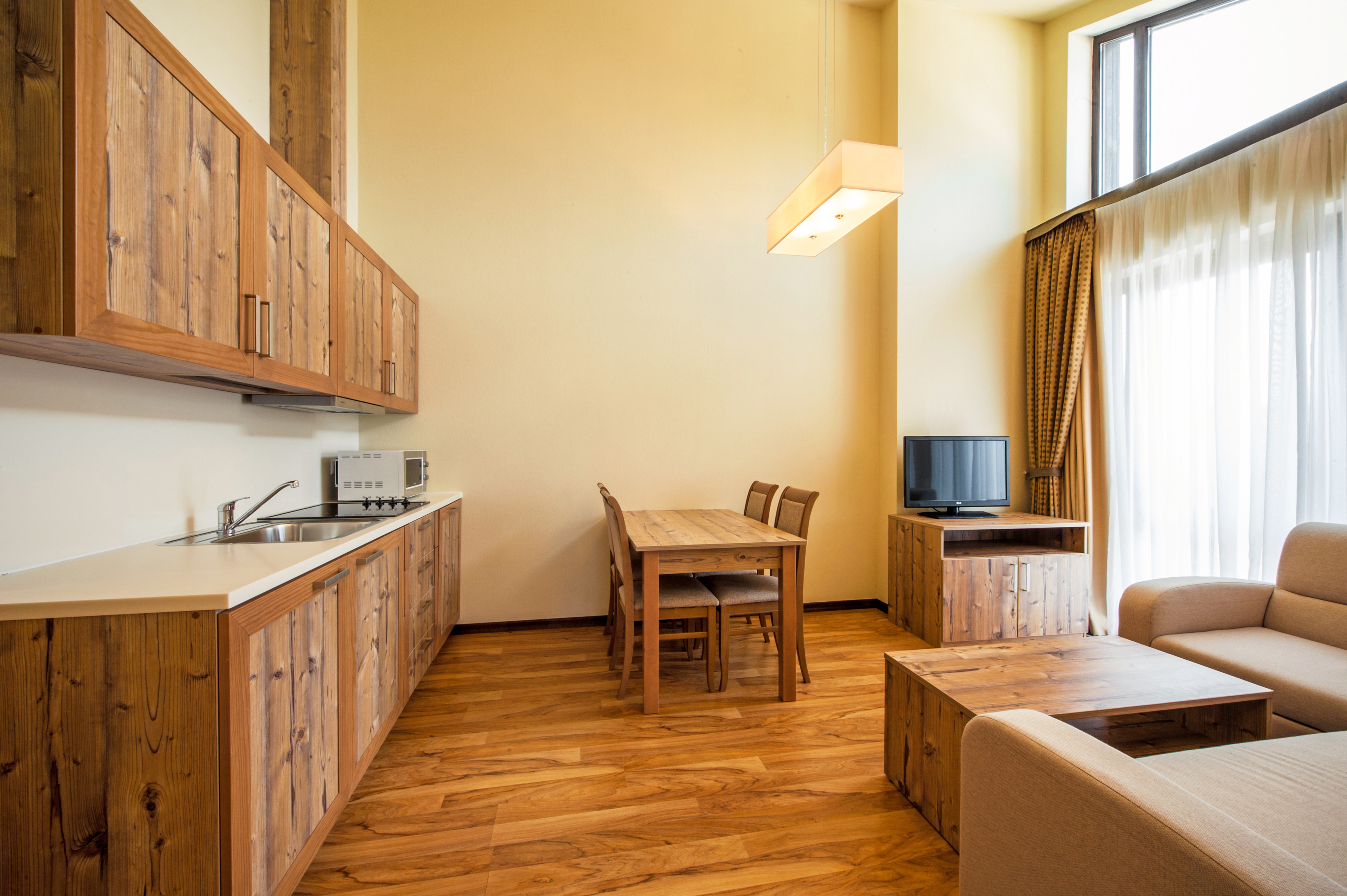 Вид из номера: На горы Покрытие пола: Ламинат Оборудование кухни: посудомоечная машина, электрическая варочная панель, вытяжка, микроволновая печь, посуда Уборка в номере: ежедневно Смена белья: 1 раз в 3 дня Дополнительные услуги: Ортопедические матрасы, пледы, махровые салфетки, набор принадлежностей для ванных комнат, комплекты полотенец Апартамент с 2-мя спальнями и гостиной с кухонной зоной. <br /> В гостиной расположен кухонный гарнитур, обеденный стол, 4 стула, раскладной диван (не во всех номерах раскладывается), журнальный стол и тумба, плазменный LCD-телевизор с возможностью выхода в интернет.<br /> В одной из спален расположены две раздельные («twin») кровати, во второй – две раздельные («twin») или одна («single») кровать. В обеих спальнях находятся шкаф, письменный стол, стул, 2 настенные полки, прикроватная тумбочка у каждой кровати, телефон, сейф, настольная и настенные лампы и плазменный LCD-телевизор с возможностью выхода в интернет.<br /> <br /> "Апартамент с Балконом" - номер без дополнительного спального места.<br /> "Апартамент с Балконом с доп. местом" - номер с дополнительным спальным местом.  |