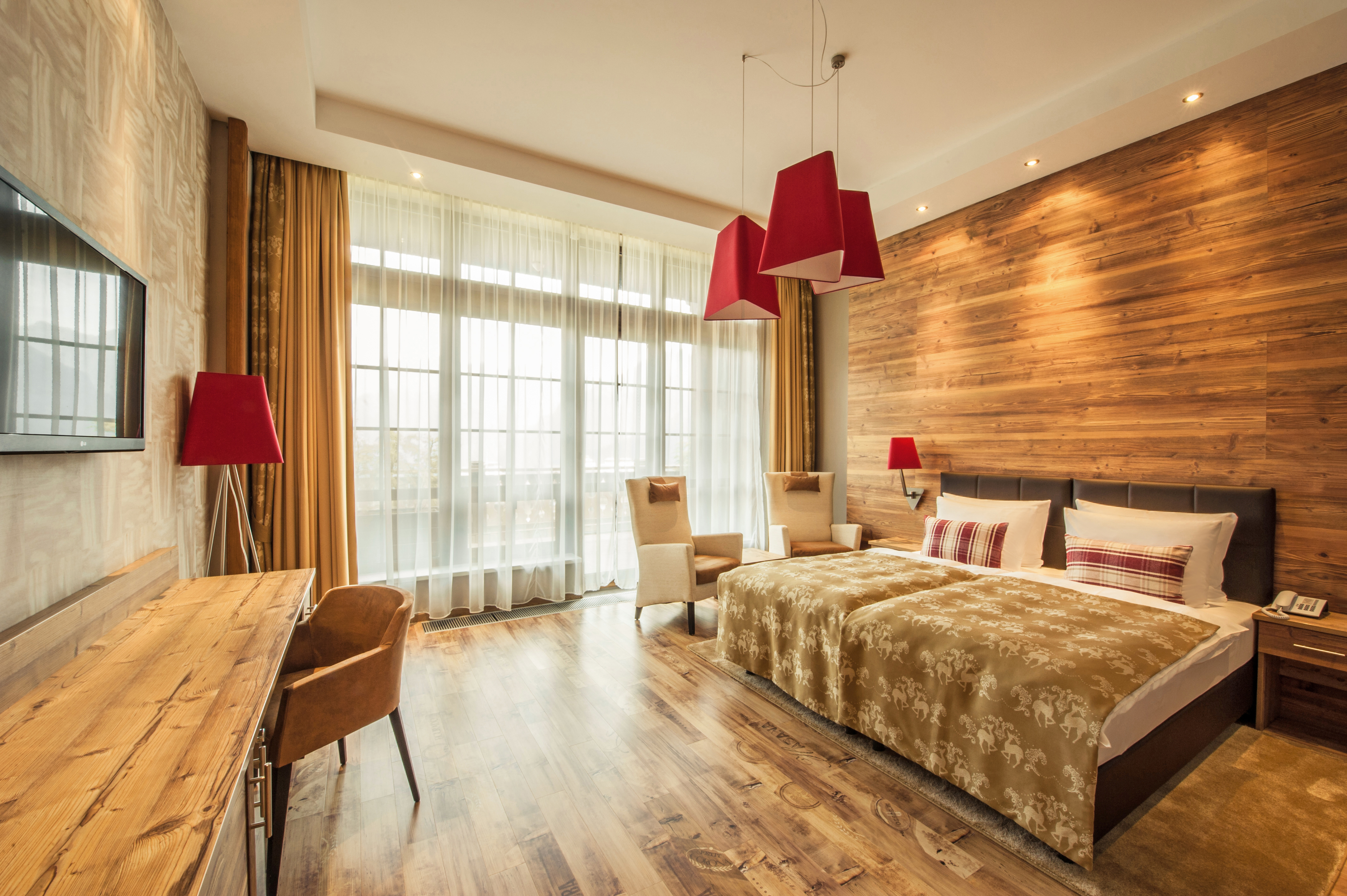 Комментарии: Площадь номера: 16-18 кв.м.<br /> <br /> Однокомнатный номер состоит из спальни и совмещенной туалетной комнаты с душевой кабиной.<br /> В номере расположены 2 полутороспальные кровати с матрасами-конструкторами, которые при необходимости объединяются в размер Queen size. Интерьер оформлен в традиционном альпийском стиле, в светлых тонах. <br /> В номере есть все необходимое: офисный стол со встроенным мини-баром, стул, 1 мягкое кресло, журнальный стол, 2 прикроватные тумбочки, зеркало, телефон, плазменный LCD-телевизор с возможностью выхода в интернет, классические настольная и напольная лампы.<br /> <br /> "Стандарт с Видом на Горы/ Балкон" - номер без дополнительного спального места.<br /> "Стандарт с Видом на Горы/ с Балконом с доп местом" - номер с дополнительным спальным местом.