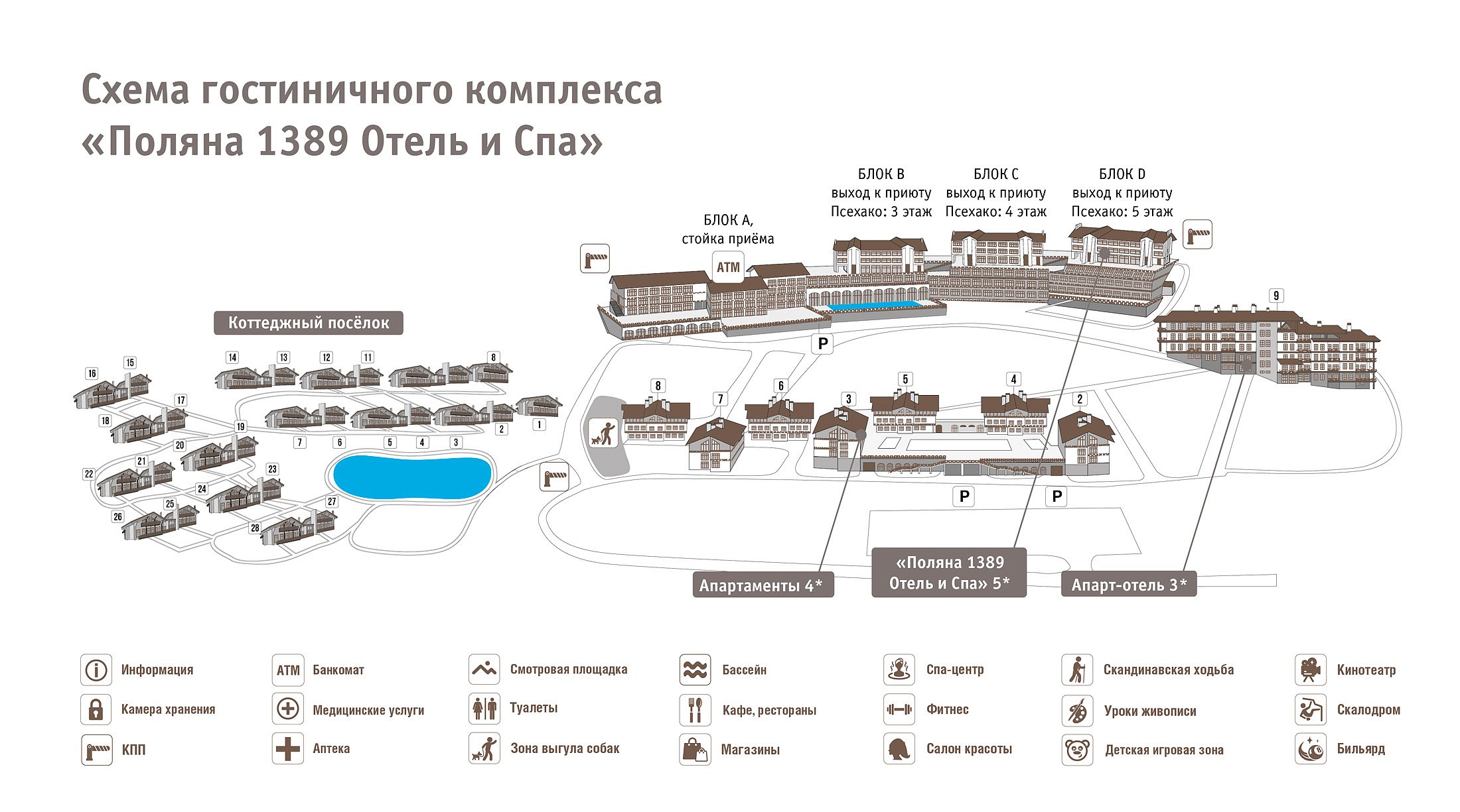 Отель принимает кредитные карты: Master Card, Euro Card Комментарии: Комплекс канатных дорог с горнолыжными трассами мирового уровня.<br /> Пункт проката лыжного оборудования. Торговая галерея.<br /> <br /> Парковка осуществляется на крытой стоянке внутри ГК «Поляна 1389 Отель и Спа».<br /> Оплата за парковку производится Гостем на стойке приема и размещения при заезде.  |
