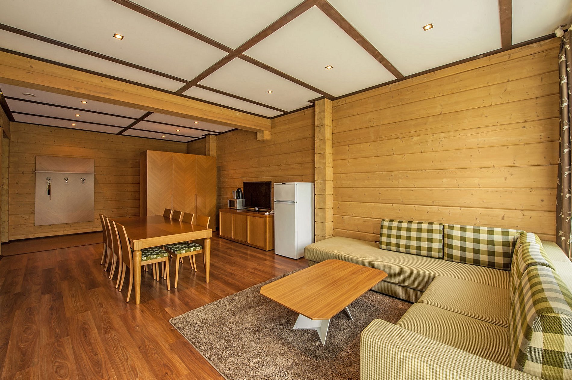 Вид из номера: на горы / на территорию Покрытие пола: Ламинат Оборудование кухни: Холодильник, микроволновая печать, посуда Уборка в номере: ежедневно Смена белья: 1 раз в 3 дня Дополнительные услуги: Стиральная машина, сушка для белья, оборудование для сушки горнолыжных ботинок, кладовая, ортопедические матрасы, пледы, махровые салфетки, набор принадлежностей для ванных комнат, комплекты полотенец Двухэтажный коттедж с 5-ю спальнями, гостиной, кладовой.<br /> <br /> 1 этаж (200 кв. м):<br /> В гостиной находятся обеденный стол, 8 стульев, шкаф для одежды, сейф, электрический чайник, плазменный LCD-телевизор с возможностью выхода в интернет и тумба, холодильник, журнальный стол, диван, гладильная доска и утюг, мягкое кресло, микроволновая печь. <br /> На 1-ом этаже 3 спальни. В каждой спальне – две раздельные («twin») кровати, 2 прикроватных тумбочки, письменный стол, стул, шкаф для одежды, деревянная панель с крючками и полкой для верхней одежды, полки для обуви, зеркало, 2 мягких кресла, журнальный стол, настольные лампы. Все спальни оборудованы телефонами и плазменными LCD-телевизорами с возможностью выхода в интернет. <br /> По периметру 1-го этажа проходит терраса с выходом из всех 3-х спален и гостиной.<br /> <br /> 2 этаж (150 кв.м): <br /> На верхней лестничной площадке - небольшая зона отдыха: два кресла и кофейный столик, настенная лампа.<br /> На 2-ом этаже находятся 2 спальни с ареалом гостиной. В каждой спальне – две раздельные («twin») кровати, 2 прикроватных тумбочки, письменный стол, стул, шкаф для одежды, зеркало, журнальный стол, диван, настольные лампы, 2 мягких кресла. Все спальни оборудованы телефонами и плазменными LCD-телевизорами с возможностью выхода в интернет.<br /> По периметру 2-го этажа проходит балкон с выходом из обеих спален.<br /> <br /> Ванные комнаты во всех 5-ти спальнях – умывальник, унитаз, душевая кабина. Имеется фен, розетка с напряжением 220 V, настенное зеркало, полотенцесушитель. Ванная комната отделана кафелем, пол с подогревом. В одной из спален на 1-ом этаже вместо душевой кабины установлена классическая ванна. В некоторых спальнях санузел расположен отдельно от ванной комнаты, дополнен умывальником.<br /> <br /> "Коттедж" - номер без дополнительного спального места.<br /> "Коттедж с доп. местом" - номер с дополнительным спальным местом.  |