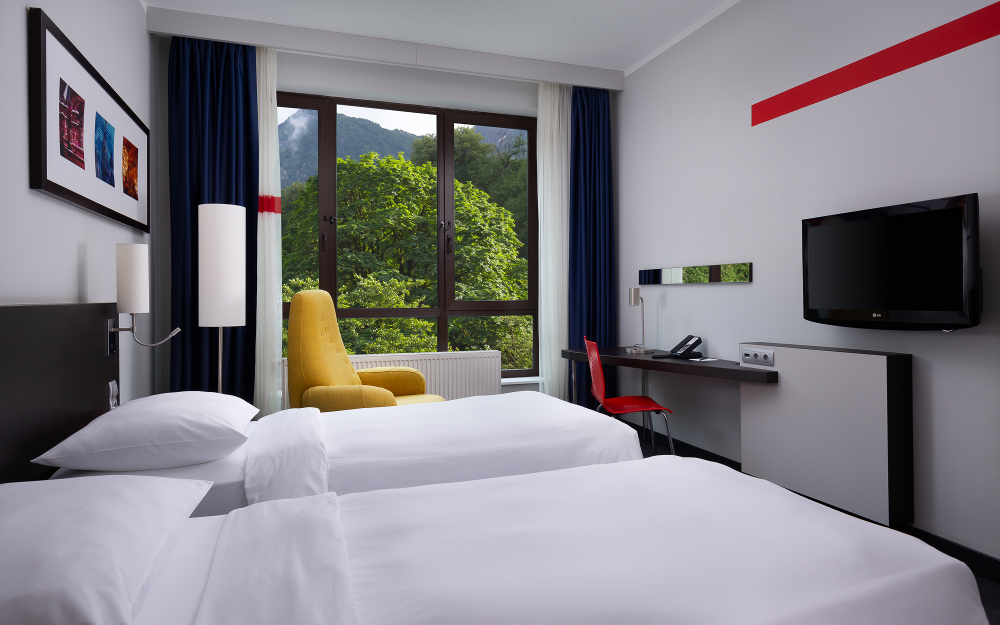 Расположение номера: в основном здании Вид из номера: на набережную реки/на горы Покрытие пола: Ковролин Оборудование кухни: Мини-холодильник (бесплатно). Уборка в номере: ежедневно Смена белья: 1 раз в 3 дня В номере: тапочки, принадлежности для приготовления чая/кофе, сейф, мини-бар по требованию, увеличительное зеркало, фен, тропический душ, ЖК-телевизор, бесплатная вода, бесплатный Wi-Fi.<br /> <br /> "Стандарт": номер без дополнительного спального места.<br /> "Стандарт с доп. местом": номер с дополнительным спальным местом.<br /> Максимальное количество гостей – 2+1 человек, есть возможность дополнительно установить раскладную кровать.  |