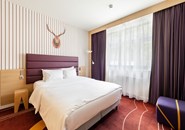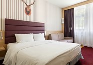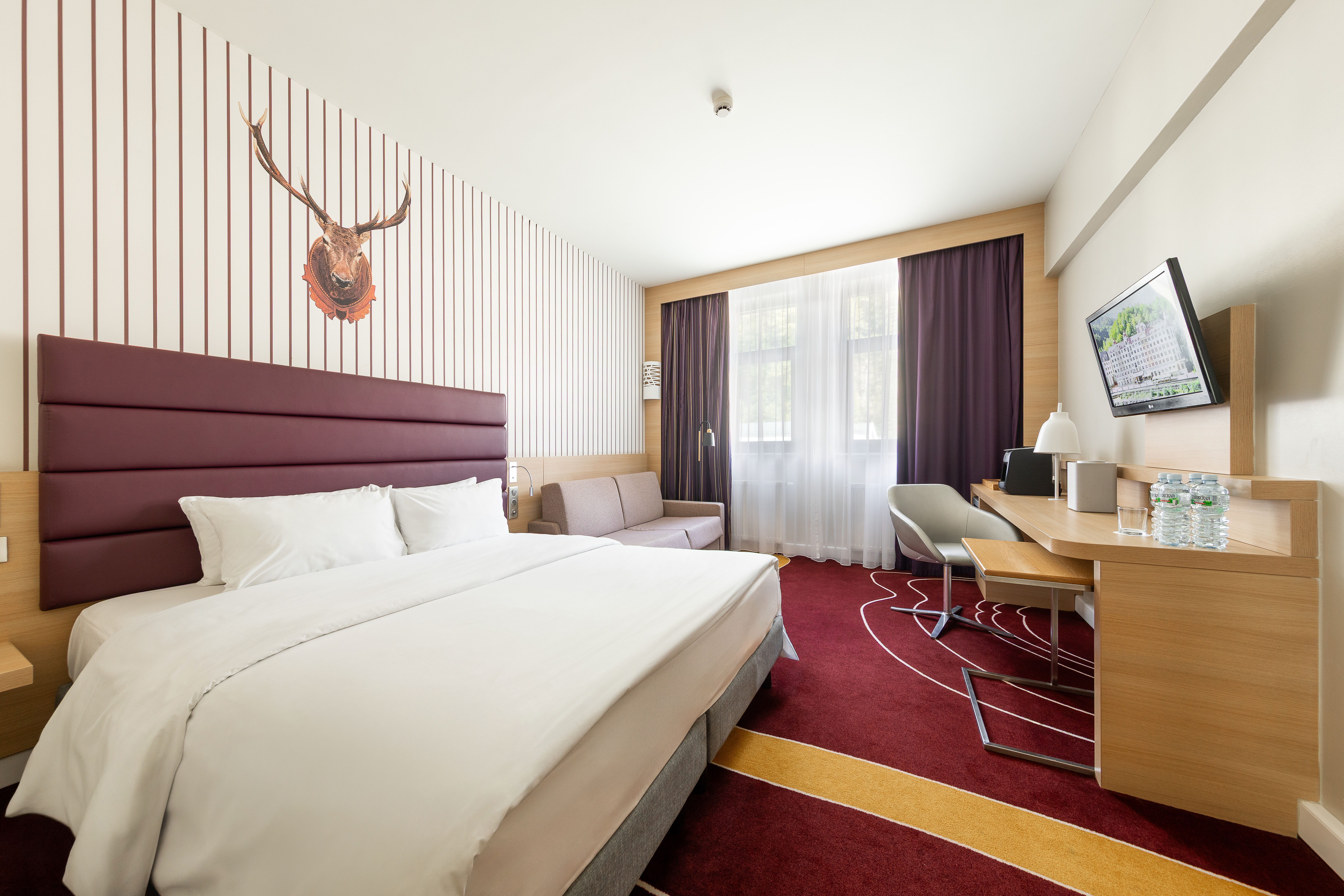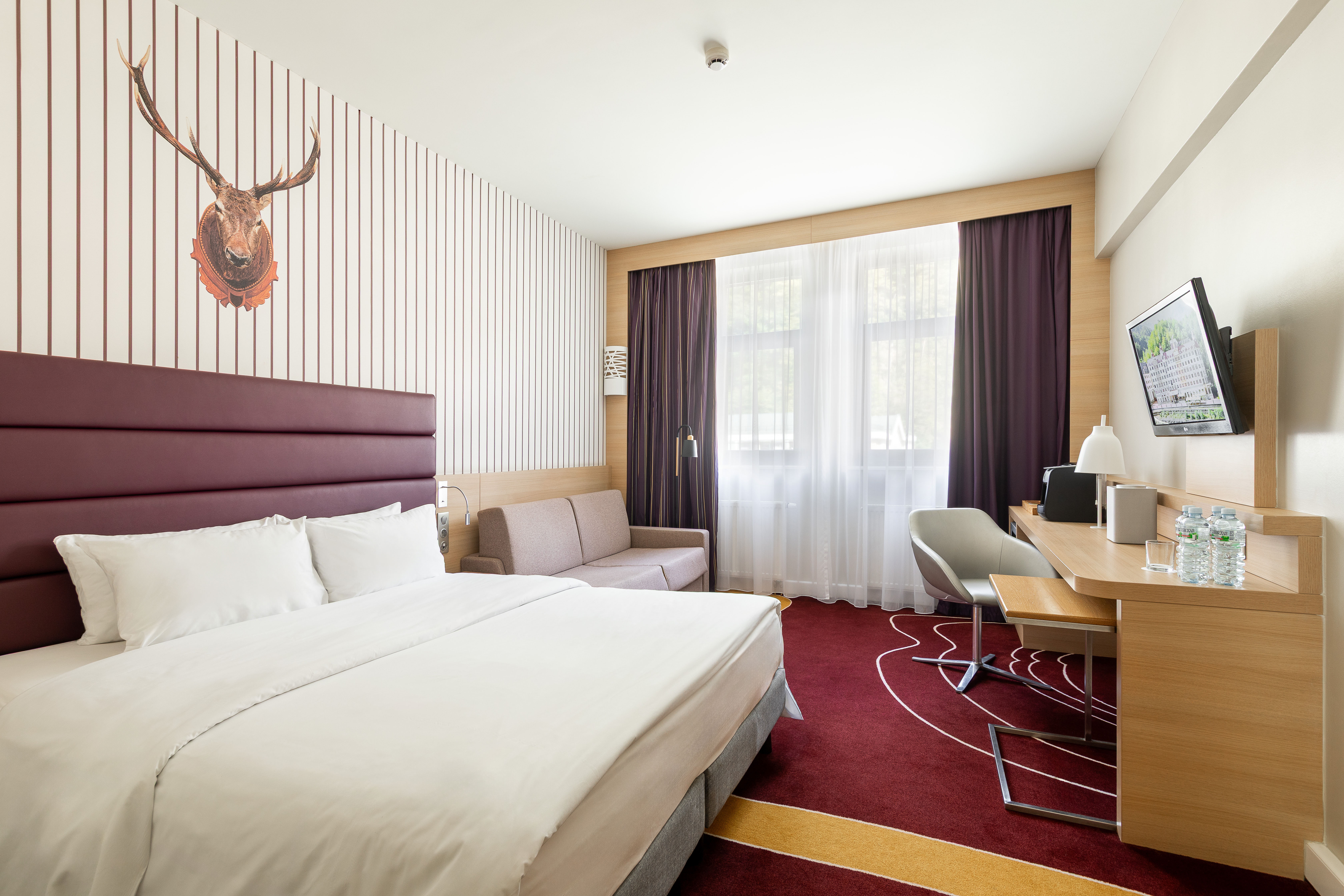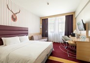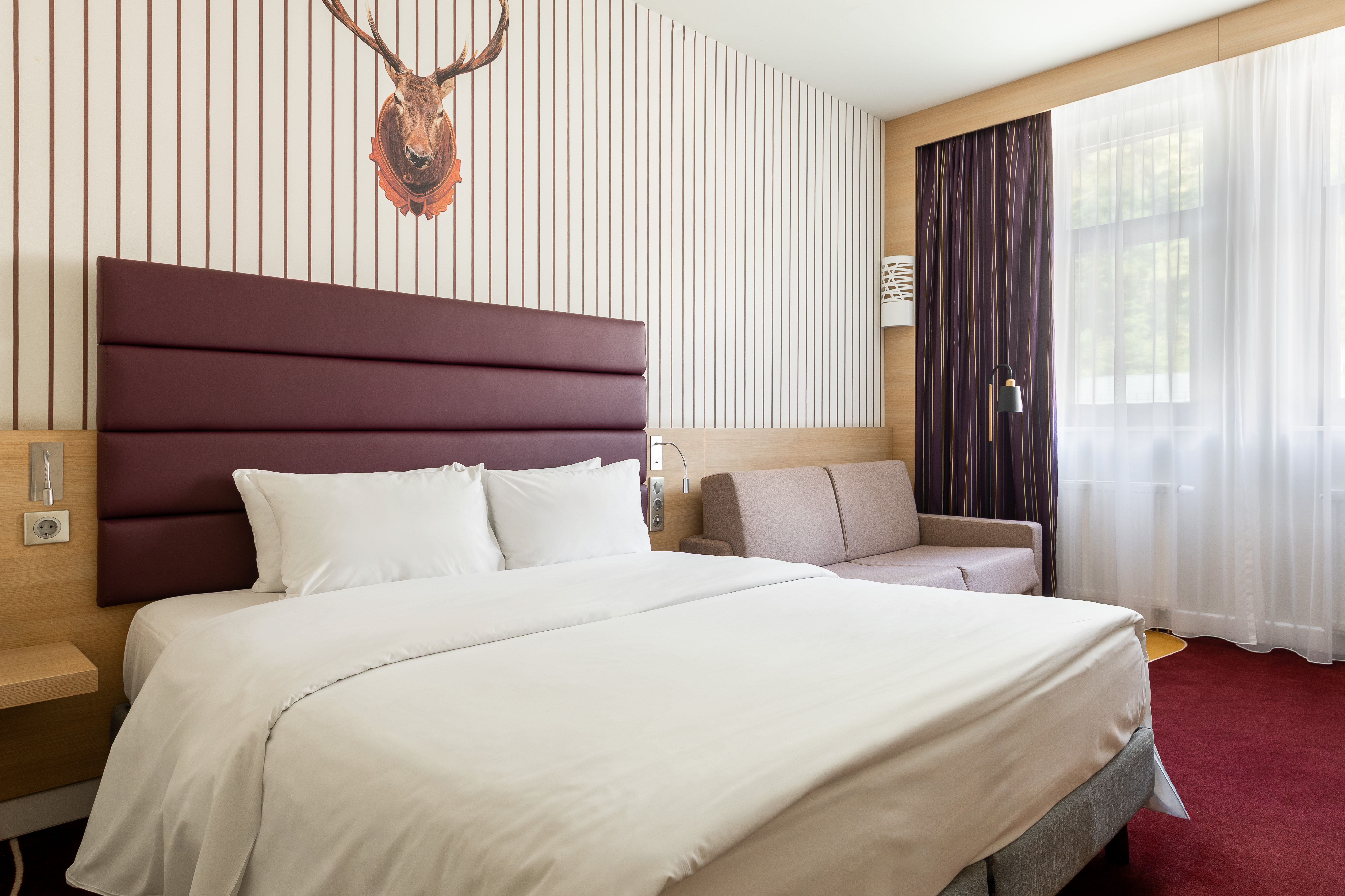 Расположение номера: в основном здании Вид из номера: на лес Покрытие пола: Ковролин Номера категории «Стандарт» – это номера с видом на лес, площадью 24 кв.м., комфортабельные, наполненные уютом. <br /> Номера оснащены одной двуспальной кроватью (160*200 см), раскладывающейся софой (140*200 см), рабочей зоной, ванной или душевой кабиной. <br /> Оснащение: мини-бар, набор для приготовления кофе и чая, система климат-контроля, светонепроницаемые шторы, гладильная станция с утюгом, телевизор, сейф, набор полотенец, халат, тропический душ, ванные принадлежности, тапочки, фен, Wi-Fi, телефон.<br /> <br /> "Стандарт": номер без дополнительного спального места.<br /> "Стандарт с доп. местом": номер с дополнительным спальным местом.  |