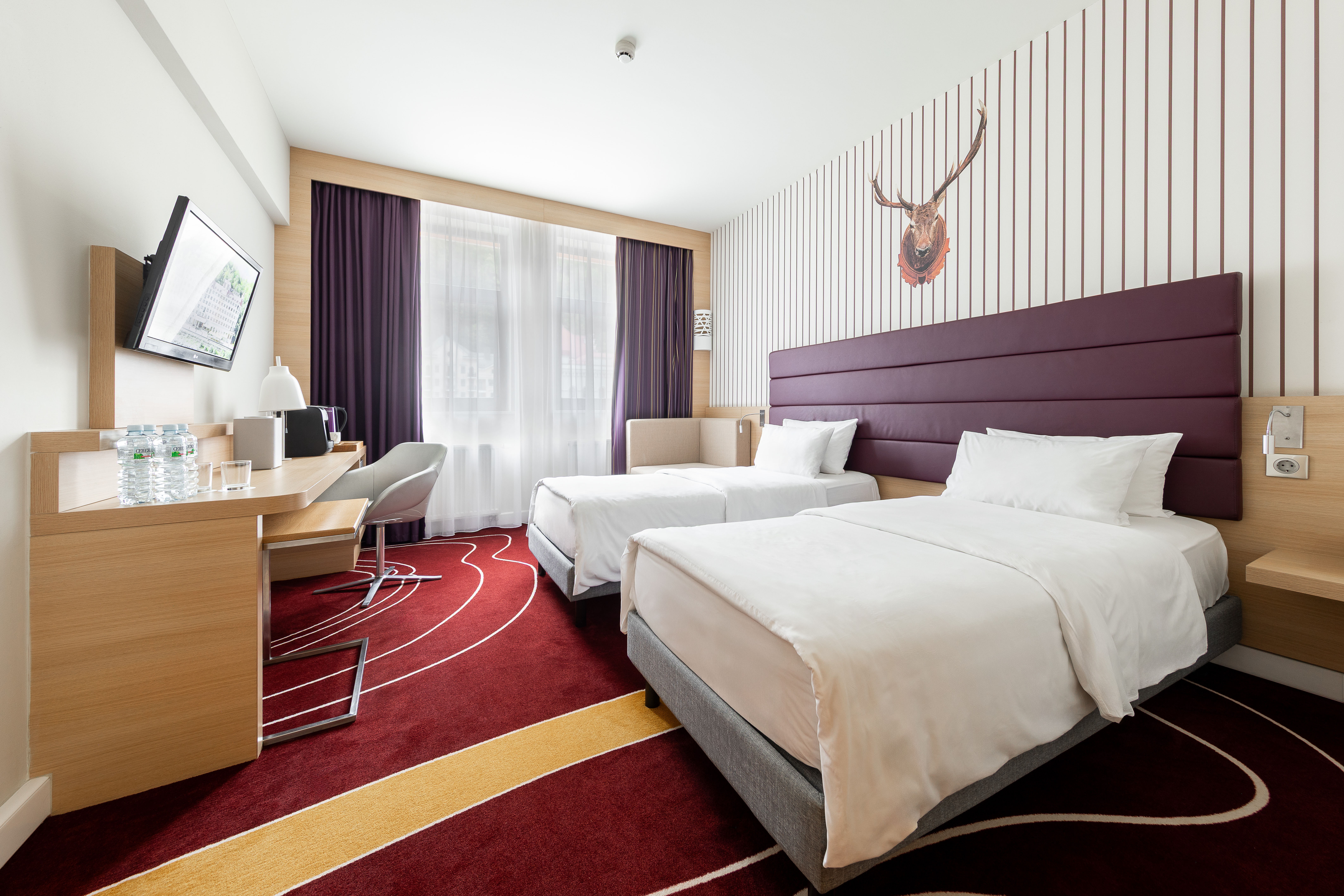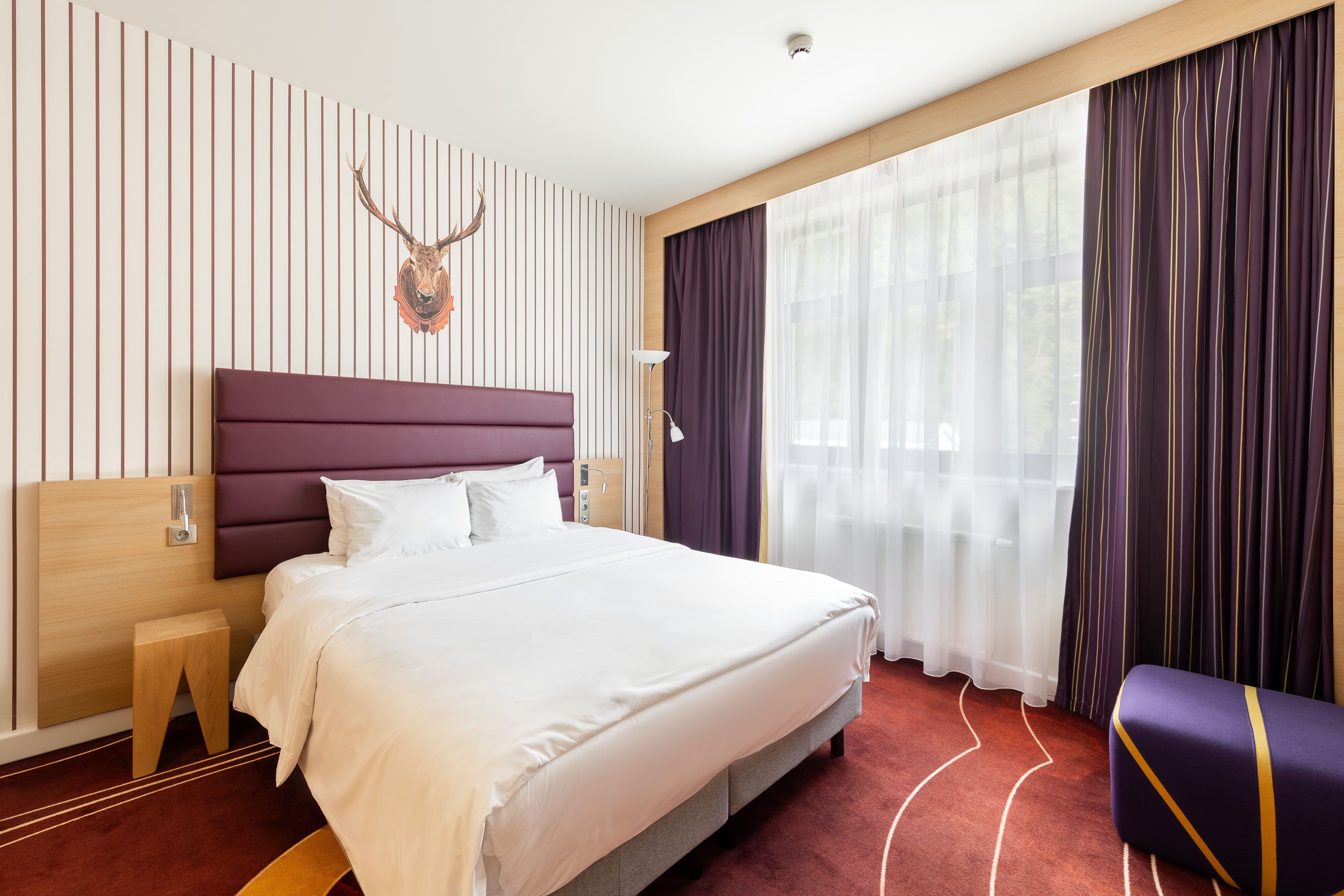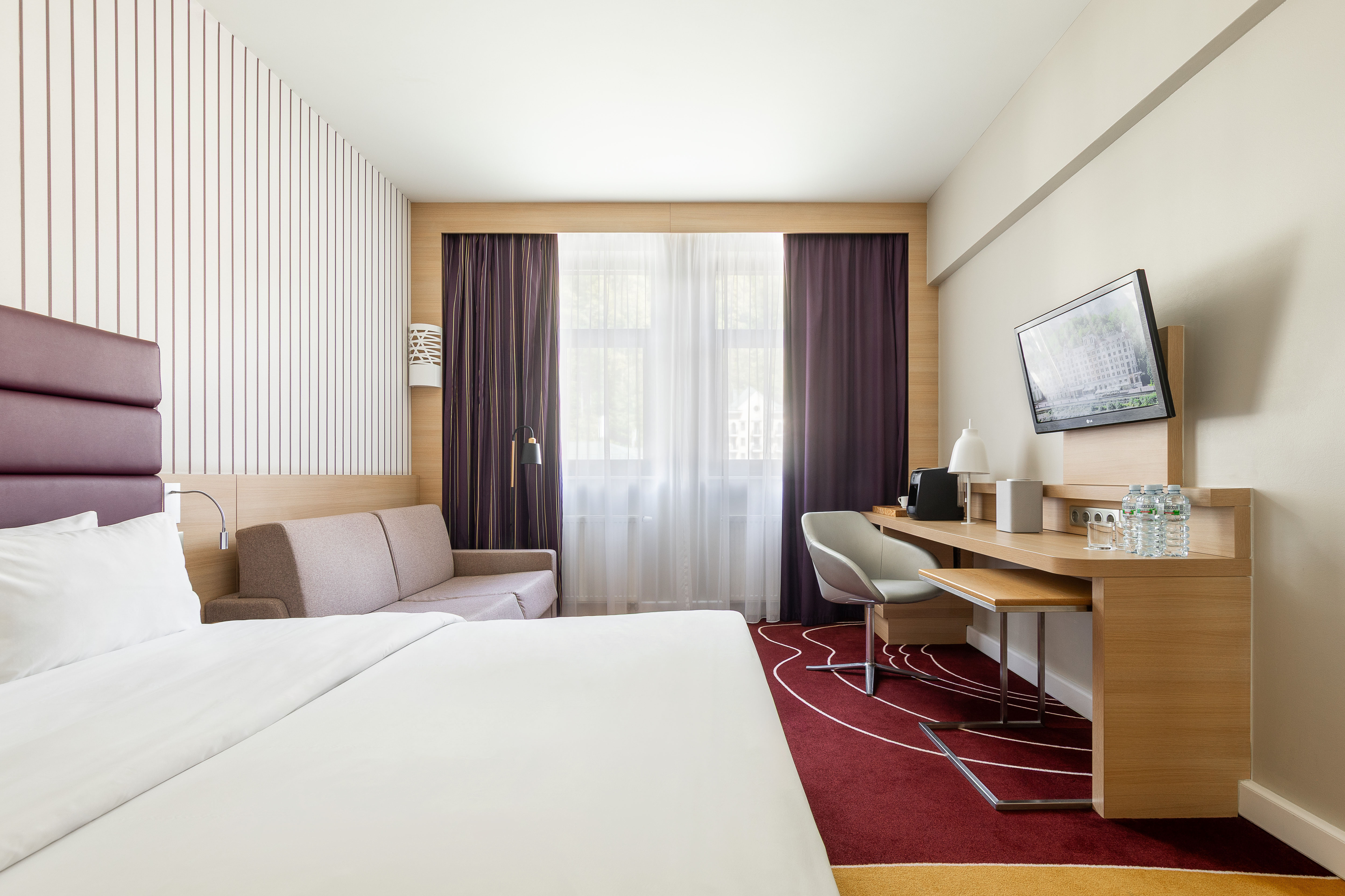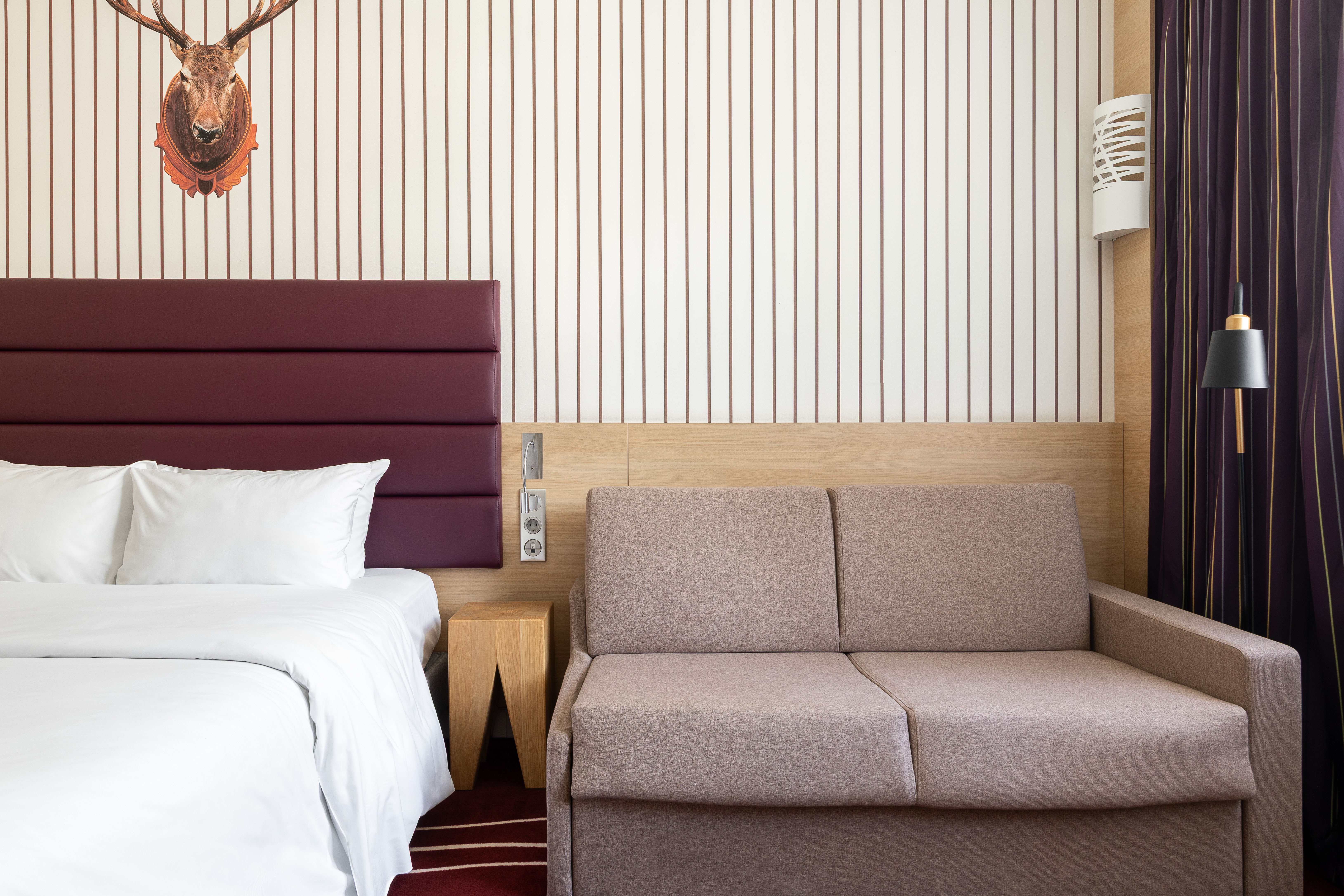 Расположение номера: в основном здании Вид из номера: на лес Покрытие пола: Ковролин Номера категории «Стандарт» – это номера с видом на лес, площадью 24 кв.м., комфортабельные, наполненные уютом. <br /> Номера оснащены одной двуспальной кроватью (160*200 см), раскладывающейся софой (140*200 см), рабочей зоной, ванной или душевой кабиной. <br /> Оснащение: мини-бар, набор для приготовления кофе и чая, система климат-контроля, светонепроницаемые шторы, гладильная станция с утюгом, телевизор, сейф, набор полотенец, халат, тропический душ, ванные принадлежности, тапочки, фен, Wi-Fi, телефон.<br /> <br /> "Стандарт": номер без дополнительного спального места.<br /> "Стандарт с доп. местом": номер с дополнительным спальным местом.  |
