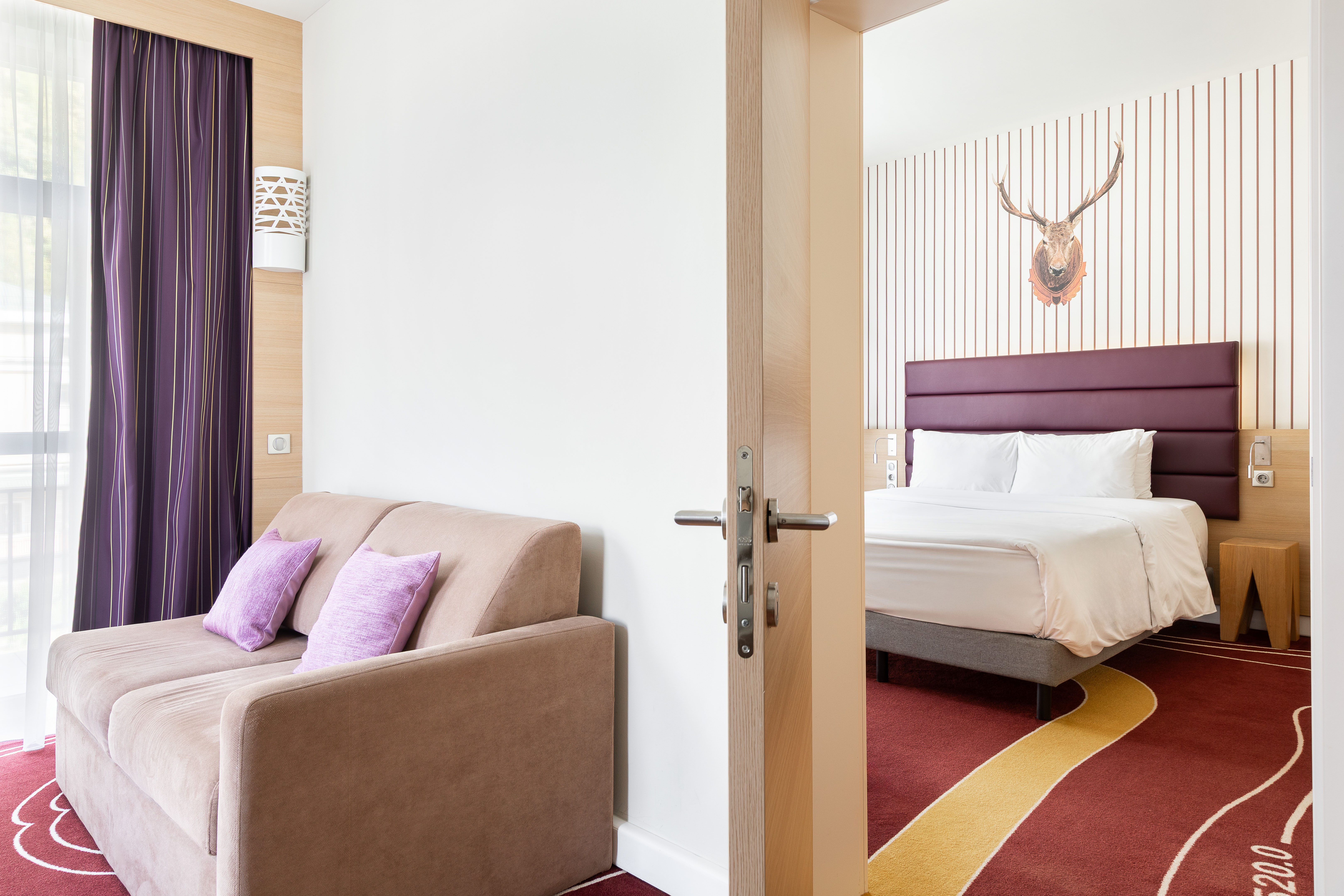 Комментарии: Номера категории Люкс - просторные, элегантные, выполненные в теплых тонах, обладают площадью 48 кв. м. и идеально подойдут для семейного отдыха. <br /> Номера очень функционально разделены на две комнаты, в одной из которых расположена двуспальная кровать, а во второй обеденная зона и раскладывающаяся софа (140*200 см). <br /> Из номеров открывается красивый вид на реку или лес. <br /> Оснащение: мини-бар с безалкогольными напитками и снеками, включенными в стоимость номера, набор для приготовления кофе и чая, капсульная кофемашина, система климат-контроля, светонепроницаемые шторы, гладильная станция с утюгом, телевизор, сейф, набор полотенец, халат, тропический душ, ванные принадлежности, тапочки, фен, расширенный ассортимент фирменной косметики, Wi-Fi, телефон.<br /> <br /> "Люкс": номер без дополнительного спального места.<br /> "Люкс с доп. местом": номер с дополнительным спальным местом.