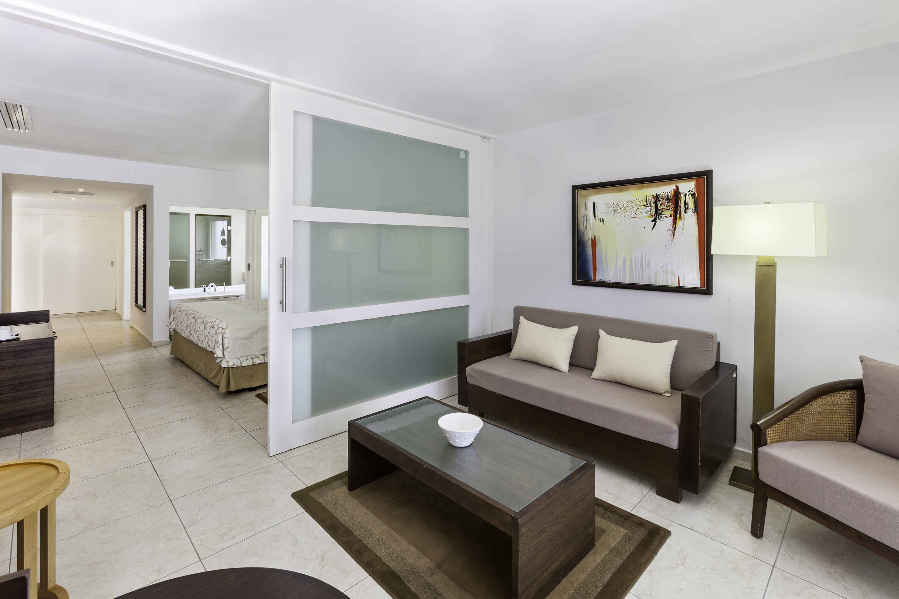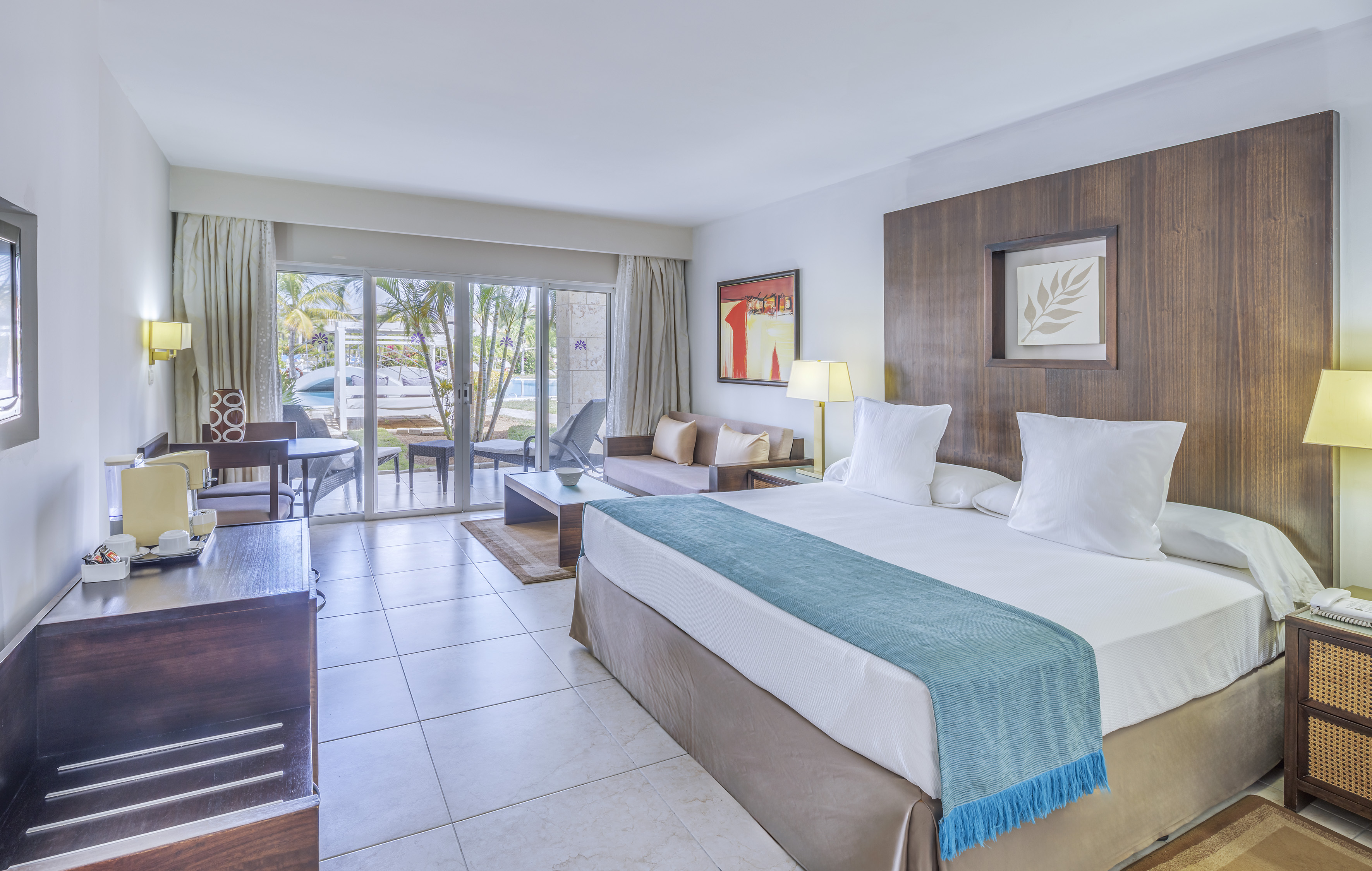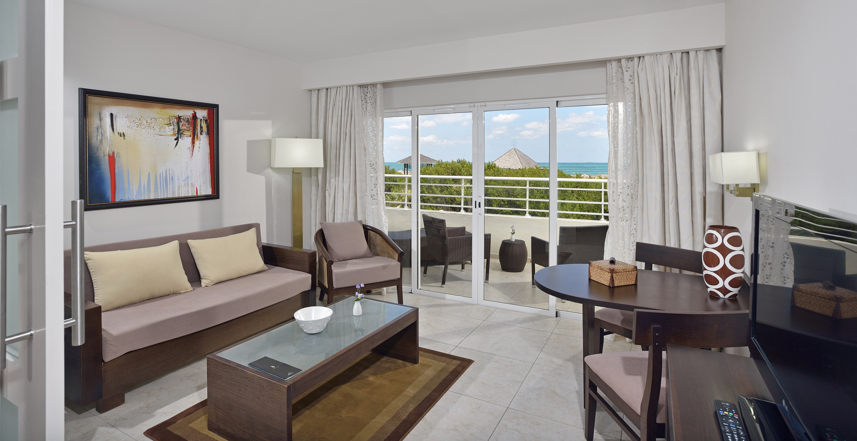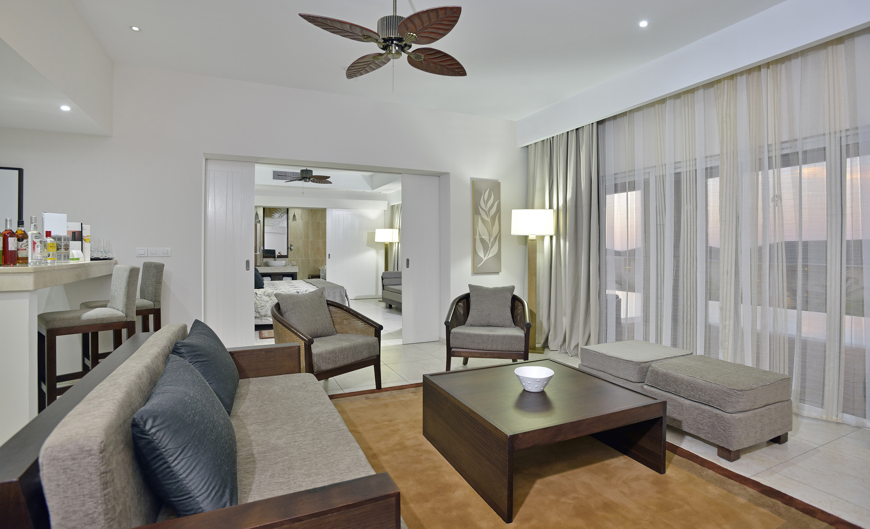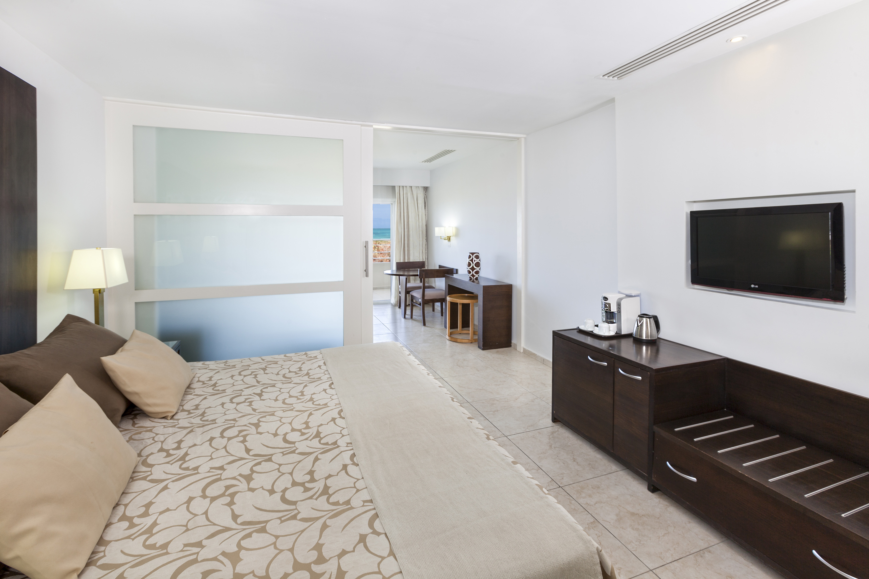 Вид из номера: на океан Наполнение мини-бара: Безалкогольные напитки, пиво, чай, кофе, сок, тоник и бар класса Премиум Уборка в номере: ежедневно Смена белья: 2 раза в неделю Спальня с зоной гостиной. 1 кровать king size или 2 односпальные кровати. Кондиционер. Зеркало. Зонт. <br /> Дополнительный услуги: Халат и тапочки. Соль для ванны. Полотенце для бассейна / пляжа. Выбор подушек. VIP мини-бар. |