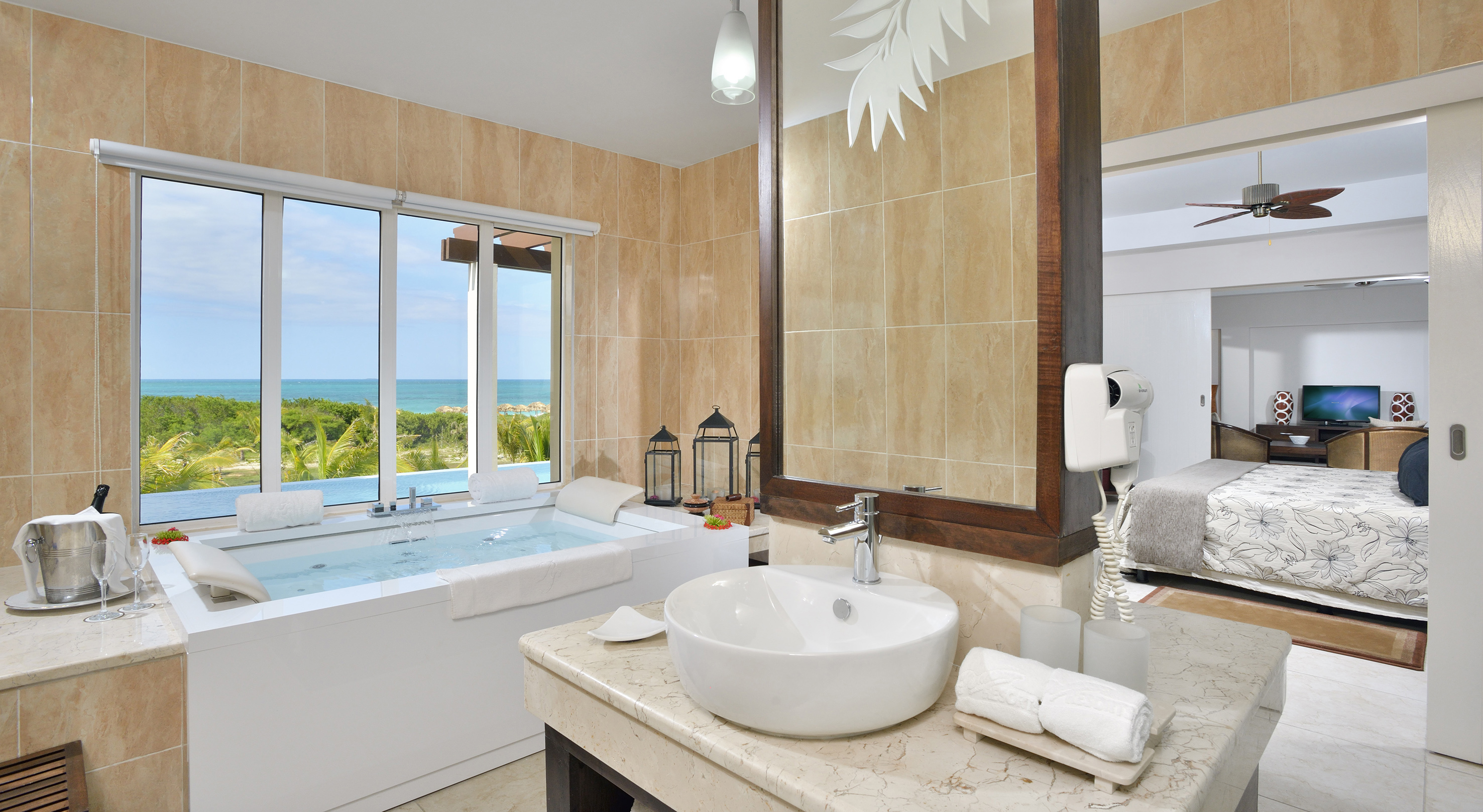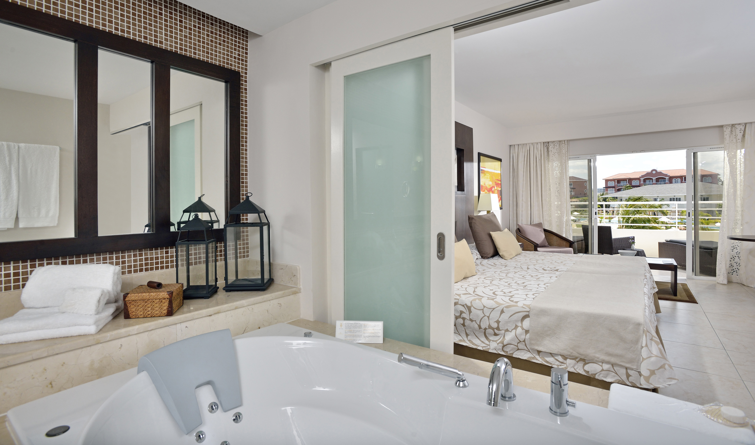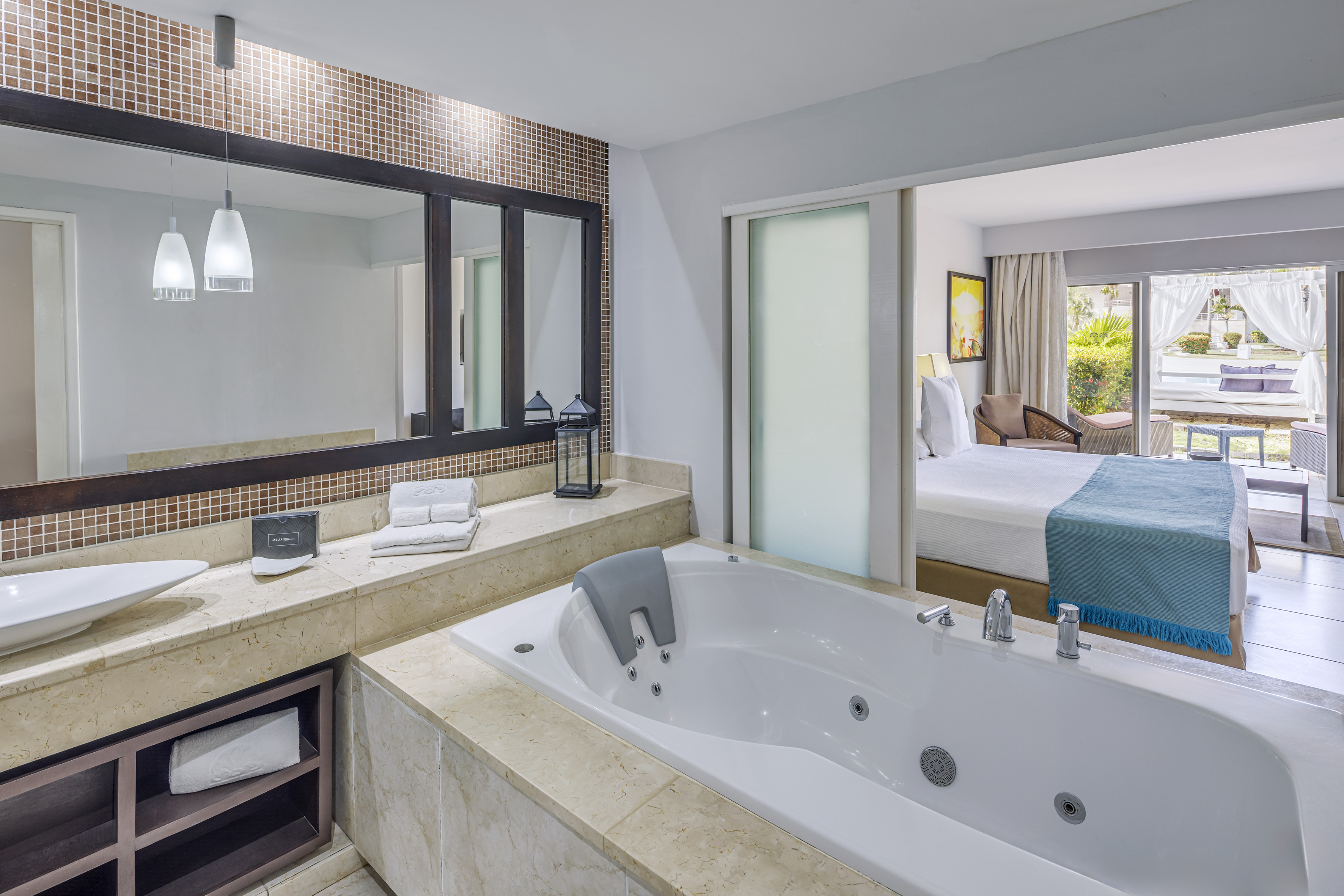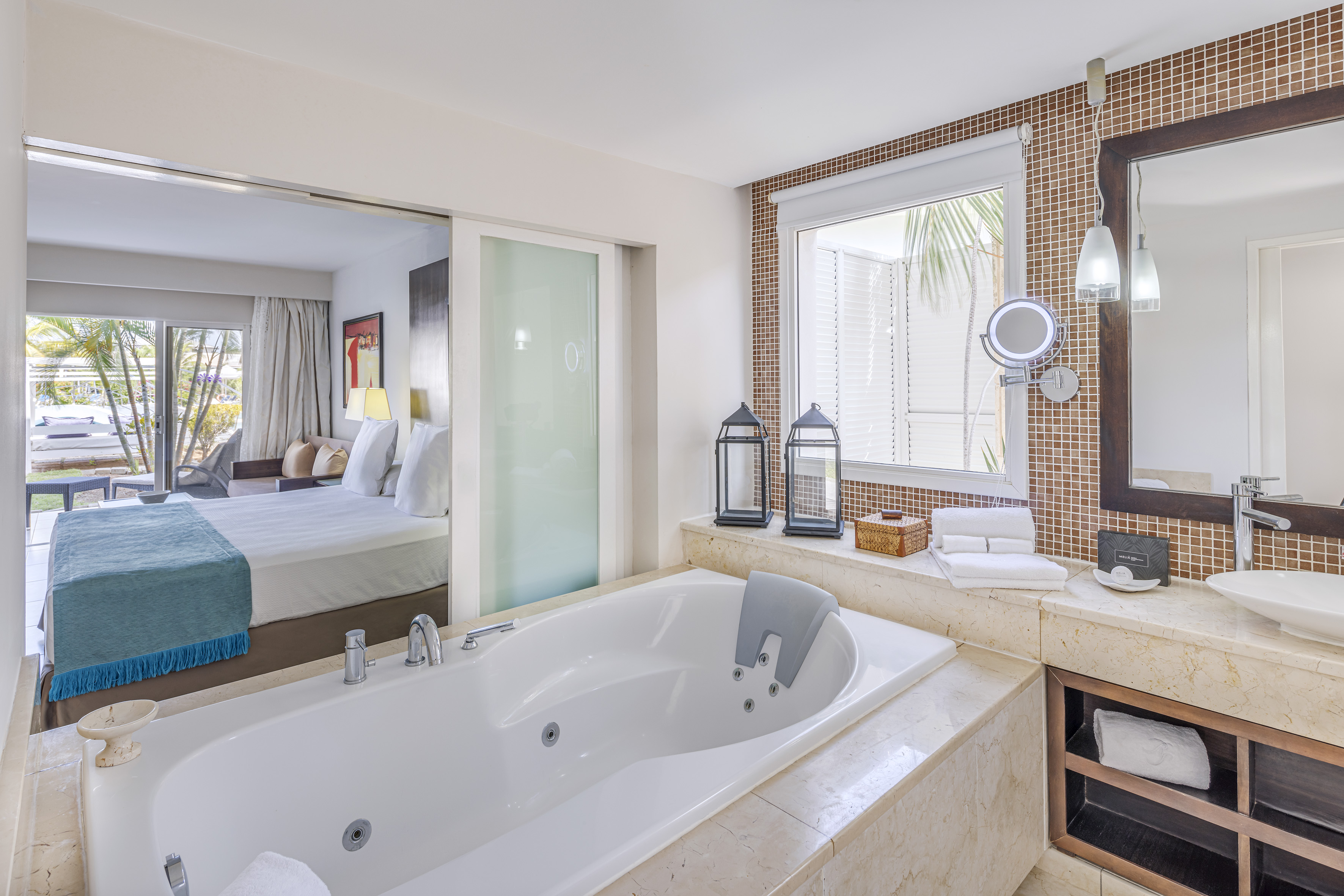 Вид из номера: на океан Наполнение мини-бара: Безалкогольные напитки, пиво, чай, кофе, сок, тоник и бар класса Премиум Уборка в номере: ежедневно Смена белья: 2 раза в неделю Спальня с зоной гостиной. 1 кровать king size или 2 односпальные кровати. Кондиционер. Зеркало. Зонт. <br /> Дополнительный услуги: Халат и тапочки. Соль для ванны. Полотенце для бассейна / пляжа. Выбор подушек. VIP мини-бар. |